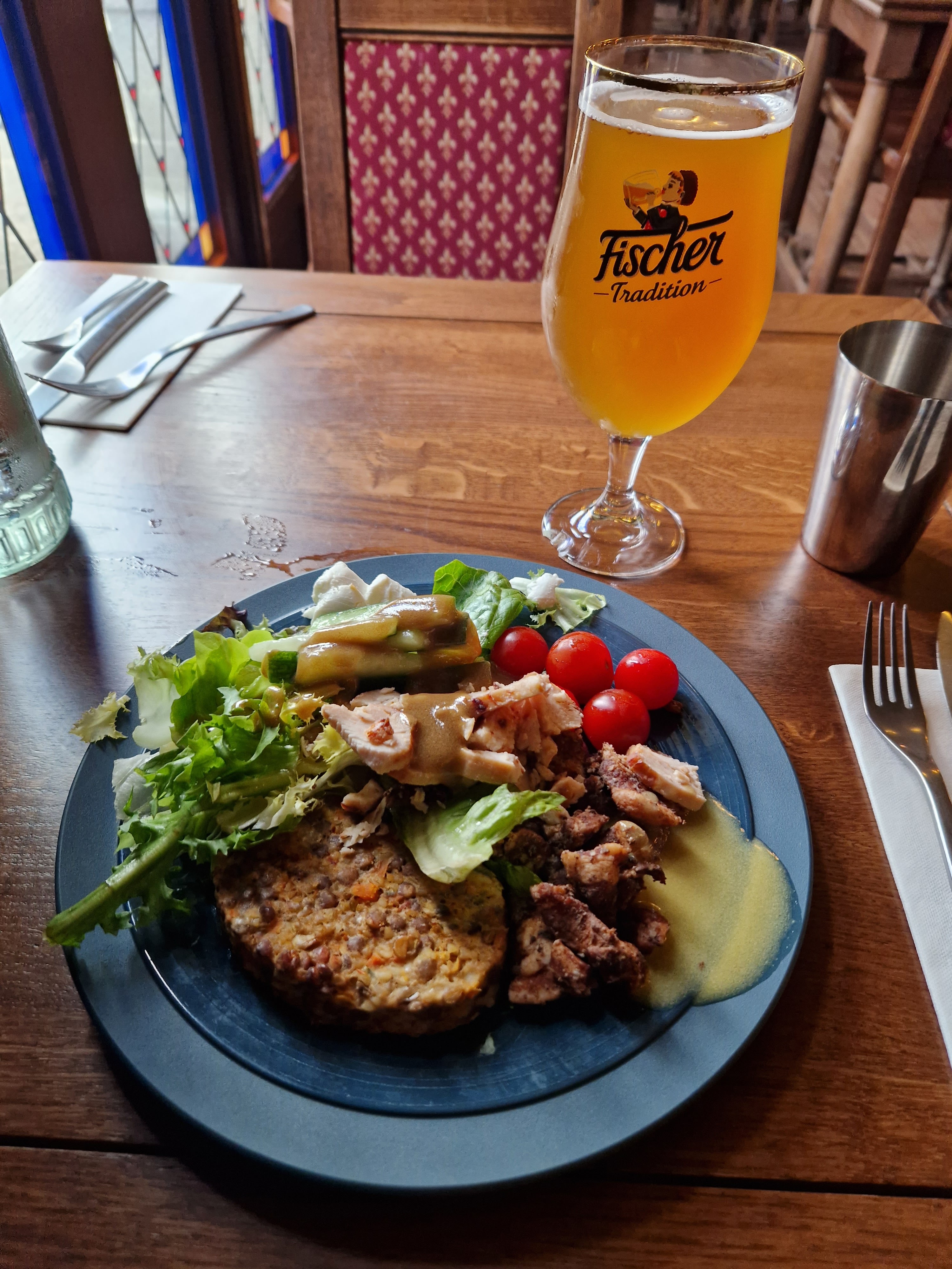 Il y a de bonnes choses comme les champignons, les sauces, d'autres moins comme la bavette trop dure, l'artichaut trop gras et salé, la carotte momifiée, mais le personnel et le décor sauvent tout !