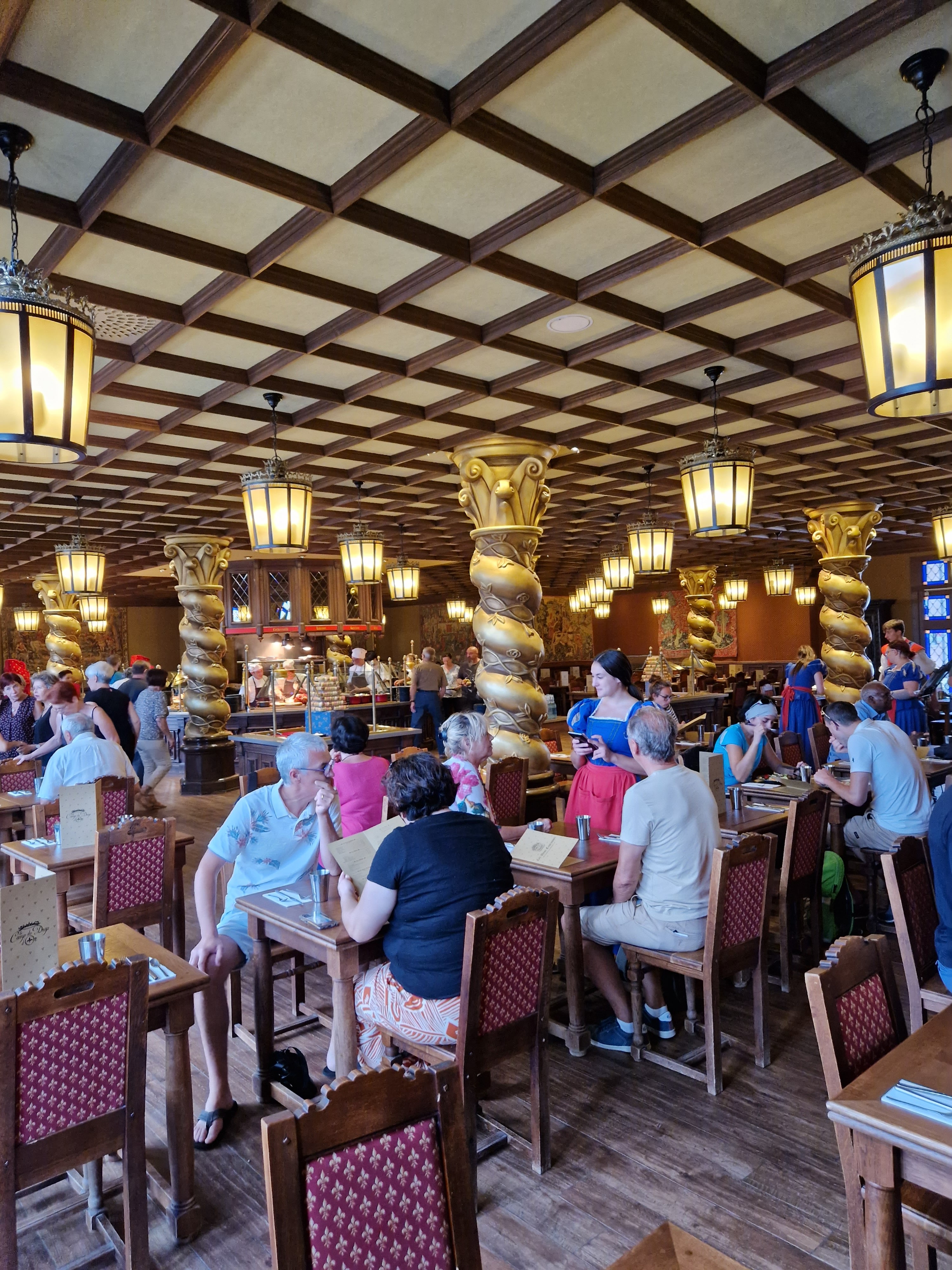 Il est difficile de circuler dans la salle une fois les gens installés. Le buffet est copieux, variés et sympa mais moins bien qu au parc Astérix où vous avez une salle réservée pour votre ce. C est moins grand donc moins d attente. Ici la salle est très grande mais il faut faire la queue partout c est pénible. Le principe des cuissons d'oeufs est ingérable car vous mettez un oeuf a cuire qq un autre le récupère et ce n est jamais cuit comme il faut.