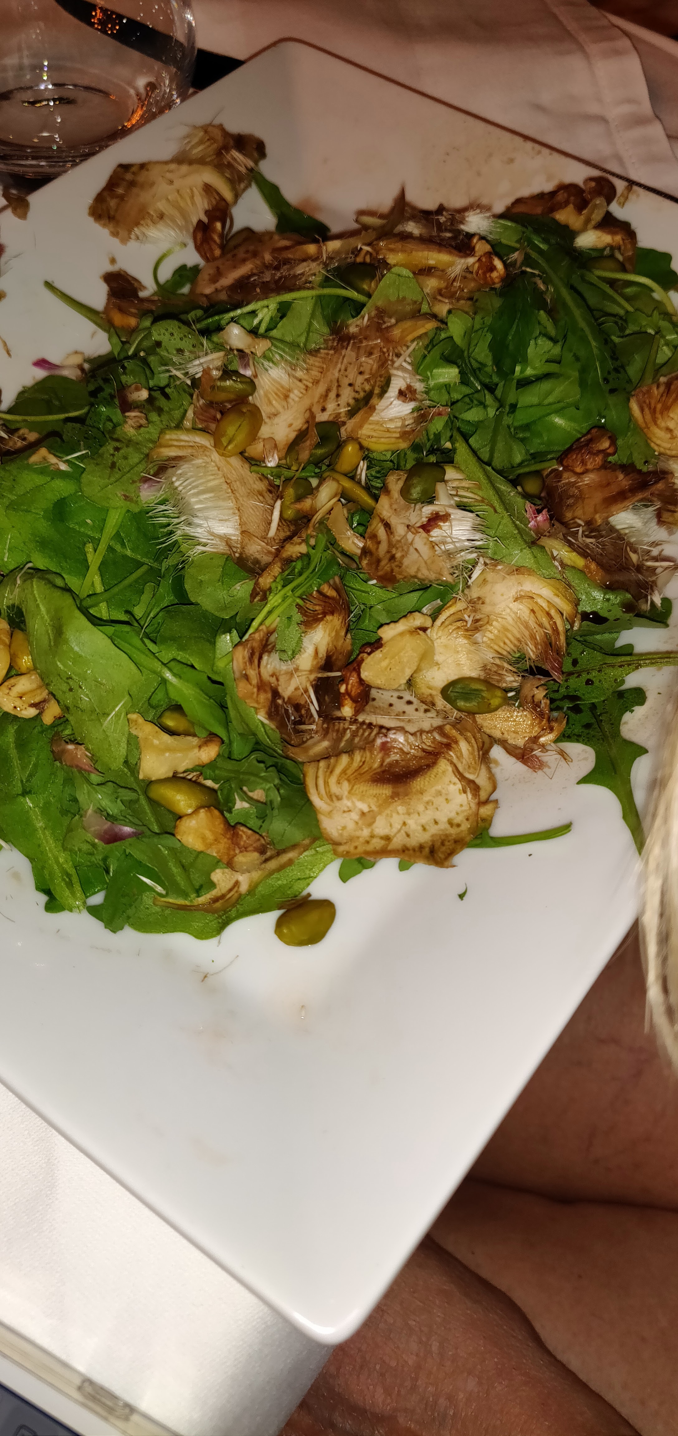 Délicieux ! Aussi bien la viande que la salade d'artichauts. A ce sujet, ayant lu les commentaires des autres clients, il faut que je spécifie que vu la région, il s'agit non pas de gros artichauts bretons, mais de petits artichauts méditérranéens qui se mangent entiers, souvent sautés, mais ici crus et en fines tranches. Avec un filet d'huile d'olive et du sel, des noix du parmesan et de la roquette c'est absolument succulent, on dirait des champignons crus ou des truffes à la croque au sel. Pour ma part j'ai énormément apprécié ces plats qui sortent du sempiternel magret de canard ou de la salade de chèvre chaud : originaux, frais, locaux. Un regret concernant le risotto : très bon goût de safran, bien cuisiné, al dente comme il faut. Mais il aurait fallu du riz italien, arborio ou vialone, à la place du riz long qui ne convient pas pour le risotto. Service au demeurant rapide, pro. Les serveurs sont charmants et attentionnés, même en cette fin de saison, ce qui est loin d'être évident vu l'état de fatigue dans lequel ils doivent se trouver. Bref : une excellente adresse où nous retournons chaque fois que nous sommes à Aix.