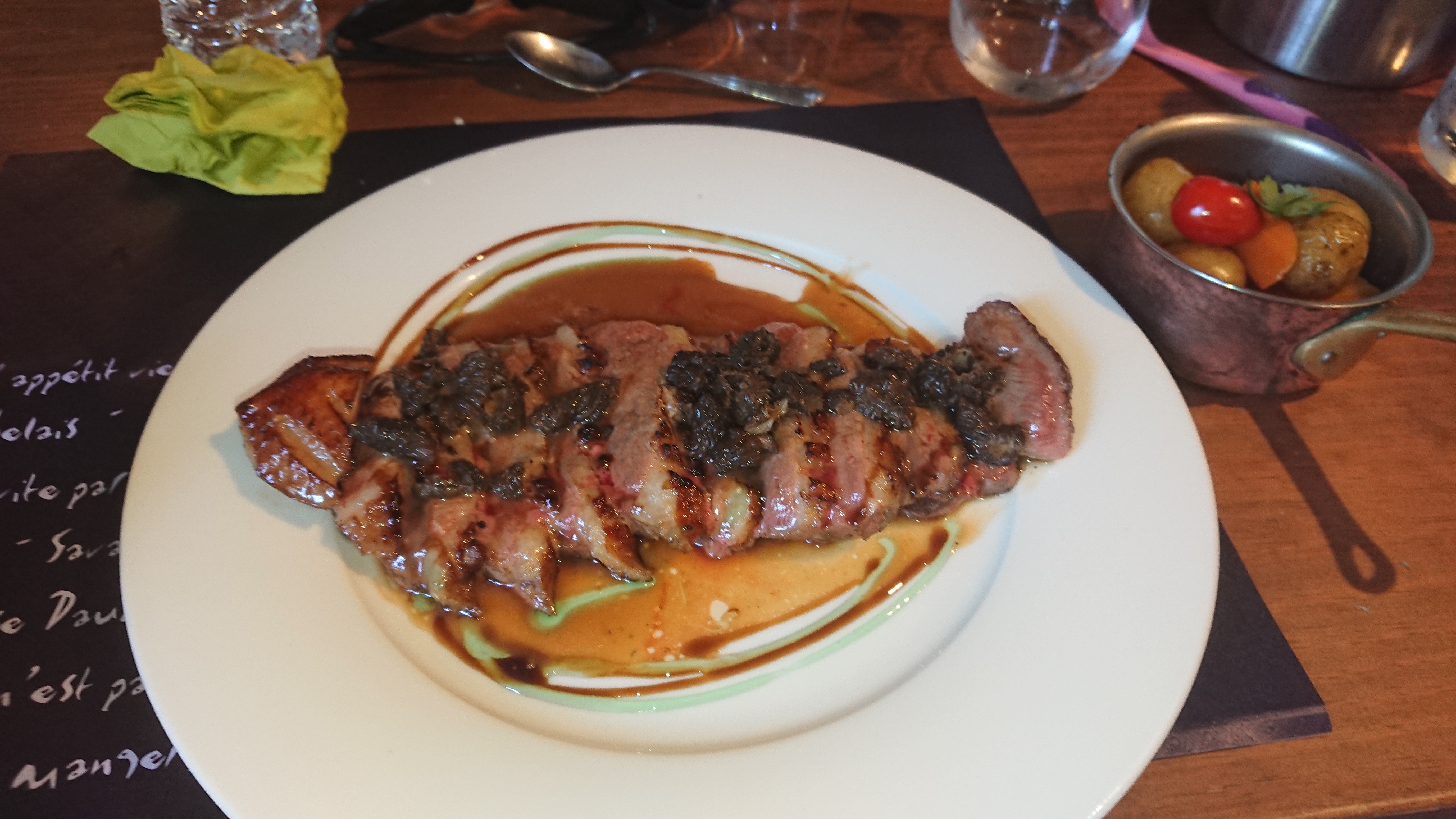 De l'extérieur le restaurant est un peu tristounet (visite en octobre) .A l'intérieur l'ambiance est tout autre . Vraiment jolie donc L' accueil un peu froid au début mais ça se réchauffe par la suite ....Menu à 26€ ,tres bon rapport qualité prix . Entrecôte à la carte énorme j'ai eu du mal à finir . Bref ,une super adresse . Je recommande vivement . Je n'ai pas mis 5 étoiles par rapport à l'accueil , la dame plus âgé était peut-être dans un mauvais jour ? ?