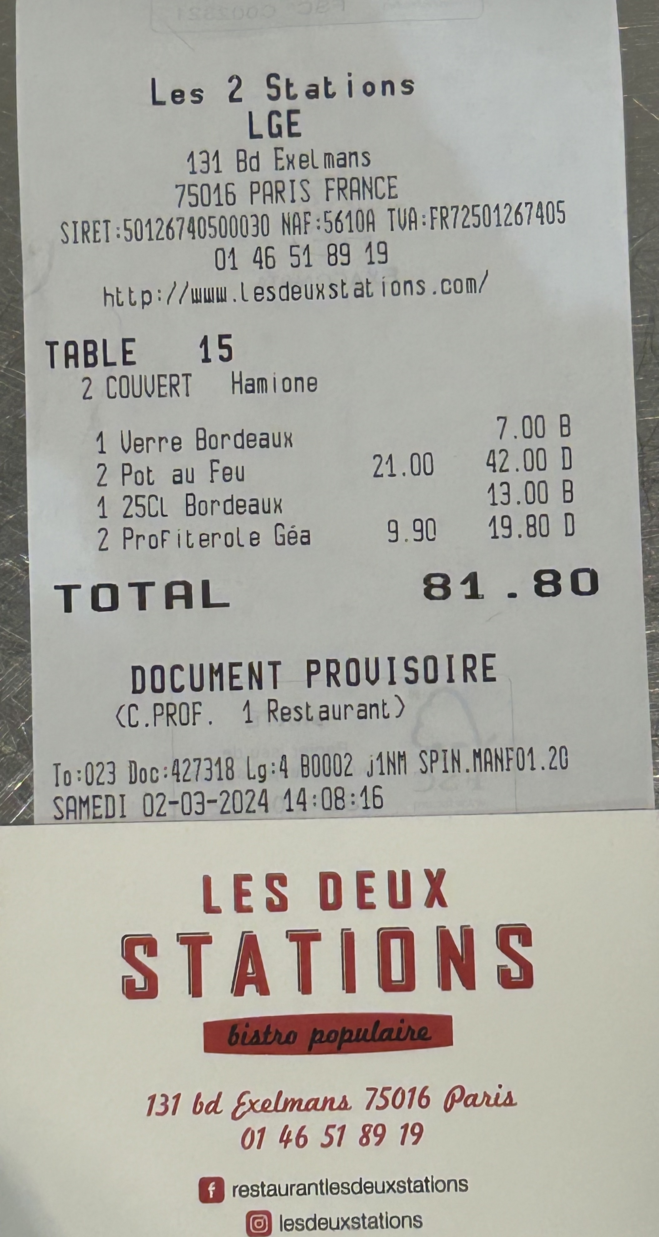 Dans le très chic quartier d'Auteuil, rare sont les petit bistrot sympa et pas trop bobo, avec une cuisine traditionnel et abordable comme Les Deux Stations. Bistro sympa à la décoration ancienne a deux pas de métro porte d'Auteuil. Ils ont une terrasse chauffé derrière, très agréable en été comme en hiver. L'ambiance y est bon enfant et le service chaleureux. La salle est un chouilla bruyante mais adapte a l'ambiance bistro. Petit plus la mousse au chocolat a volonté pour les gourmand :-) Je vous recommande fortement ce bistro.