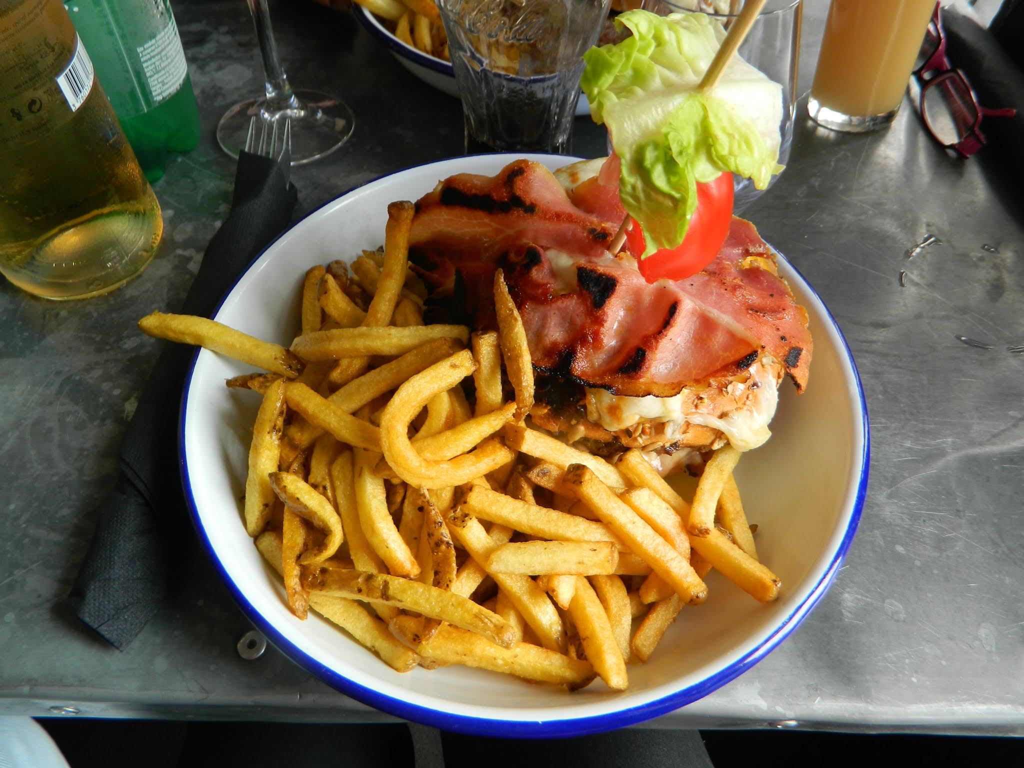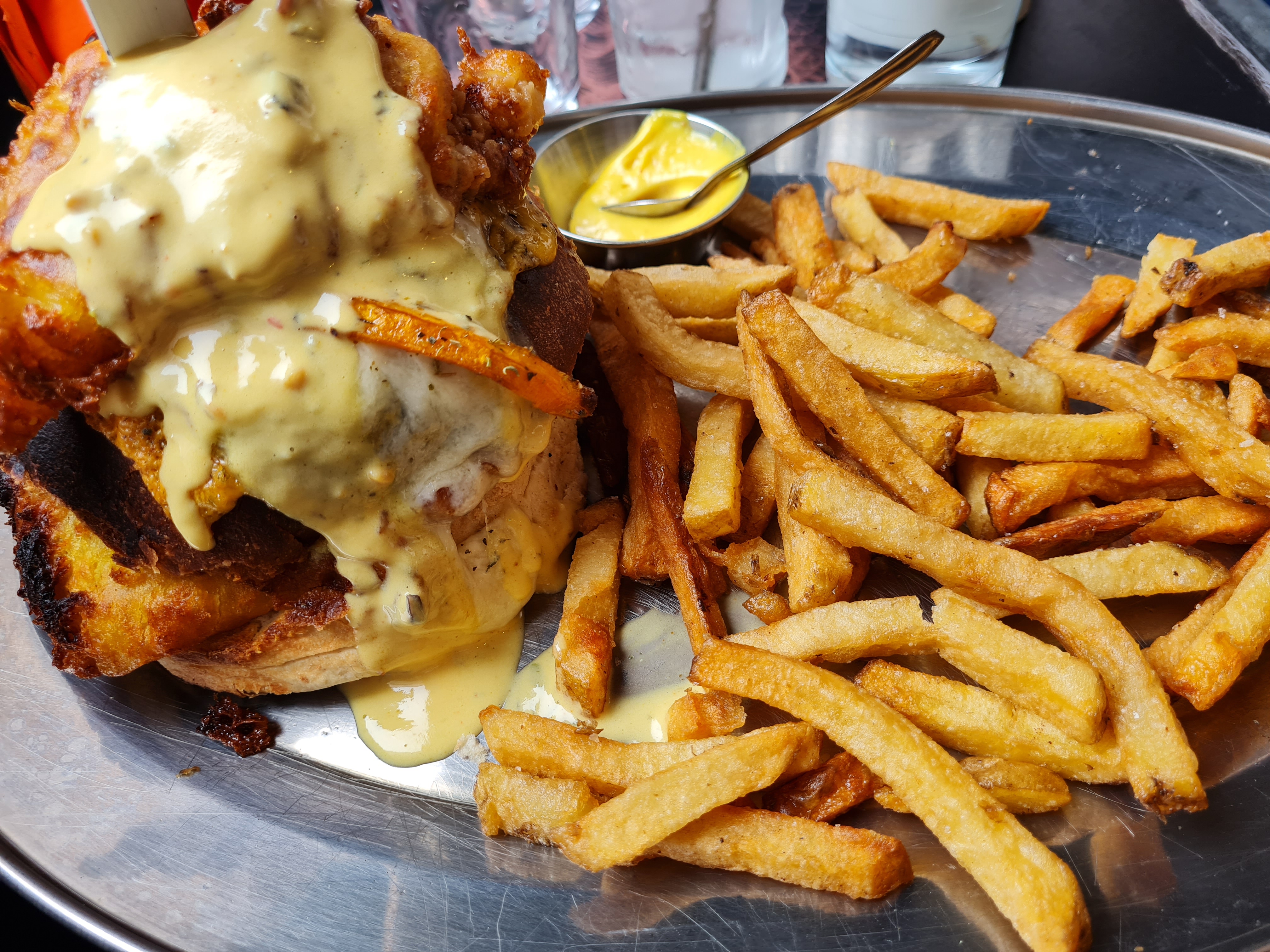 Les délais de service ont été extrêmement longs. Nos voisins ont été servis avant nous bien qu'ils aient commandé après. Les plats sont excessivement gras et les prix assez élevés. Le poulet était très sec malgré la sauce, et le camembert ne présentait pas son goût caractéristique. Toutefois, l'ambiance est agréable et les frites sont excellentes.
