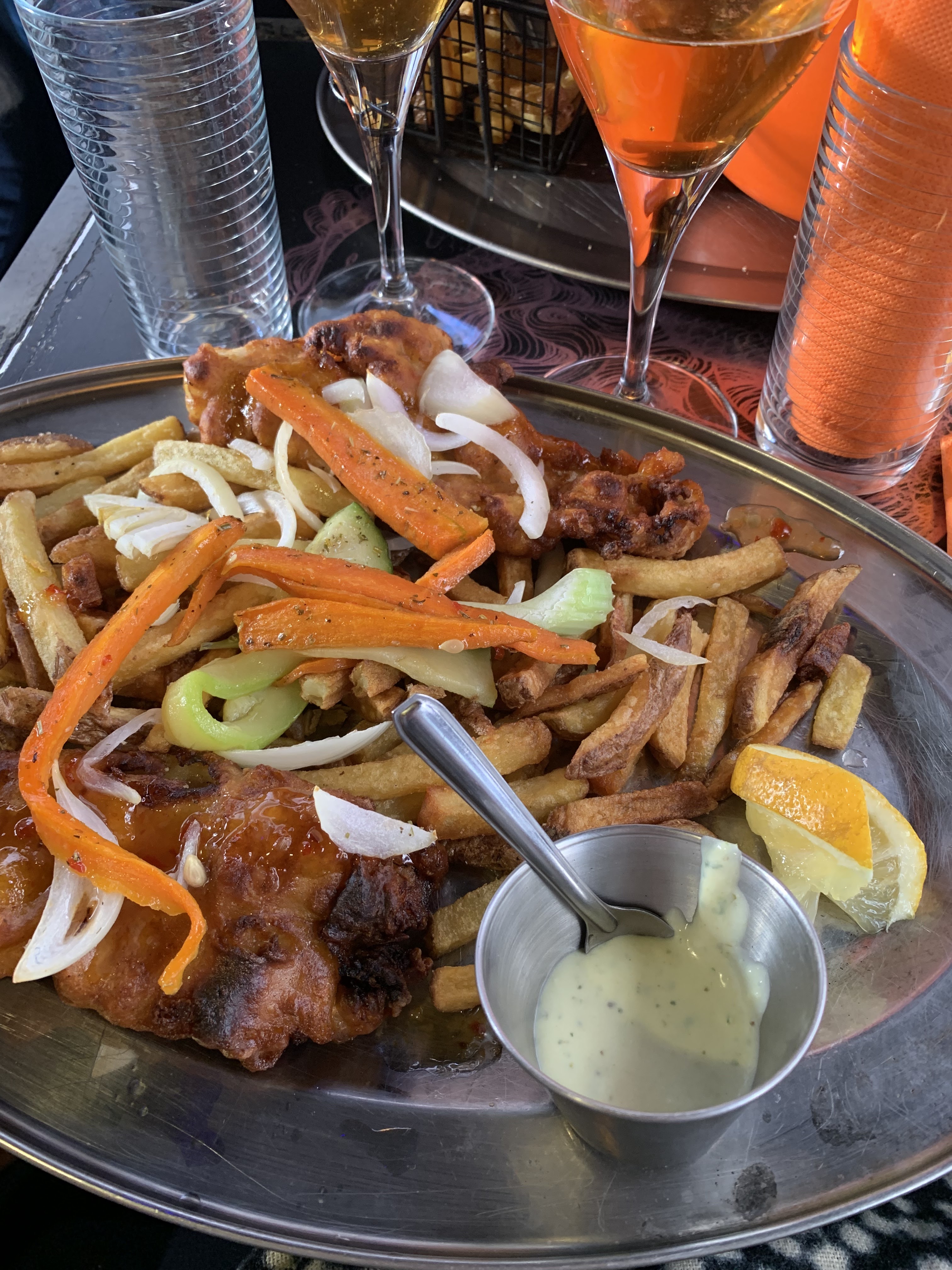 Pas de communication tue la communication! Nous prenons un camembert rôti au miel et aux poires noté ainsi sur l’ardoise. Au lieu de nous dire qu’il n’y a plus de poires ce qui peut arriver, au lieu de nous servir un simple camembert rôti au miel on prend la liberté de nous remplacer les poires par des…oignons! Infecte. Ça repart en cuisine. Arrivent nos plats un fish and chips qui se trouvent être des beignets plein de curry et de piment. Et un poulet fermier frites qui n’a rien du simple poulet frites il s’agit en réalité d’un poulet à la mode basquaise avec plein d’oignons encore une fois, des poivrons et divers légumes noyés dans une sauce infâme. Sans compter que le poulet était un froid mais c’est un detail. C’est cool de jouer la carte de l’originalité mais par pitié notez le sur votre ardoise! Les gens peuvent avoir des allergies, ce n’est pas notre cas, nous n’avons rien mangé juste parce que nous n’avons pas aimé! La serveuse voit qu’on a rien mangé, le boss en cuisine ouverte voit revenir ses assiettes pleines: pas un mot d’excuse! On m’encaisse 42e pas le moindre geste commercial qui aurait été d’offrir la boisson à 4e. Monsieur le restaurateur, changez de métier!