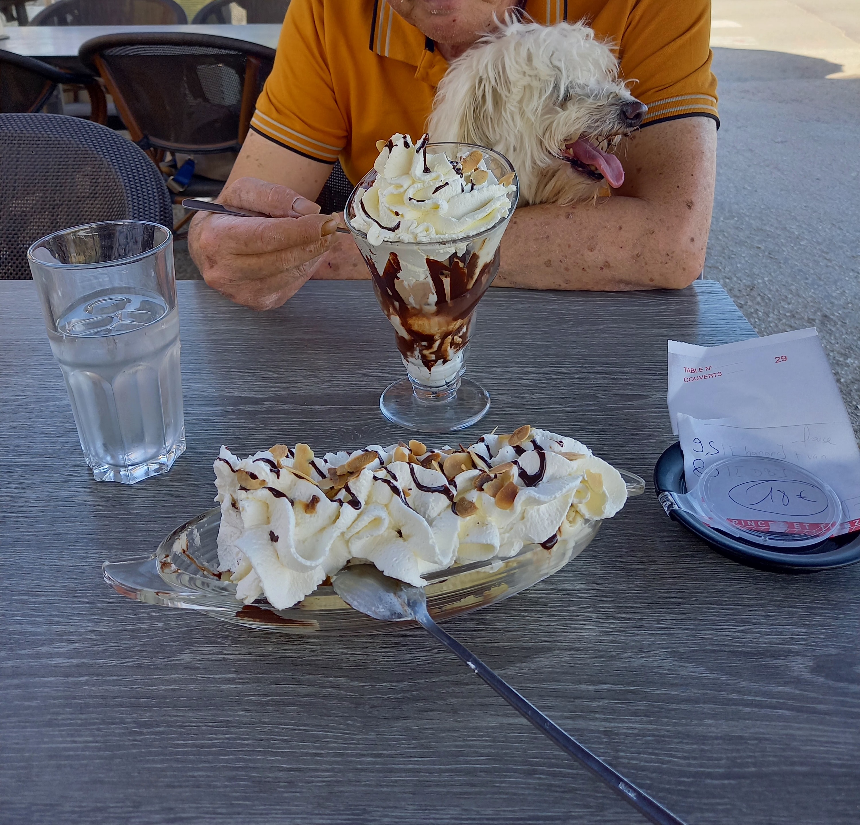 Petite balade et arrêt pour manger une petite crêpe..et des glaces pour mes enfants.. Bien servie délicieuse glace..moi une crêpe sucre chantilly.au top.. On discuter tranquille on profiter de ce moment paisible.. On ne montrer aucun signe de départ kan une serveuse est venue me dire je viens vous encaisser.. Euh OK.. Elle a du avoir peur que je paye pas!! Cela ma fait drôle..on etait trois tables dehors donc pas foule.. A part sa très bon moment et délicieuse crêpe..