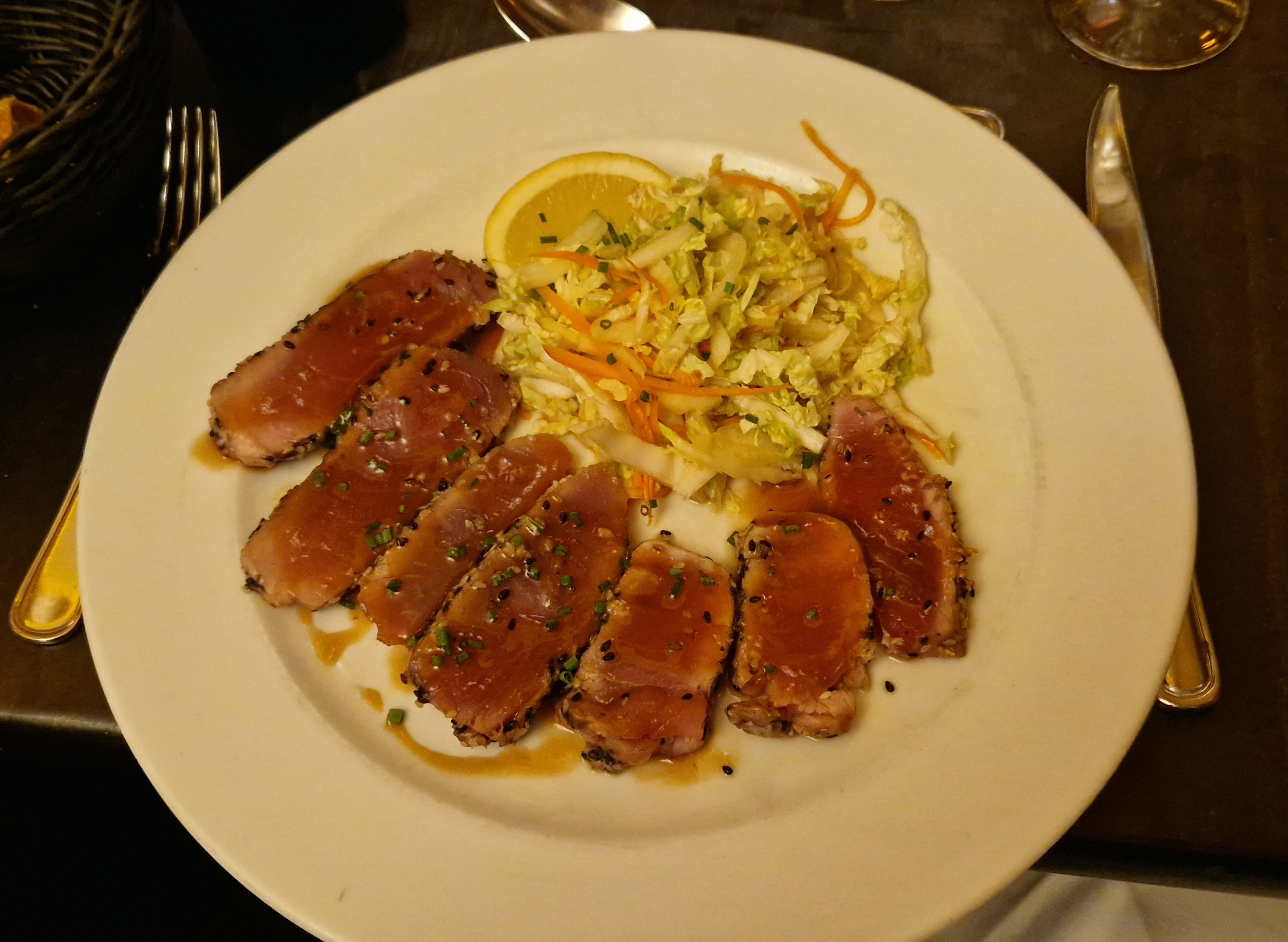 J'ai pris un tataki de thon aux petits légumes croquants ; en fait de petits légumes croquants , j'ai eu du chou cru en salade. J'attendais plutôt des légumes cuits al dente...