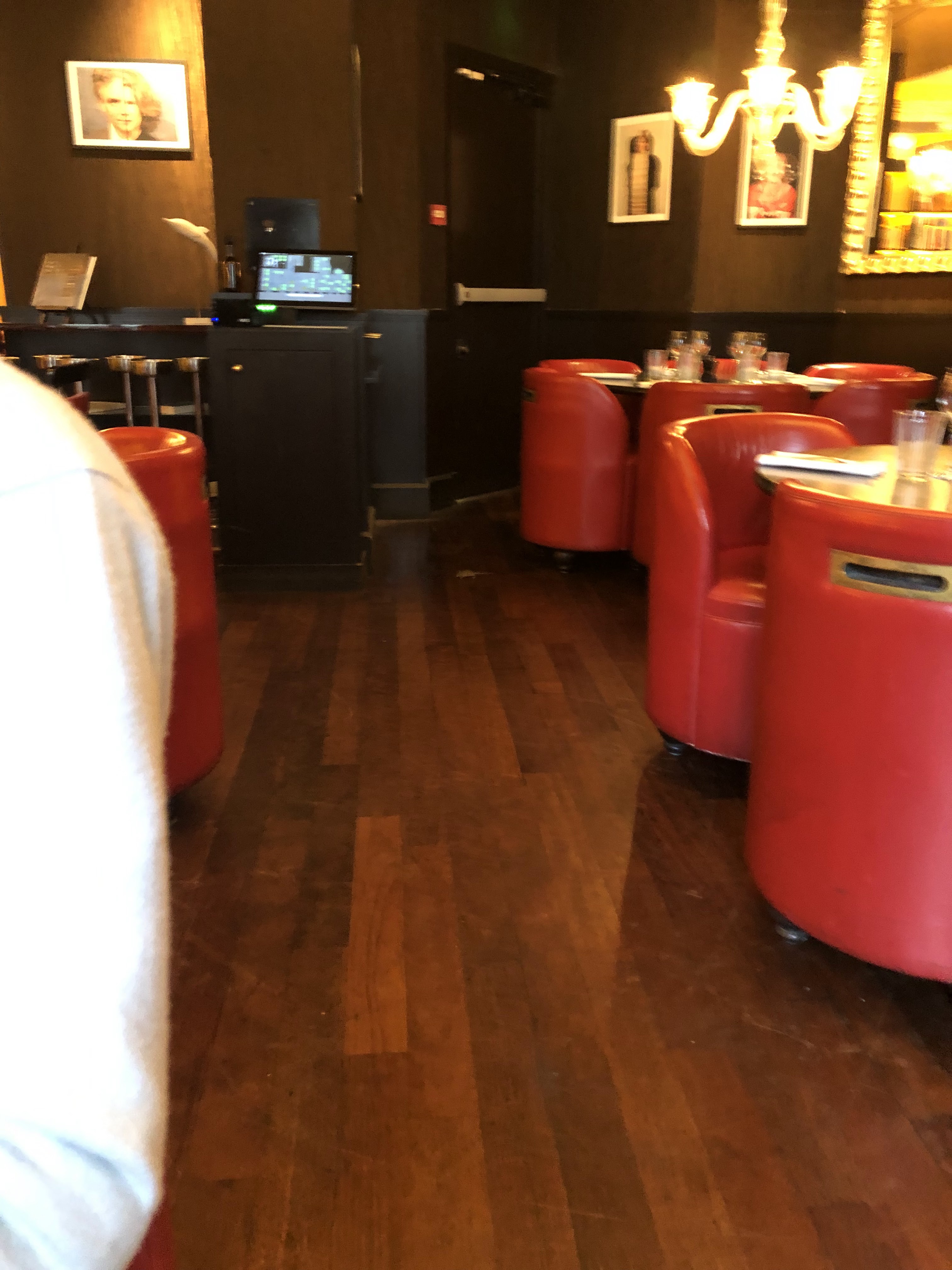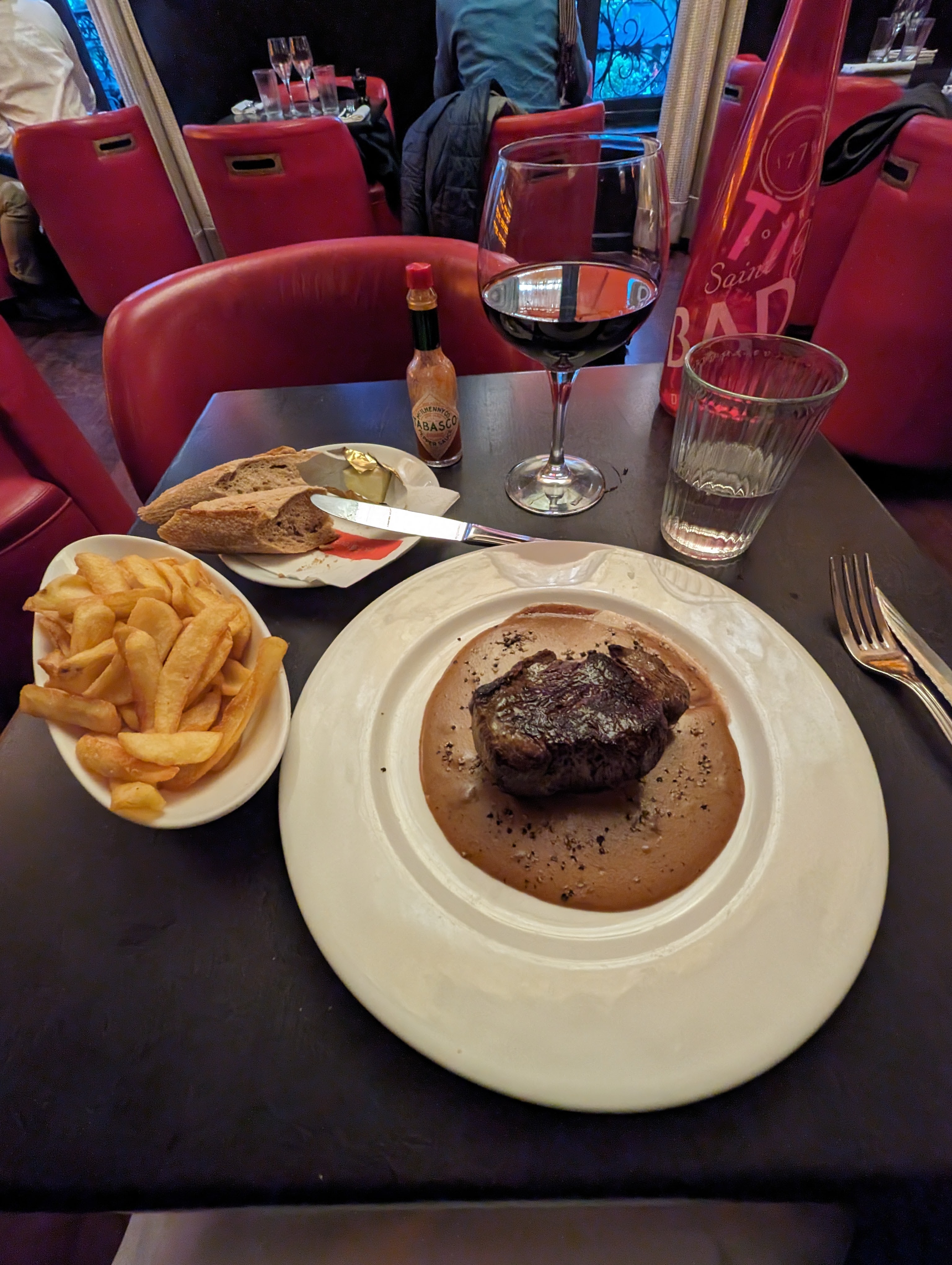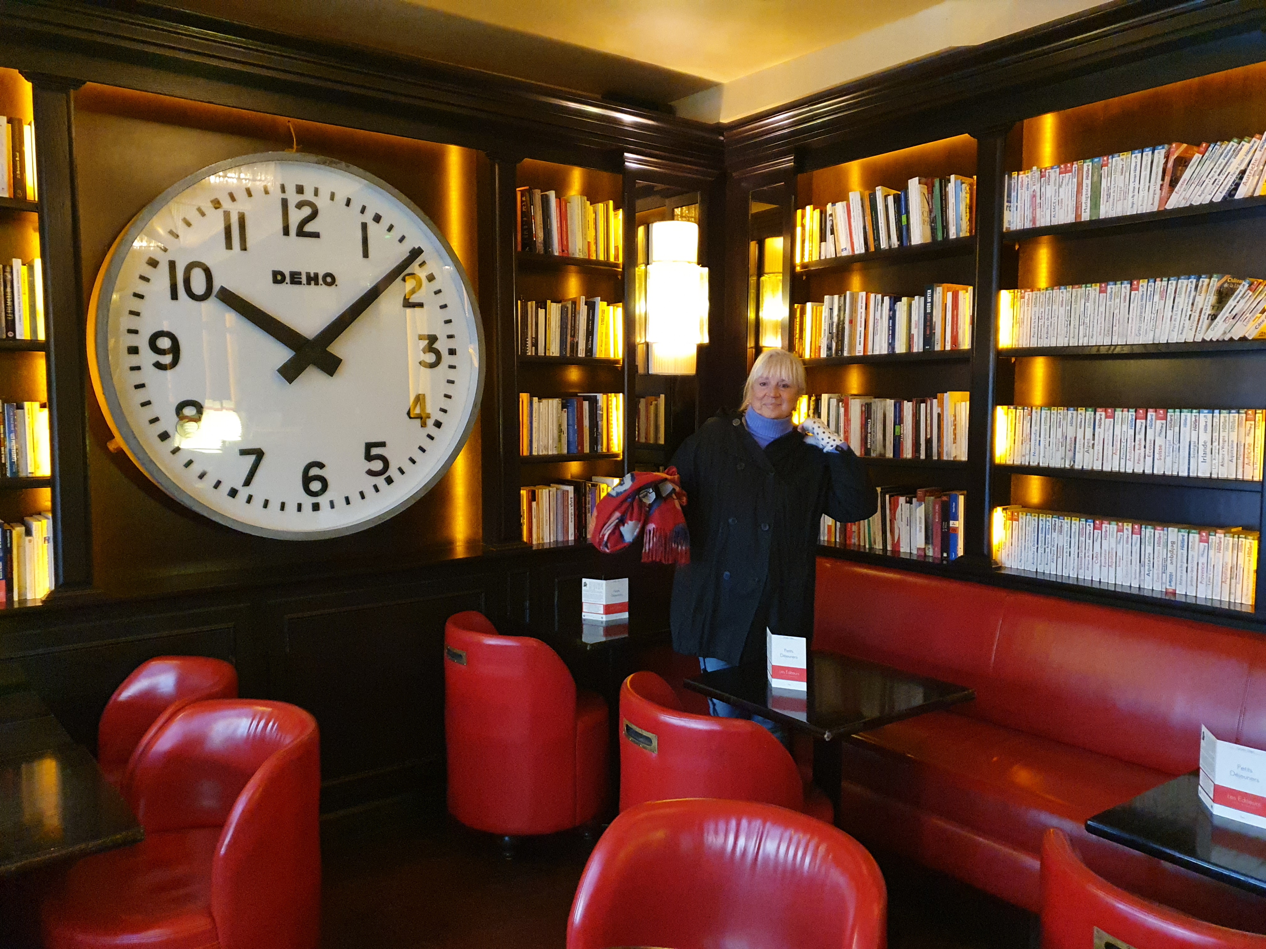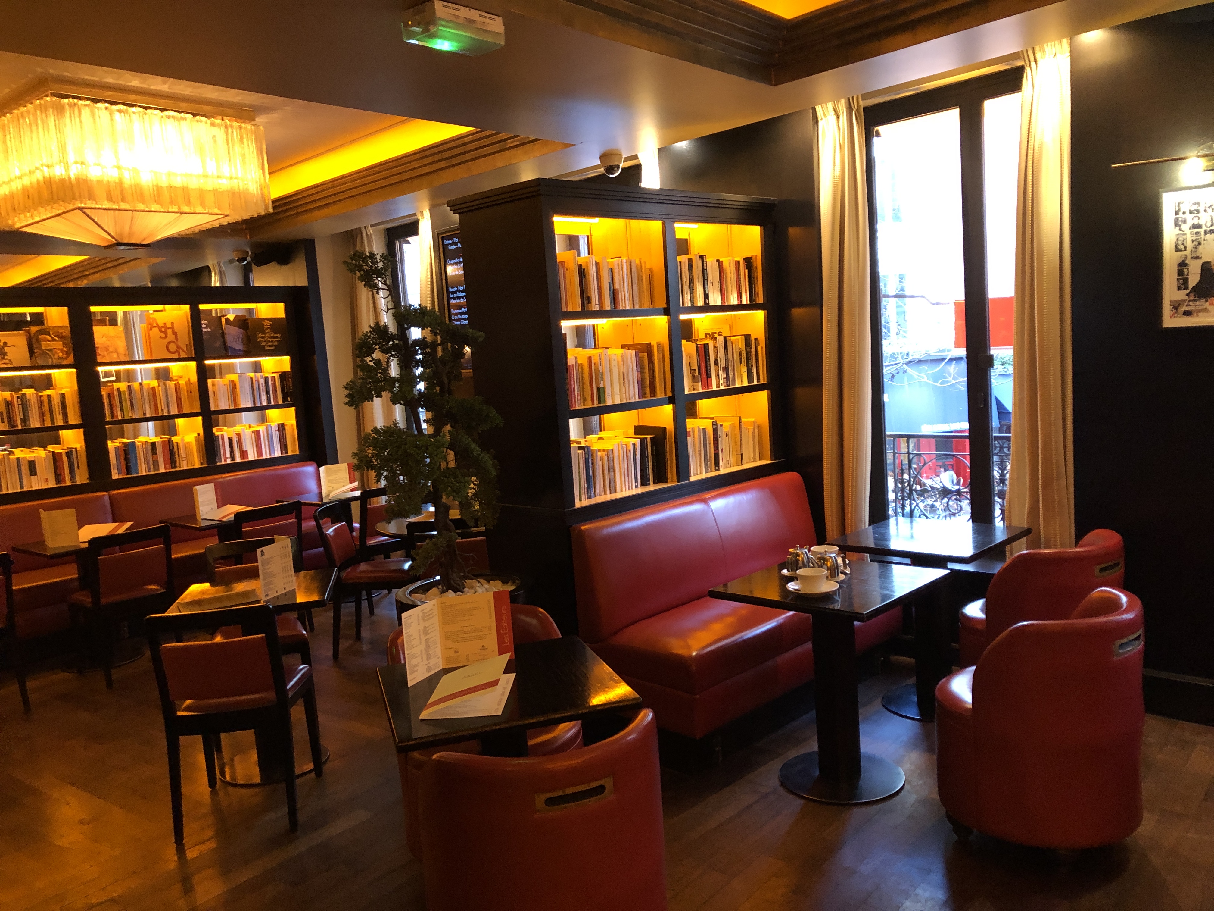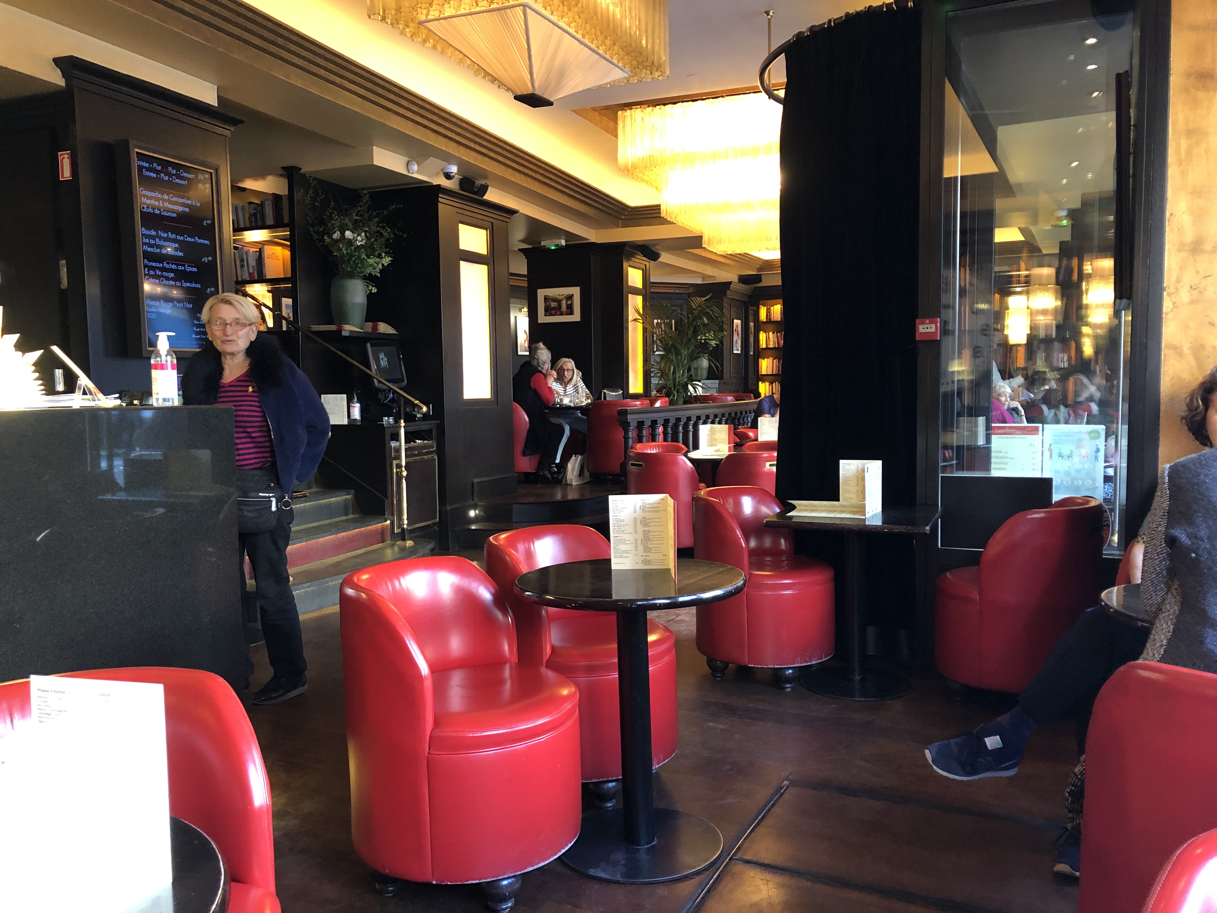 Bel endroit avec une superbe vue dégagée sur la rue. J'adore les livres accrochés au mur et les œuvres d'art, mais la montre-horloge géante devrait probablement disparaître. Les chaises rouges sont très confortables. Le service était excellent mais le verre de Bourgogne que nous avons goûté provenait d'une bouteille différente et était imbuvable. Restez fidèle au Brouilly. Les escargots en purée de pommes de terre étaient corrects, l'agneau n'était tout simplement pas assez à manger, le poisson était bon. Cela semblait très en sous-effectif et nos plats ont mis une éternité à arriver. Endroit toujours très agréable pour manger.