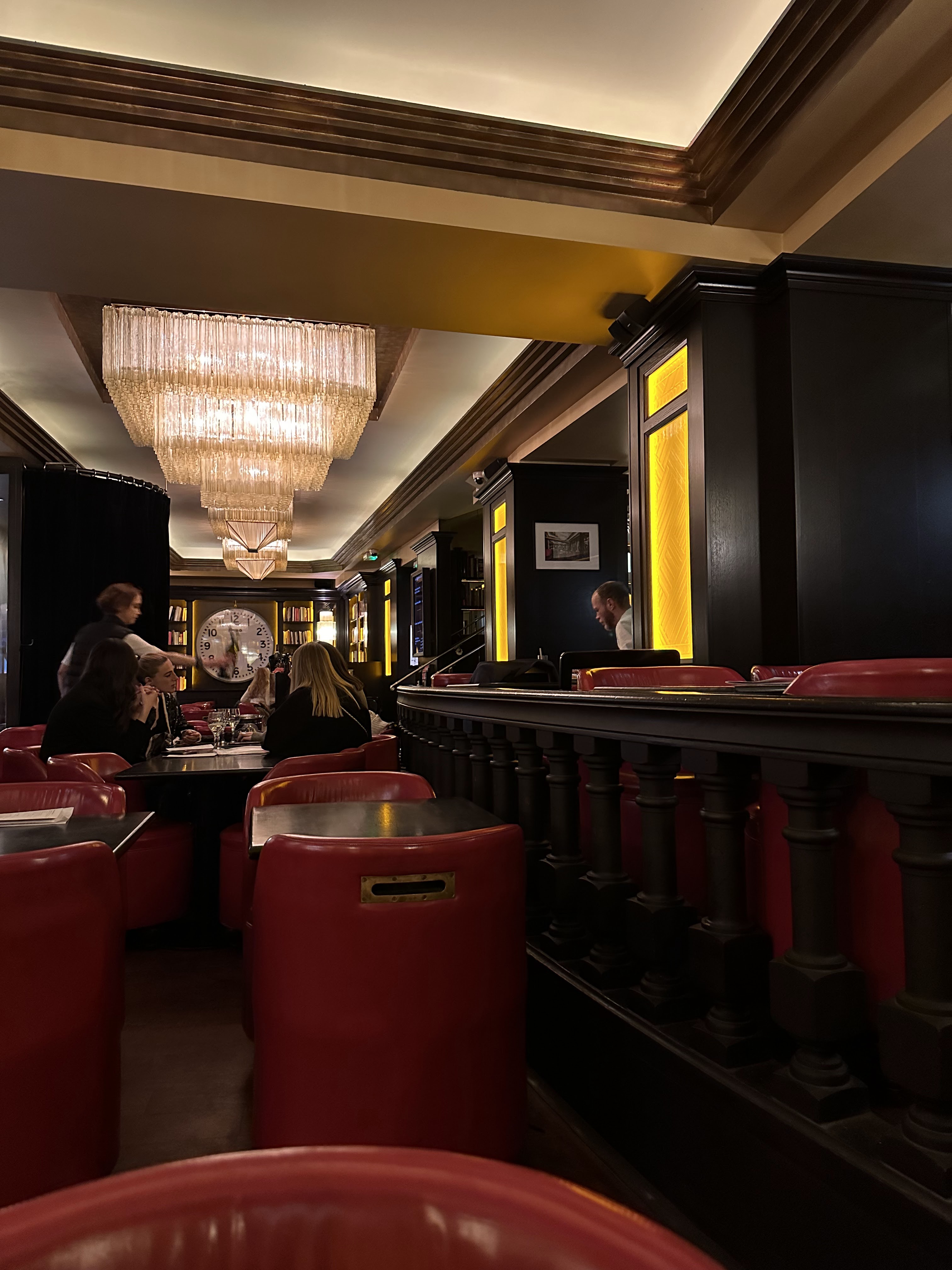 ❝ Soupe à l'oignon, escargots et bœuf tartare dans un restaurant chic sur le thème de la littérature doté de chaises en cuir rouge. ❞