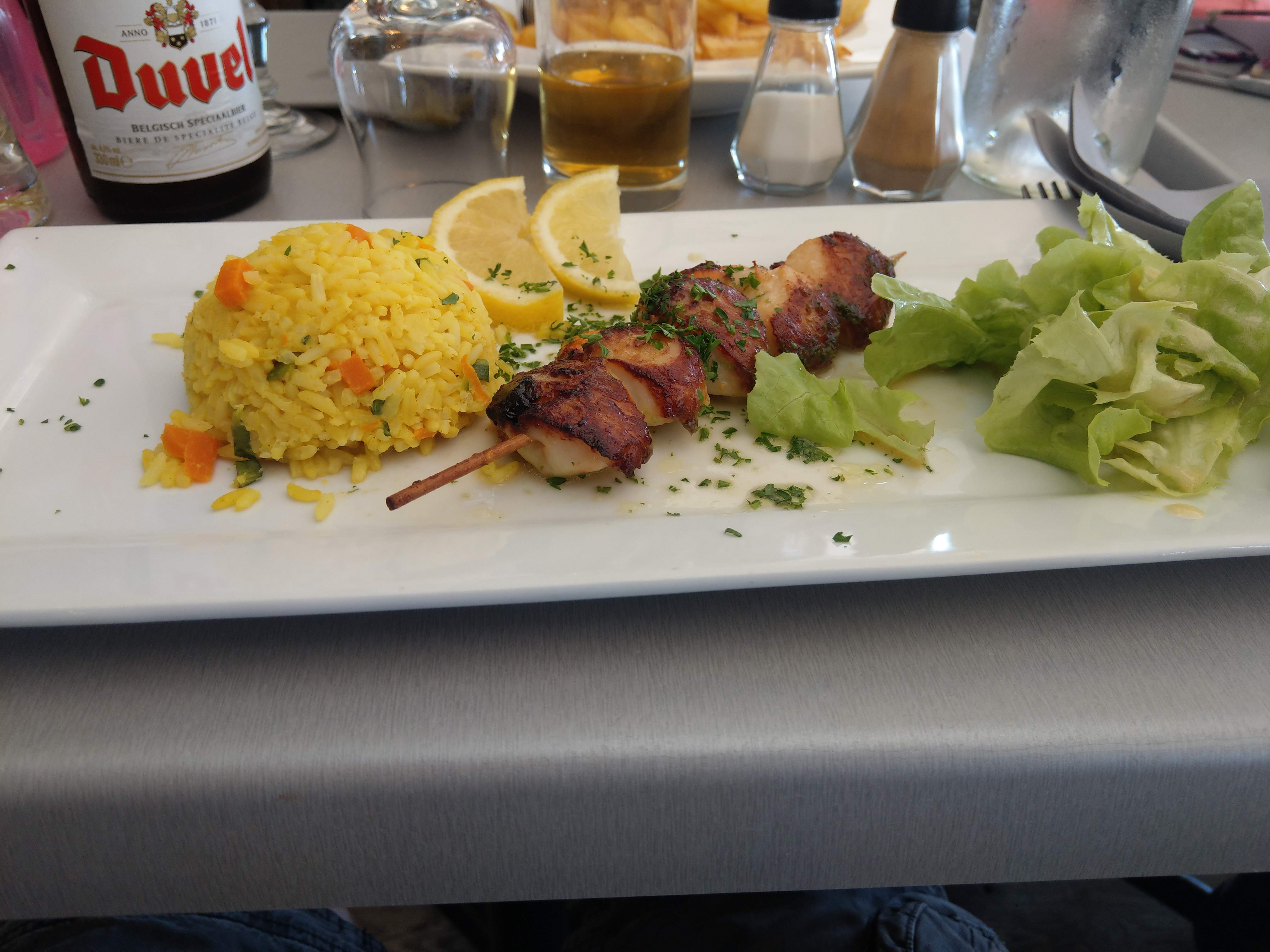 Malgré la sympathie du personnel en salle, ce repas du soir est raté. Deux steacks frites trop cuits, sans goût, avec des frites surgelées et une viande sèche ; un menu enfant 100% surgelé également, jusqu'à la glace arrivant sous emballage plastique directement depuis le supermarché sans doute Un burger lui aussi trop cuit, sans fromage, une tranche de jambon industriel asséché dans une poêle, avec une tranche de tomate trop cuite qui trempe le pain industriel lui aussi. Et un plat de petites moules au curry apparemment pas lavées avant cuisson. Le tout pour plus de 80€.