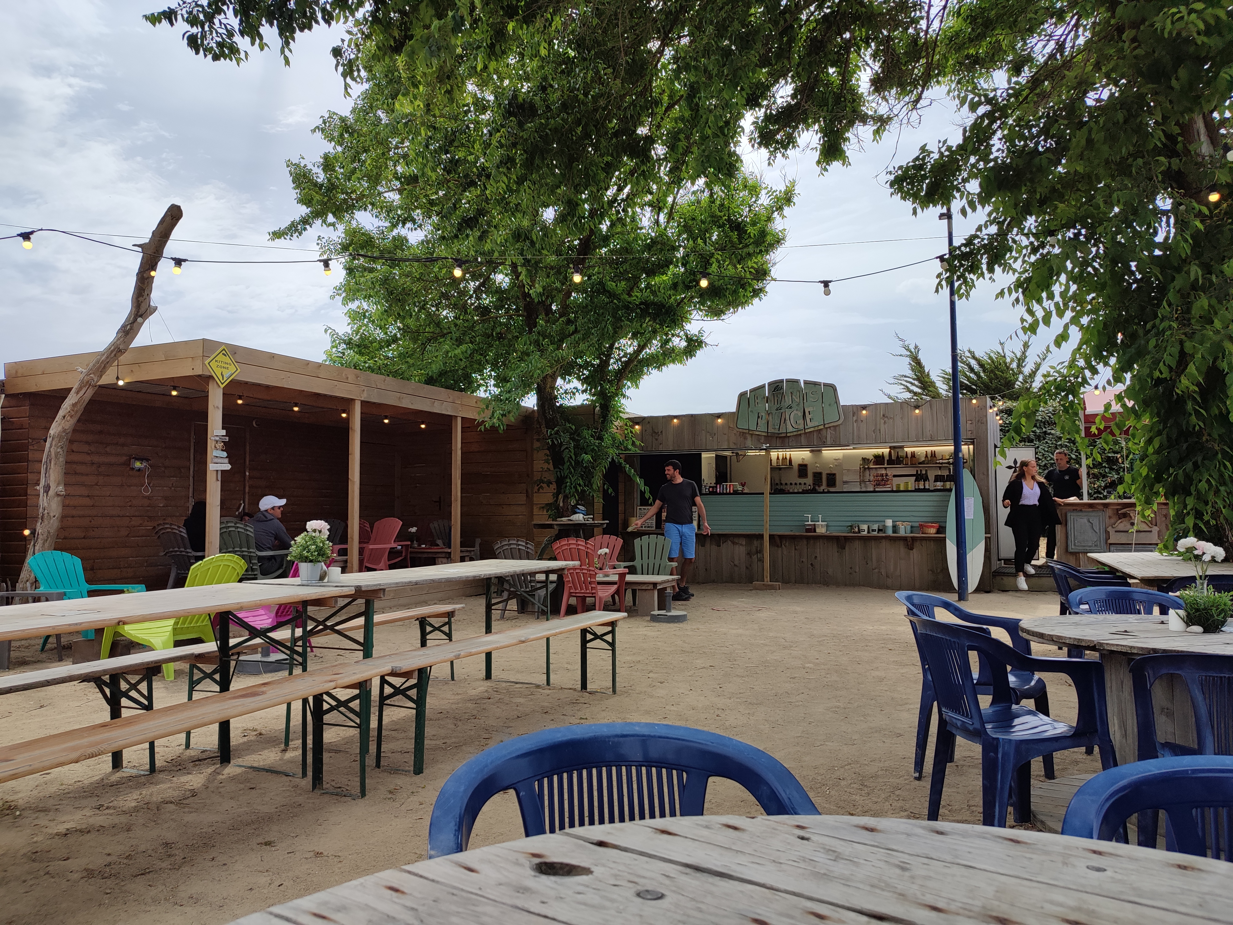 Bar de plage très original avec des barques en guise de tables dommage qu'il n'y en ai pas assez..accueil très sympathique par cette équipe familiale. Terrain de pétanque et jeux pour enfants. Respect des déchets original et petit boîtier pour vous prévenir que votre commande est prête...j'ai bien apprécié les sardines à partager pour l'apéritif. Juste une petite remarque pour la personne qui fait les gaufres, les cheveux non attachés, pas très hygiéniques pour les clients. Je vous le recommande vivement
