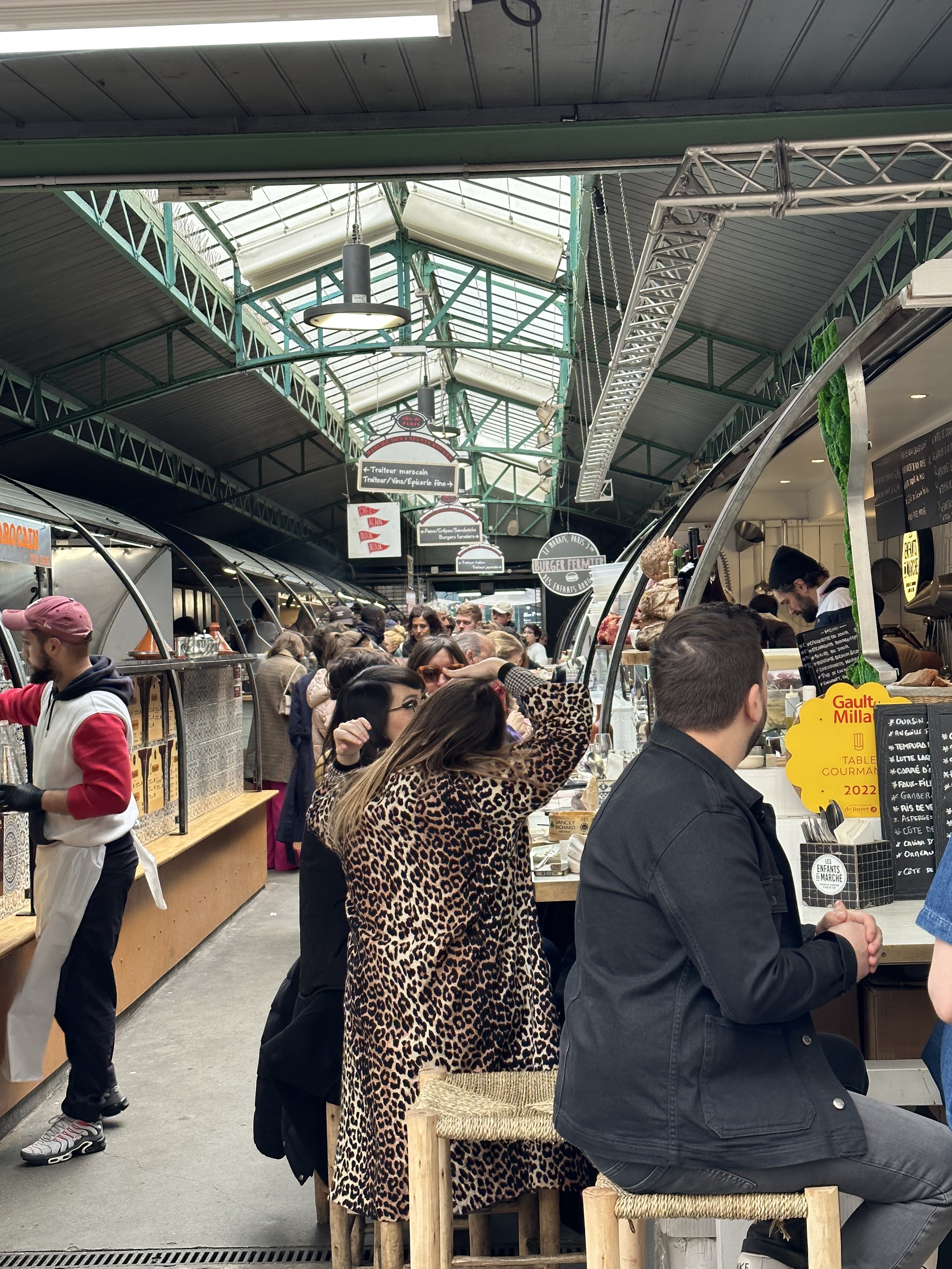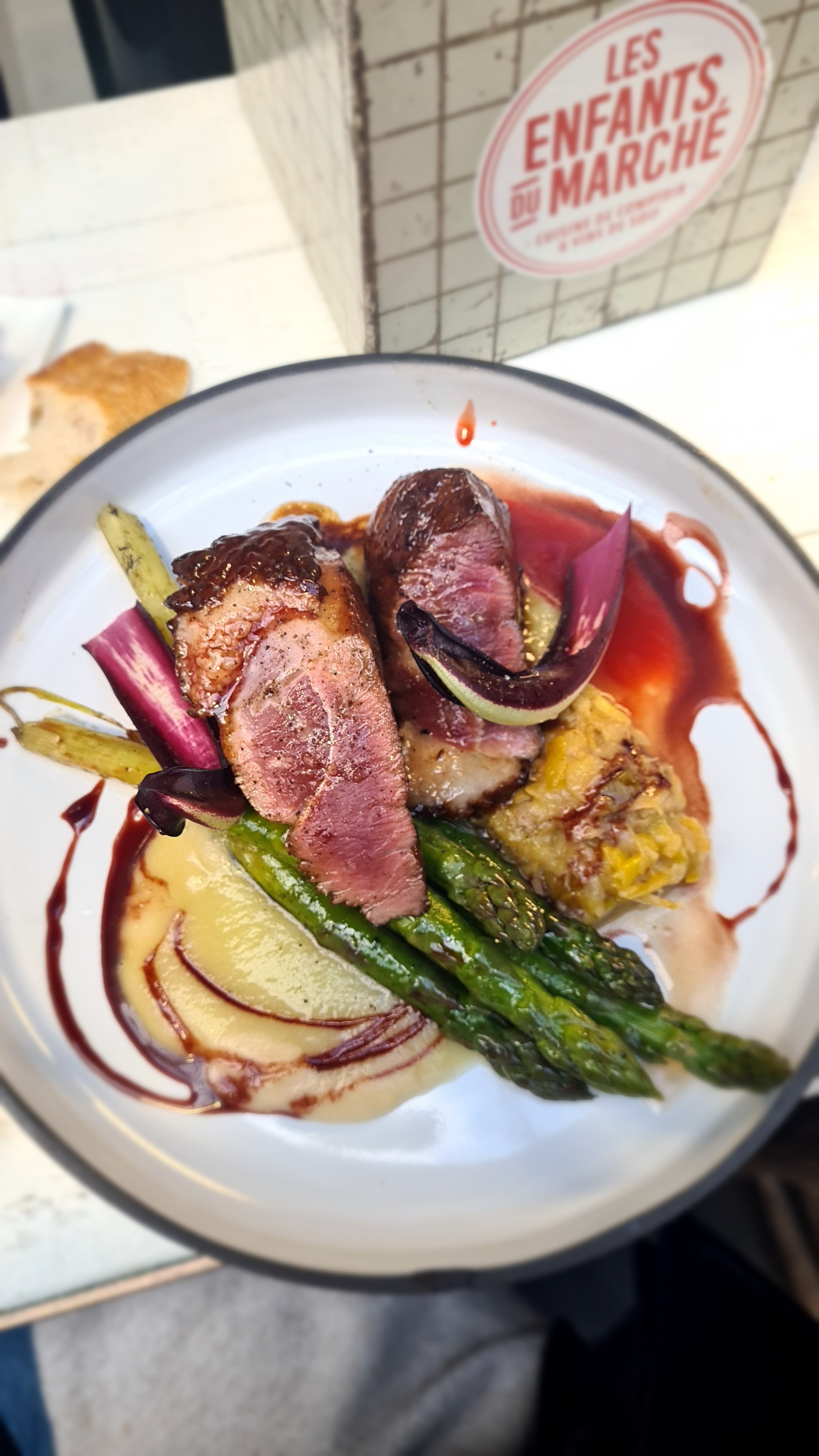 Commençons par les points positifs : - La nourriture est délicieuse. - La serveuse que nous avions était charmante et attentionnée. - Aucune réservation requise. - La file d'attente pour une table était bien gérée et ils servaient des boissons pendant que vous attendiez. - L'atmosphère du marché était cool et unique. Cela étant dit; Je trouve que Les Enfants du marché sont bien trop chers. C'était le repas le plus cher que nous ayons pris ce week-end et nous étions assis dans des chaises hautes inconfortables dans un bar, avec des vestes pour nous garder au chaud. Un peu contradictoire avec le positif de ne pas avoir besoin de réservation, nous avons quand même dû attendre 30 minutes pour avoir une table. On a presque l'impression de payer un supplément pour manger sur un marché. Si vous prévoyez de visiter, la nourriture est excellente - mais vous êtes au centre de Paris ! Pour le même prix, vous pouvez obtenir une qualité aussi bonne ailleurs dans un environnement plus confortable. Ils ont visiblement raison car les gens font quand même la queue pour y manger !