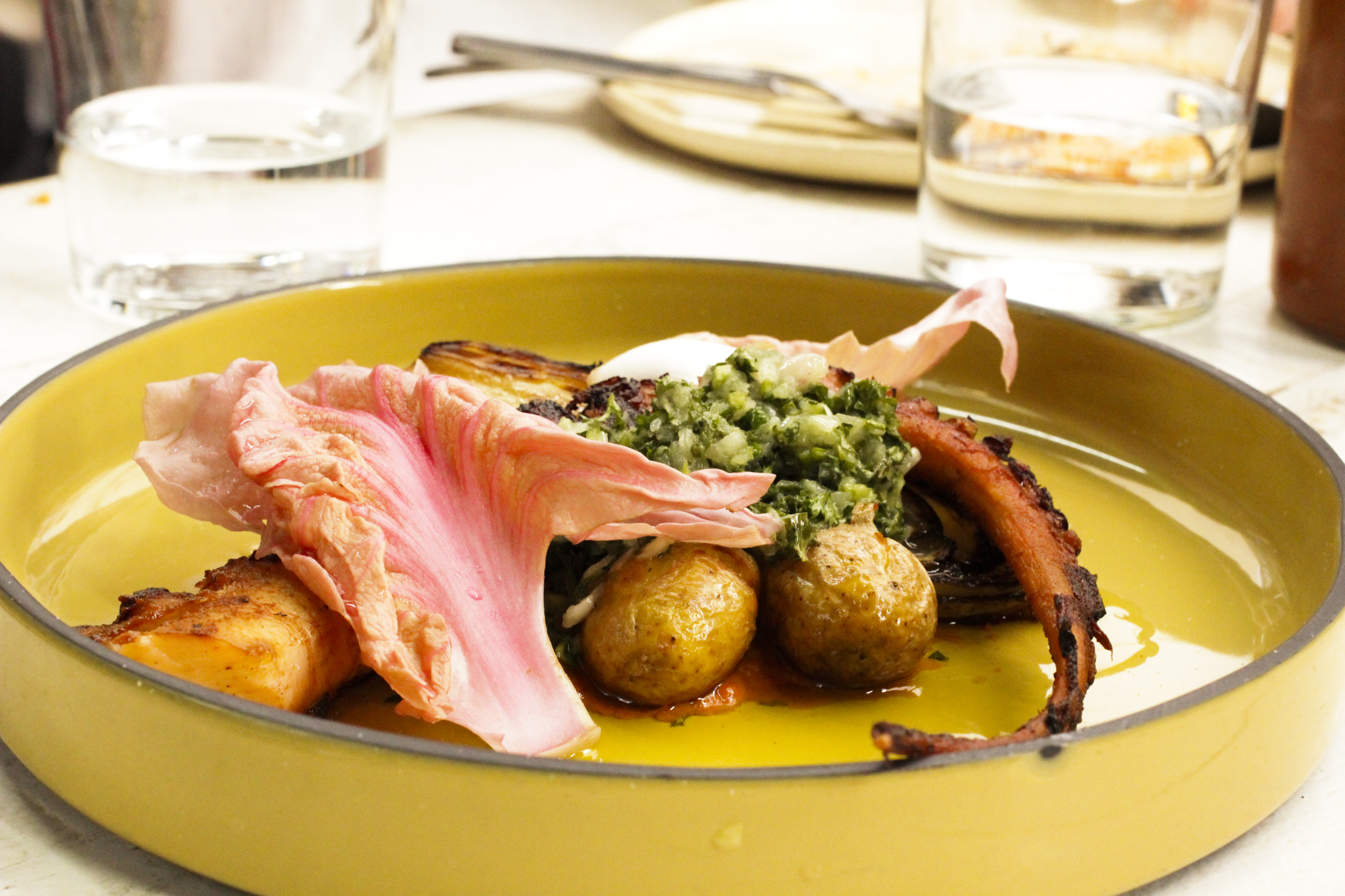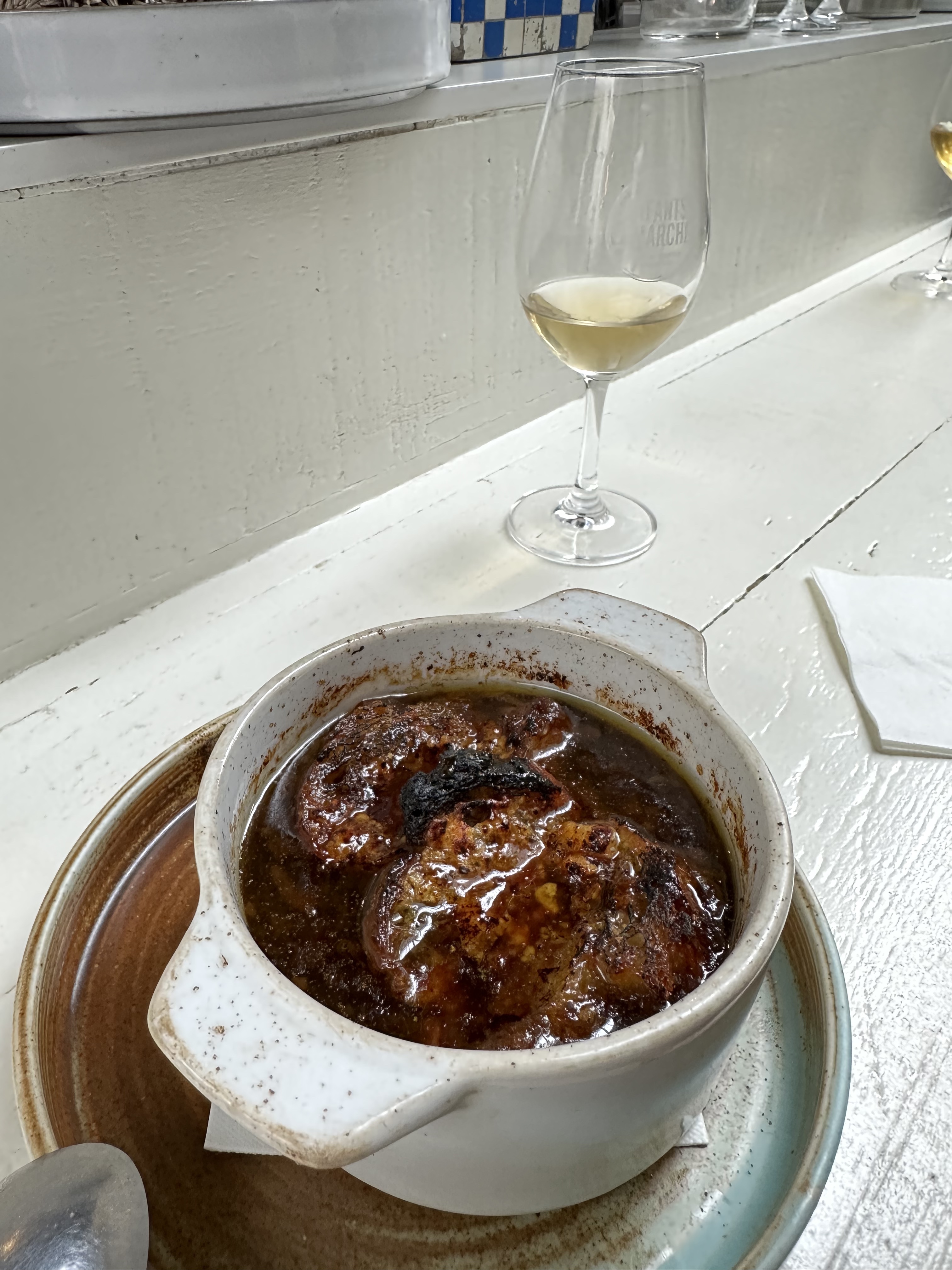 J'étais déterminé à manger ici après avoir découvert Les Enfant du Marche sur Instagram (oui), et wow, ça n'a pas déçu. J'ai adoré le style du bar sans rendez-vous et l'atmosphère décontractée. Les serveurs et les cuisiniers avaient l'air de s'amuser, ce qui rend le bar encore meilleur. Maintenant, la nourriture était incroyable... nous avions du karrage de calamars, un sashimi hamachi avec une sauce aux mûres dans un bouillon dashi, un pan con tomate avec de la sardine et un pied de porc croustillant avec une huître fraîchement écaillée (oui !) avec cette délicieuse sauce sucrée et noire ( c'était à tomber par terre). Et puis la sélection de vins nature ! Nous avons bu trois verres - un vin orange, clair puis plus foncé/baies. Chaque fois que nous reviendrons à Paris, je me ferai un devoir de m'arrêter ici car c'était si bon.