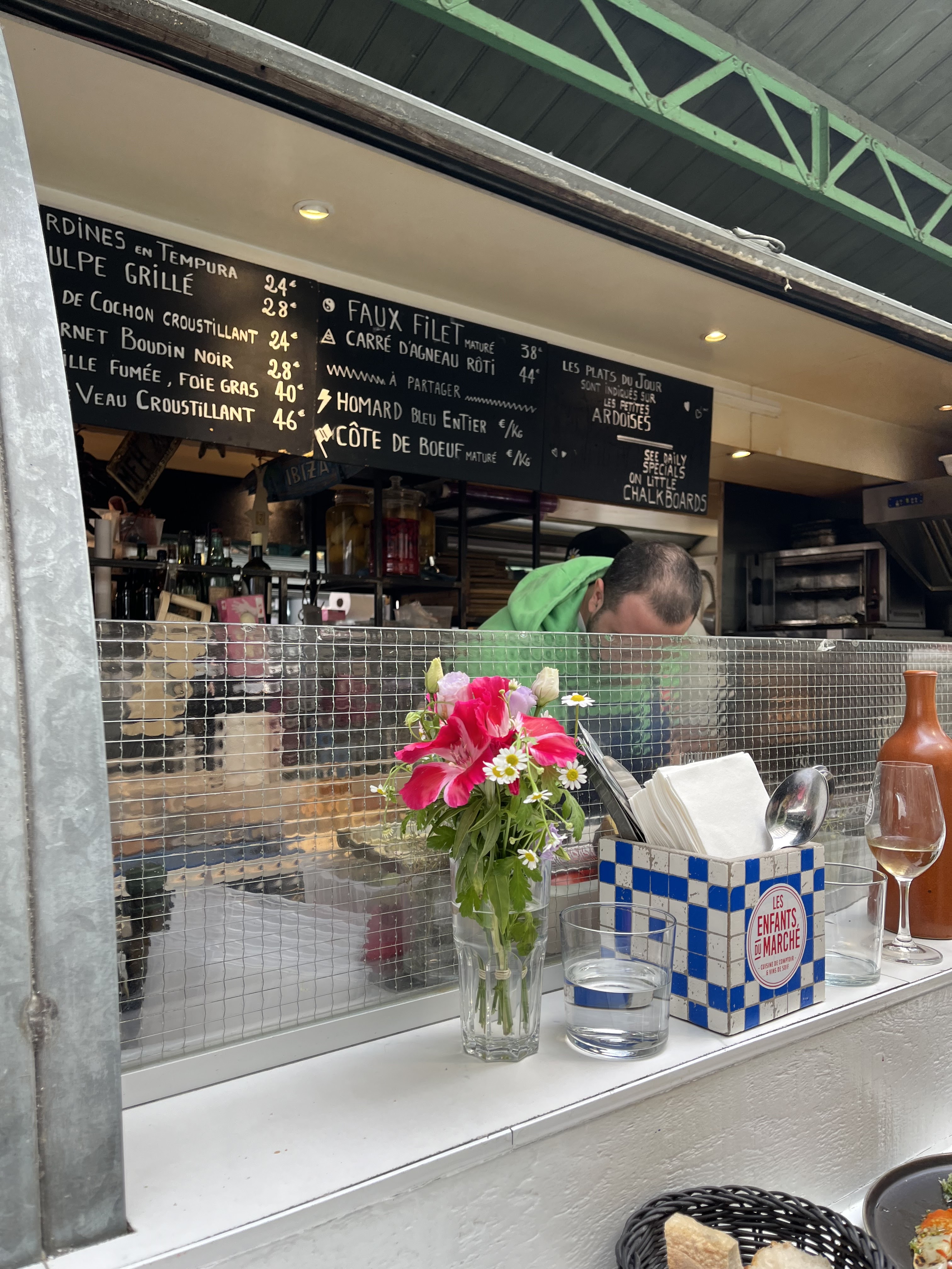 C’est trop cool, on y mange trop bien (même si il faut noter que l’addition peut vite monter). J’adore l’ambiance de se petit marché, et j’aime encore plus y siroter du bon vin et manger des coques depuis le comptoir des enfants du marché.