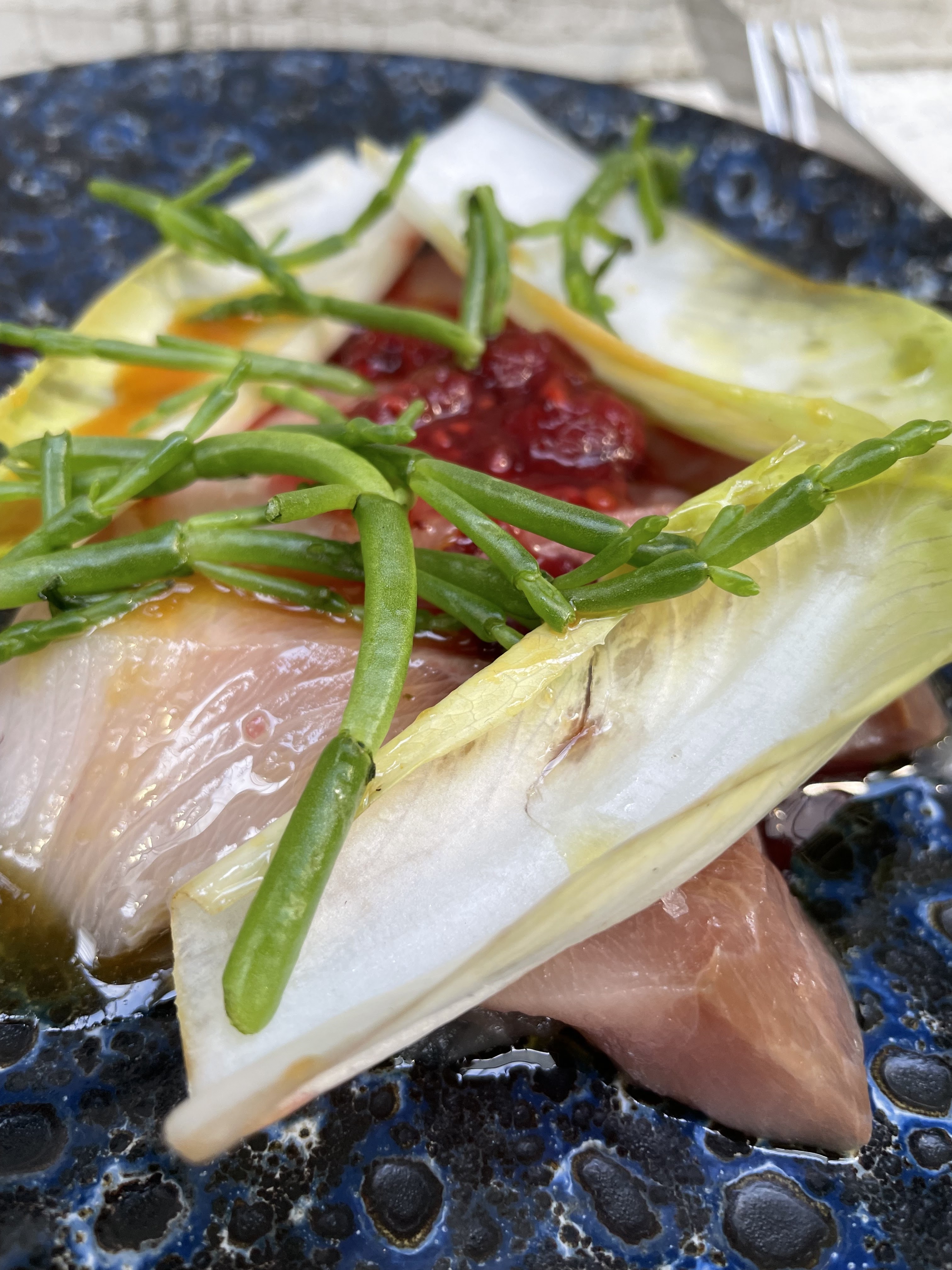 Une bonne solution s’il fait suffisamment chaud pour avoir envie de terrasse mais jouer en même temps la sécurité quand l’orage menace… Encore un quart d’heure d’attente dans la file à 14h30 ce dimanche, pour situer. Et encore, pas de place à table : de hauts tabourets face à la cuisine où l’on se passe habilement les assiettes. Mon serveur, très sympa, m’aura fait découvrir le cépage savoyard Jacquère. Un blanc sec et minéral original, merci à lui. Pas de distinction entre entrée et plat sur les ardoises. Confirmation par les proportions servies : ce sont de grandes entrées. Avis aux affamés ! Le tempura de sardines et sa curieuse mayonnaise de couleur grise dont j’ai oublié la composition, est un vrai régal. Découverte pour moi ensuite de l’ormeau, accompagné d’aspergettes. A faire une fois et plus si on peut, vu le prix un peu fou… Concluons. Si l’on oublie le confort relatif, une foule pas mal internationale, ce n’est ni l’usine ni le piège à touristes. Bien au contraire un lieu de découverte de mets pas forcément tous répandus et cuisinés avec un soin et un savoir-faire remarquable.