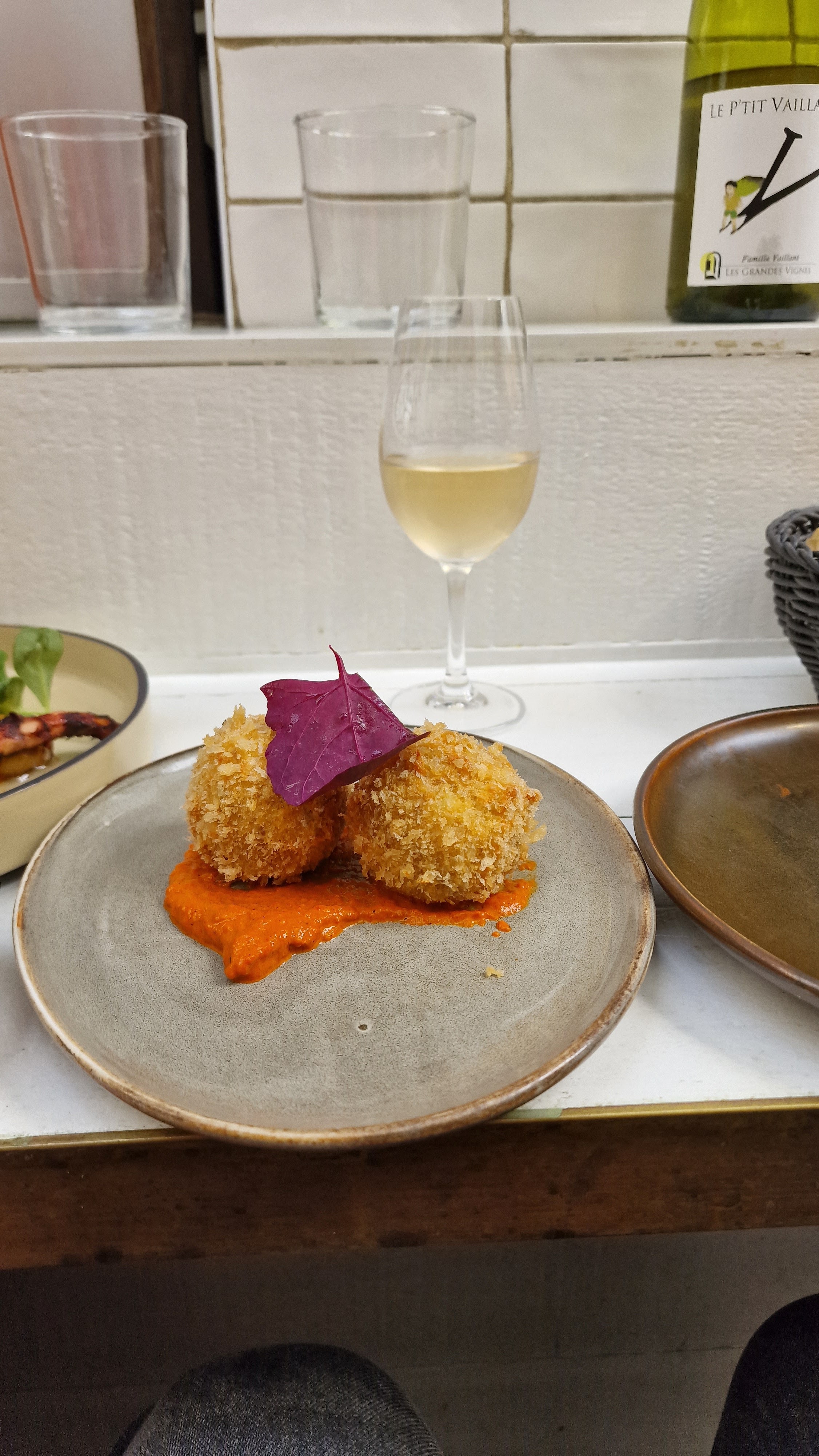 Très bonne cuisine avec des plats très originaux ! (Huîtres panées, pied de cochon frit revisité, etc…) Pour notre part nous avons pris de l’ormeau et du poulpe, délicieusement cuisinés, une croquette accompagnée de sa petite poivronnade très rafraîchissante !! Le tout avec un petit rosé exceptionnel !! Un rosé non filtré, vin nature avec des notes fruitées ! Les desserts sont succulents !!! Ganache très chocolatée avec pistaches, et mousse de citron infusée au foin ! Il faut tout de même un petit budget, et on mange à la bonne franquette, au comptoir 🤗 On y retournera pour sur !!