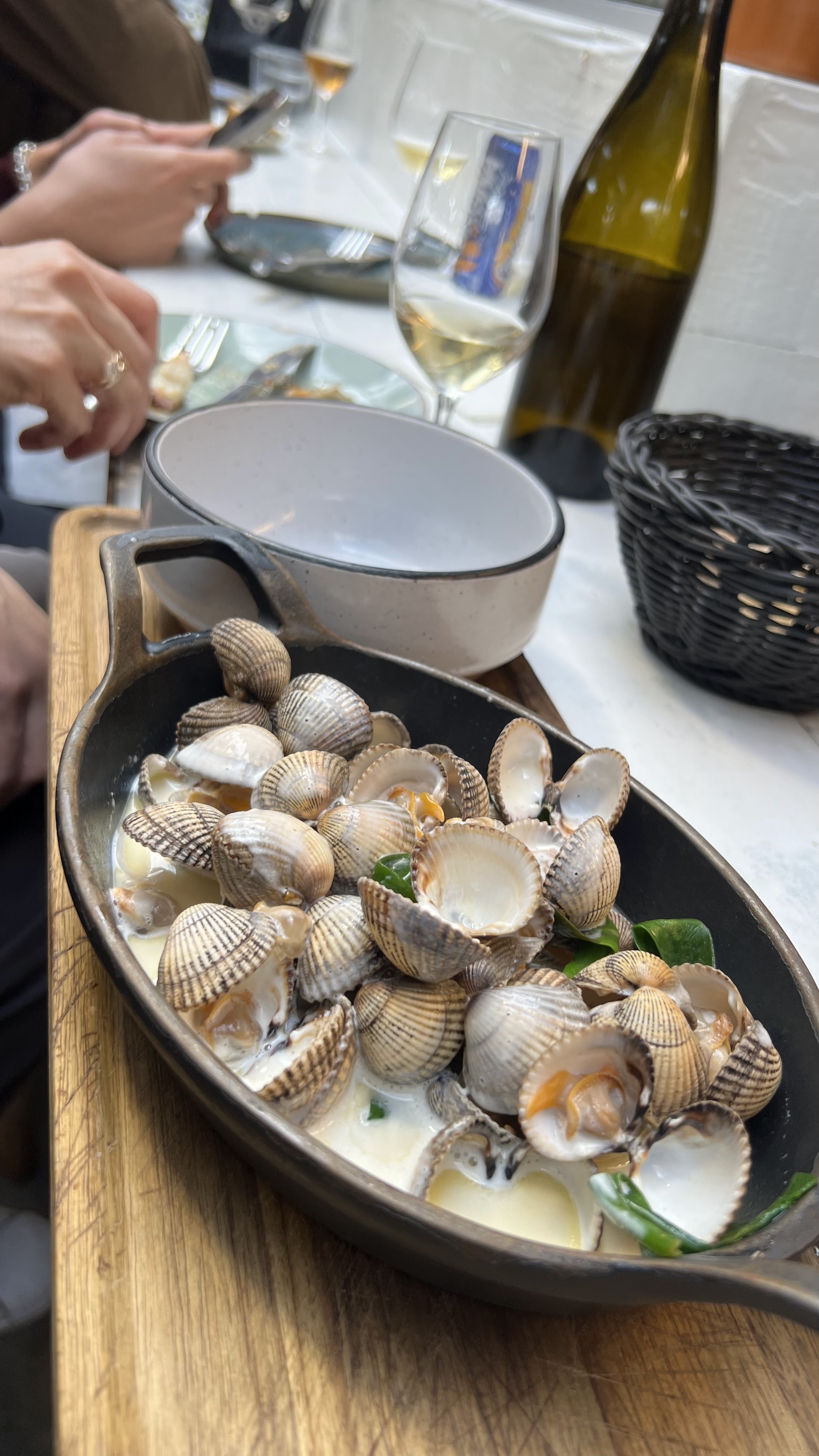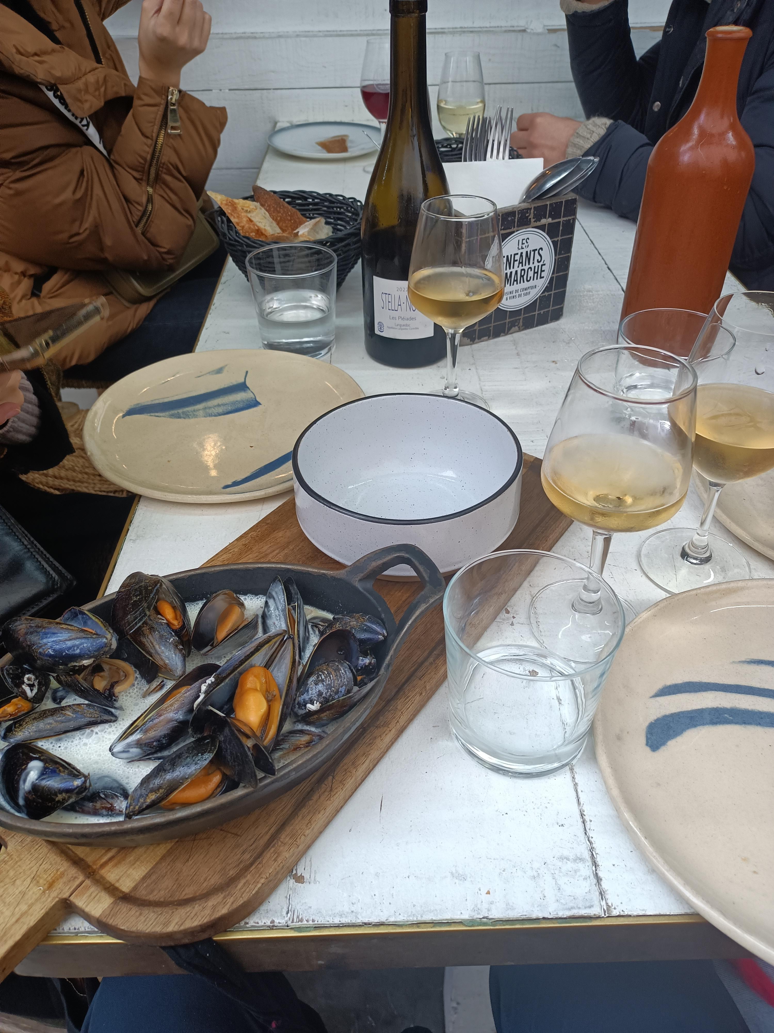 Nous sommes arrivés à 11h30 juste avant que les gens commencent à arriver, nous n'avons donc pas besoin de faire la queue. Nous avons commandé 3 verres de vin, des moules au fromage et des pétoncles. Les fruits de mer y sont incroyables. Nous avons dépensé environ 80€ ensemble. C'est vrai que c'est un peu cher mais ça vaut le coup.