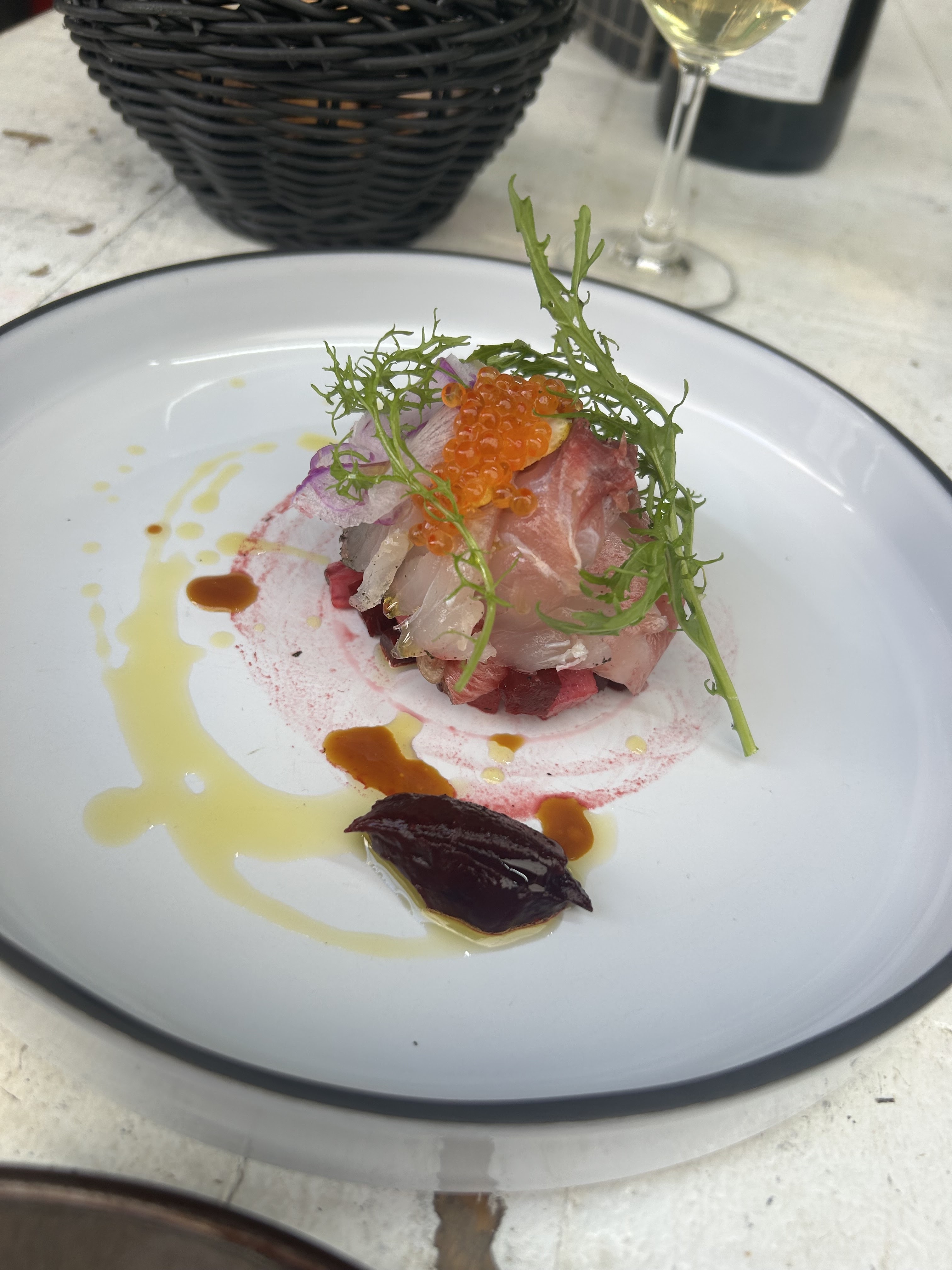 Parmi les meilleurs fruits de mer que j'ai jamais mangé. Il y avait une assiette de bonite (un poisson semblable au thon) avec de la burrata et une assiette de ceviche de maigre. Une finesse et une pureté incroyables, bien au-delà de la plupart des restaurants étoilés Michelin que j'ai essayés. Nous n'avions pas trop faim car c'était le déjeuner et il faisait chaud alors nous avons juste partagé ces deux assiettes et chacune un verre de vin totalisant environ 50 euros, parfait, puis nous sommes allés sur la route pour un dessert chez Pierre Herme puis un café. J'y retournerai c'est sûr. Le menu n'était pas très clair pour moi mais j'ai juste demandé au personnel et suivi leurs recommandations, alors demandez-leur simplement.