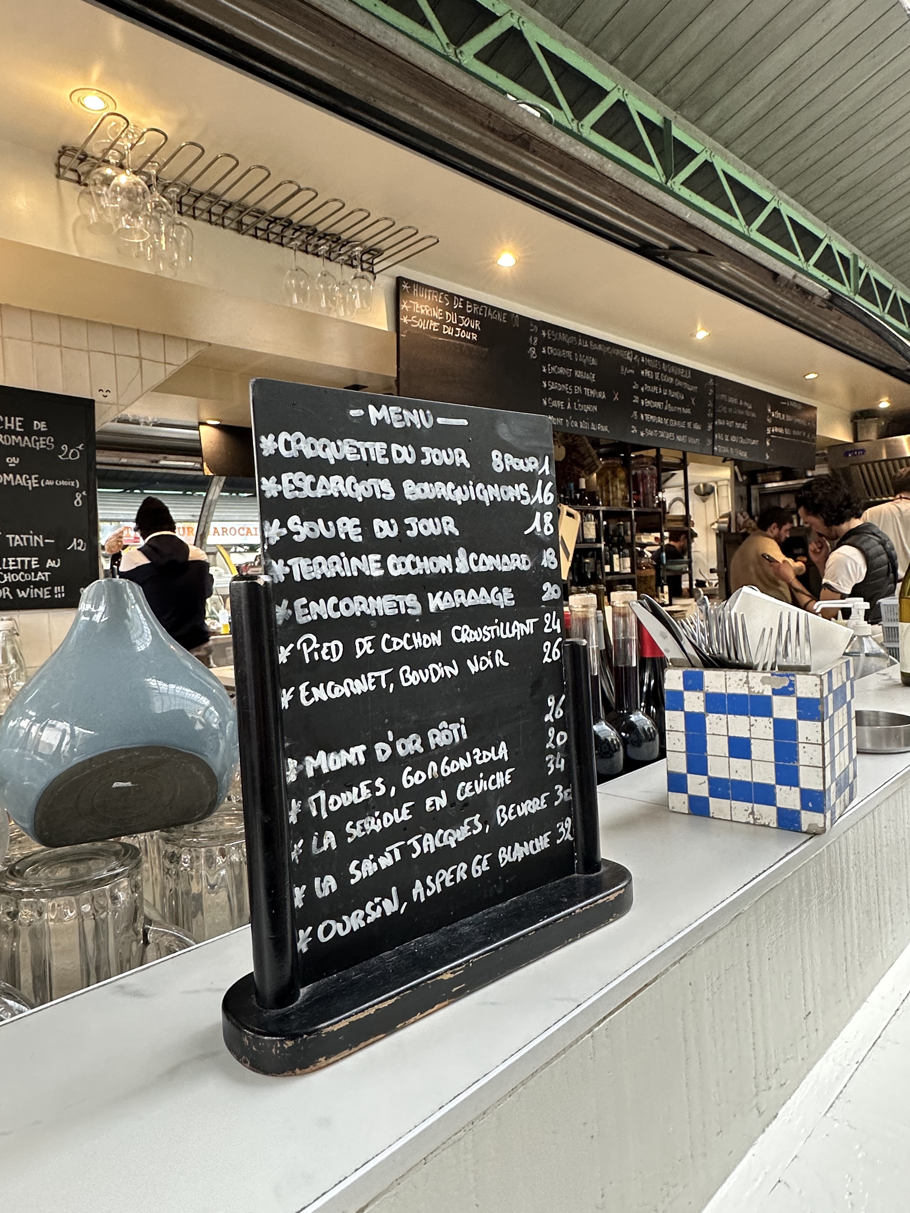Belle cuisine de comptoir avec des produits de très grande qualité. Les abats occupent une place de choix sur la carte qui change souvent. Du côté vin une belle sélection sourcée à partir de 6 euros le verre. Un peu cher néanmoins (plats de 12 à 32 euros) mais c'est sans doute le prix pour ces produits et cette façon originale de les cuisiner. Attention, marché oblige, il peut y faire frisquet !