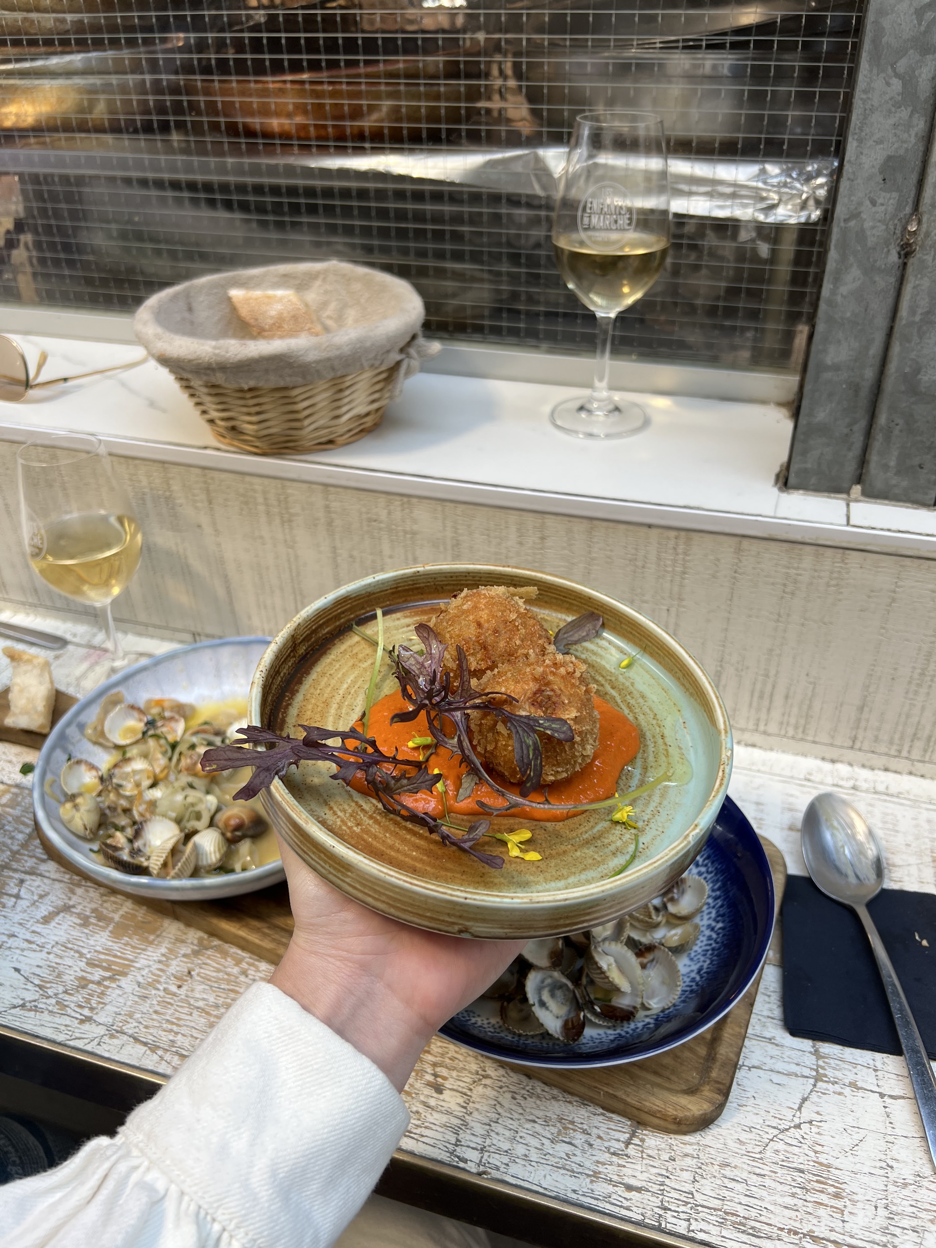 J'adorerais voir plus d'endroits à Paris comme Les Enfant Marche, simplement de la bonne cuisine avec des ingrédients frais et sans engagement sur le nombre de plats que vous commandez. Si vous n’aimez qu’un seul plat, vous pouvez simplement en commander un et en déplacer un. Cependant, la carte est toujours aussi bonne qu'il est impossible de n'avoir qu'un seul plat, nous sommes venus ici avec envie d'un repas léger et avons fini par commander 4 grands plats. Ma préférée du jour est la croquette de pieds de porc, elle n'est pas très appréciée de tous (beaucoup de gélatine et de cartilage mou) mais vaut certainement le détour et l'attente. Tous les plats sont à base de meilleurs produits de saison, nous avons eu les morilles et asperges farcies et c'était délicieux.