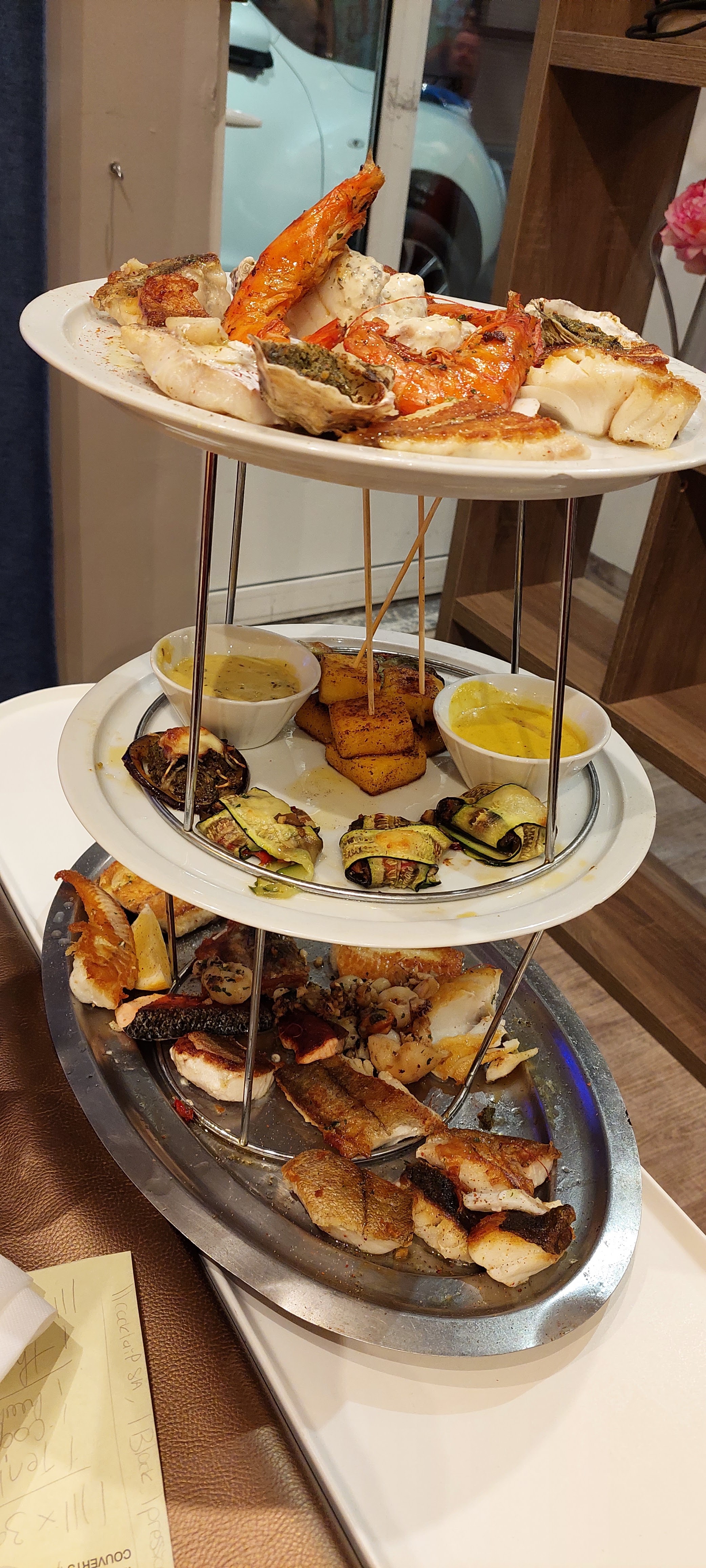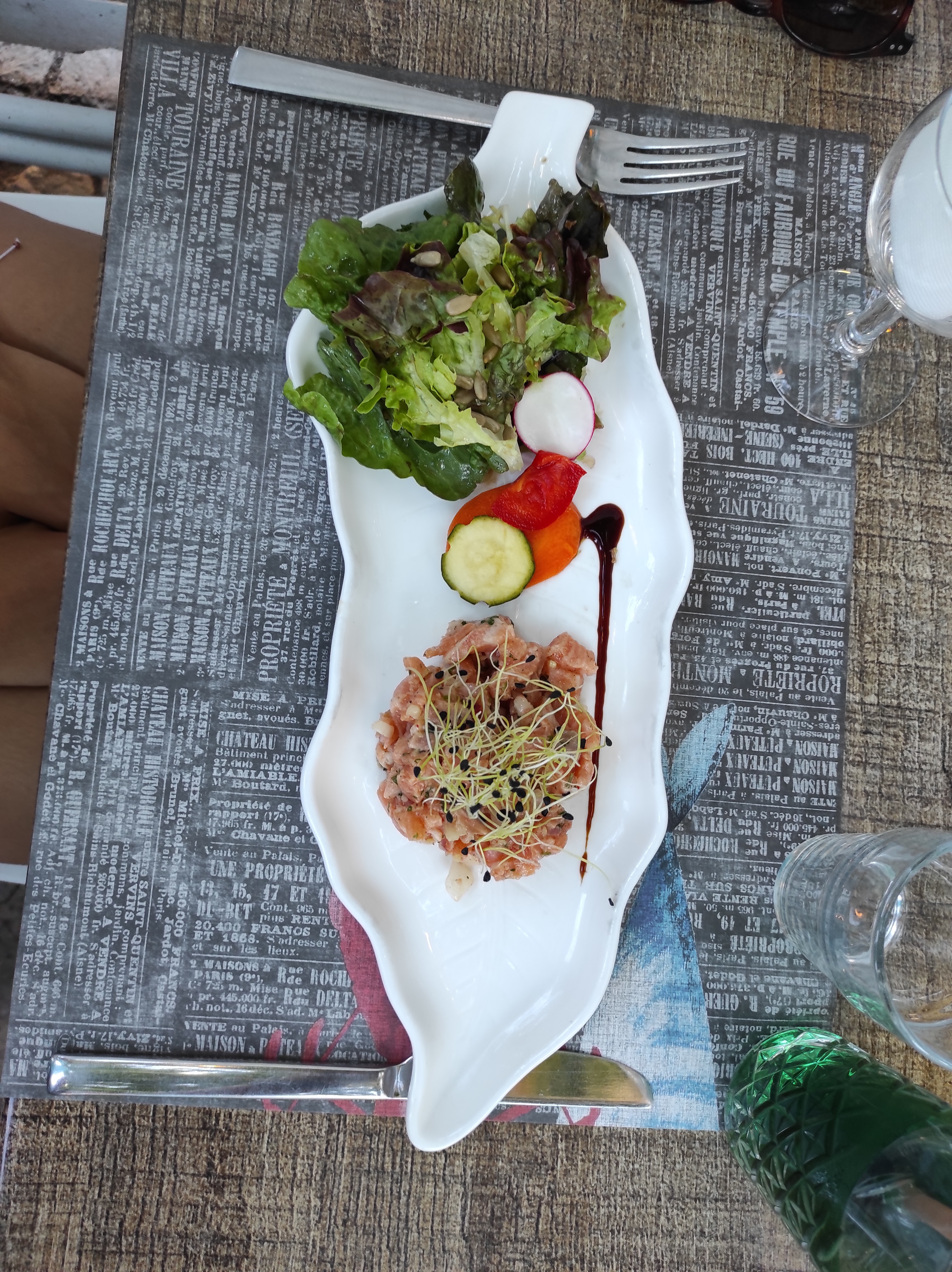 Bon accueil bon repas surtout la charcuterie de la mer et les tentacules . Mais Le service est un peu tendu ! Bouteille d eau demandée et oubliée, bouteille perrier demandée lors de la prise de commande et pas servie ! Pas de poivre ni sel ! La serveuse n écoute pas et regarde ailleurs ! Boules de glace à moitié formées, donc pas entières !