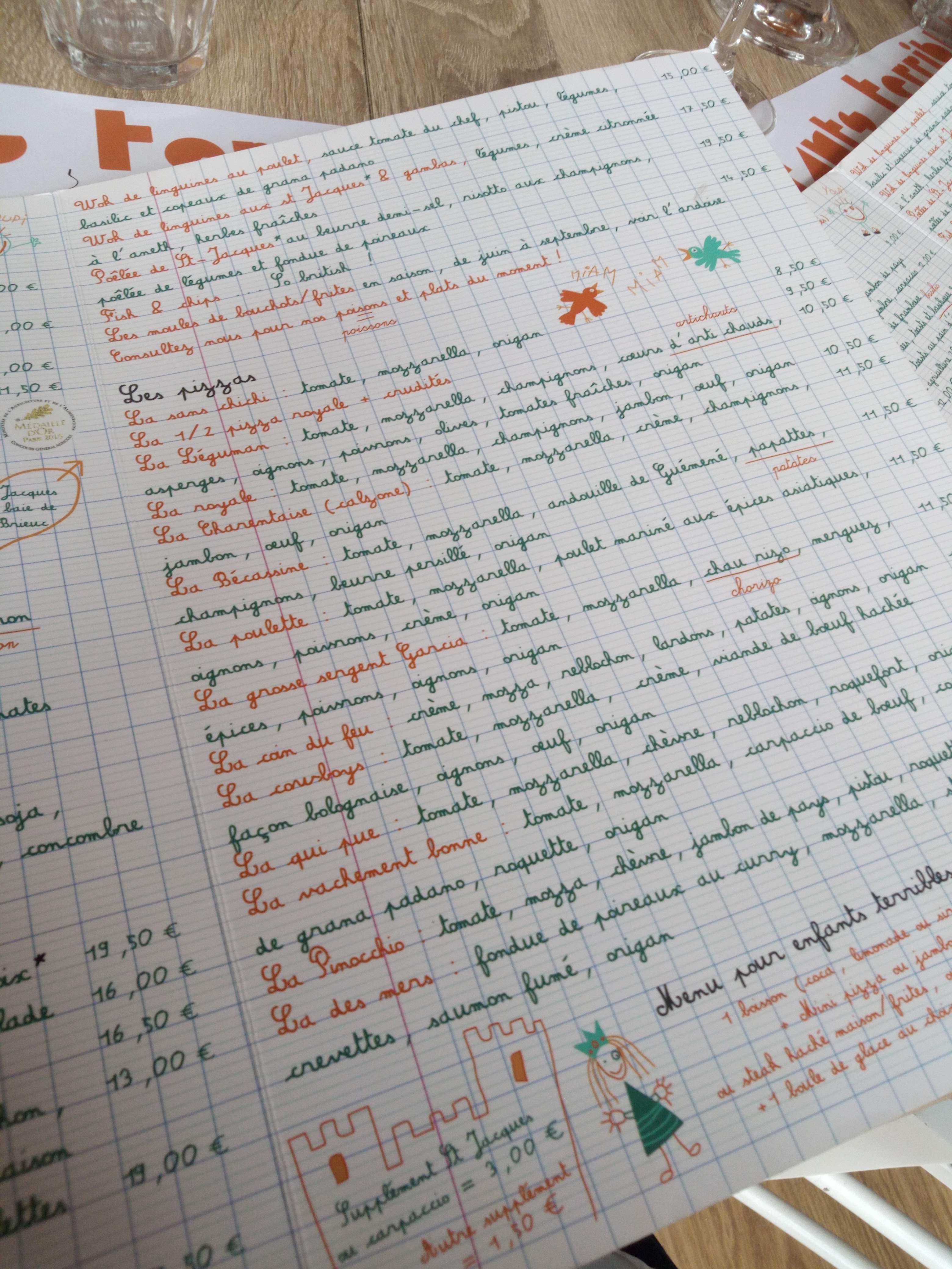 Restaurant original avec mots et dessins d'enfants. Carte variée et plats exvellents. Le sourire en plus, à recommander