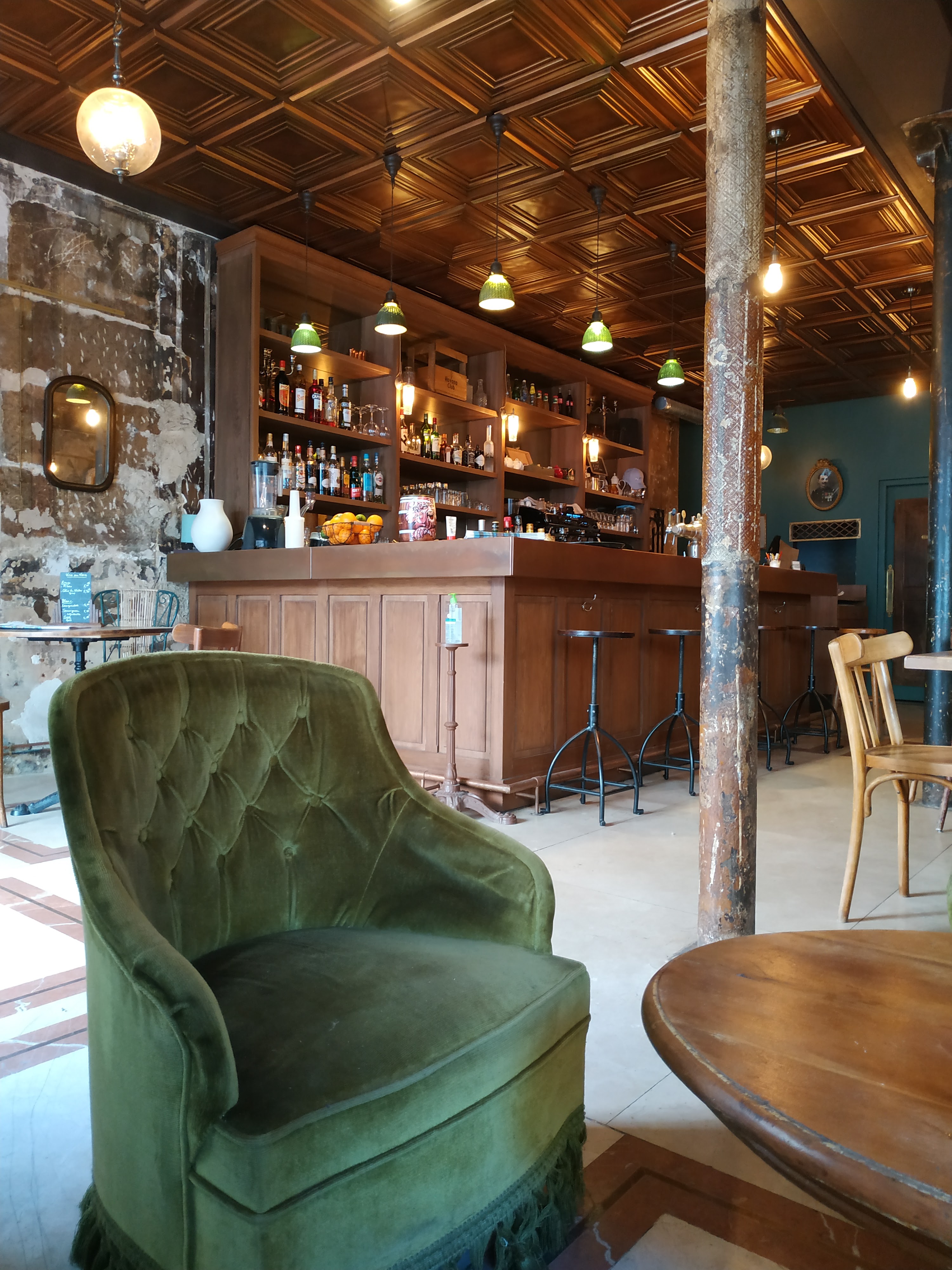 Très joli café/bar à vin avec des intérieurs intéressants.