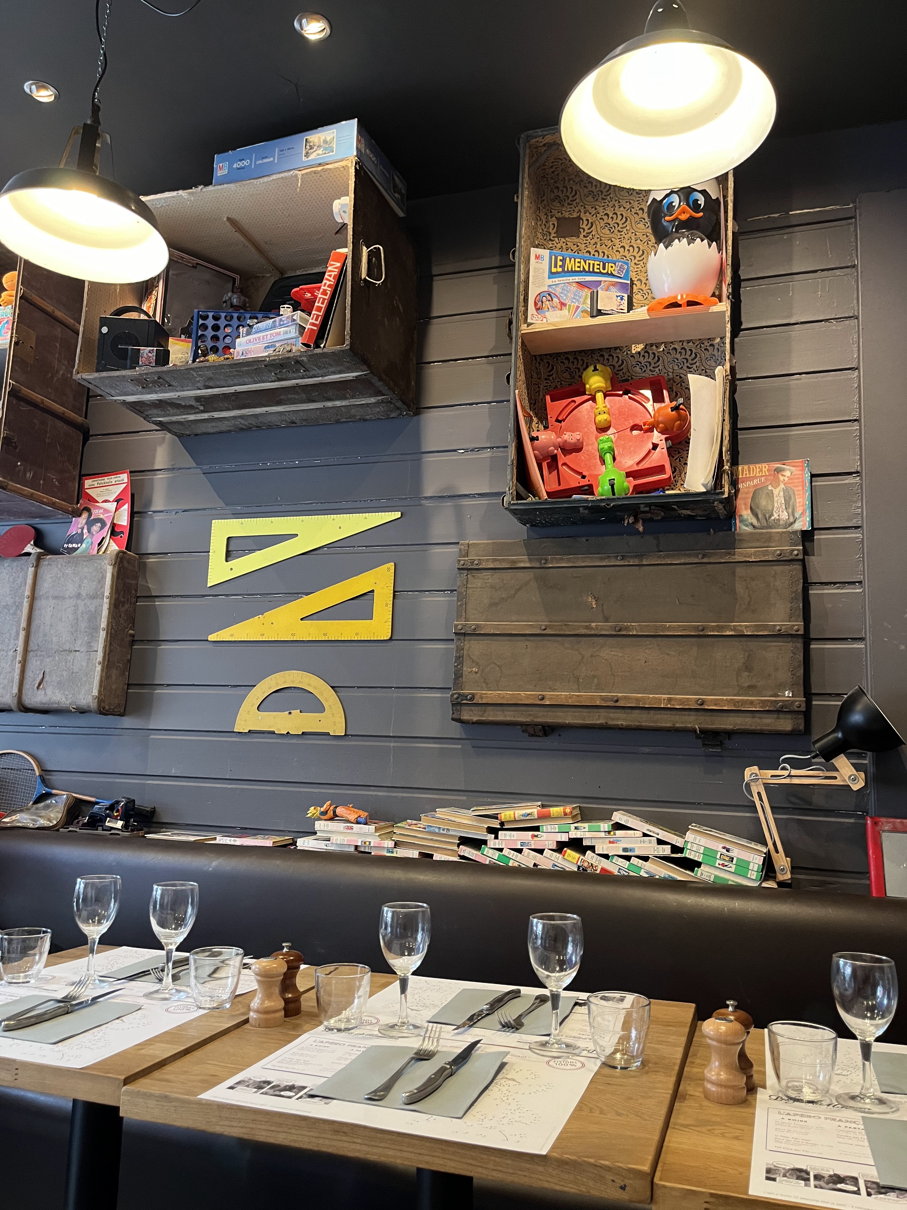 Bonne cuisine, dans une ambiance vintage qu'on adore !! Génial le coup du petit bac sur les sets de table en attendant l'apero 😊