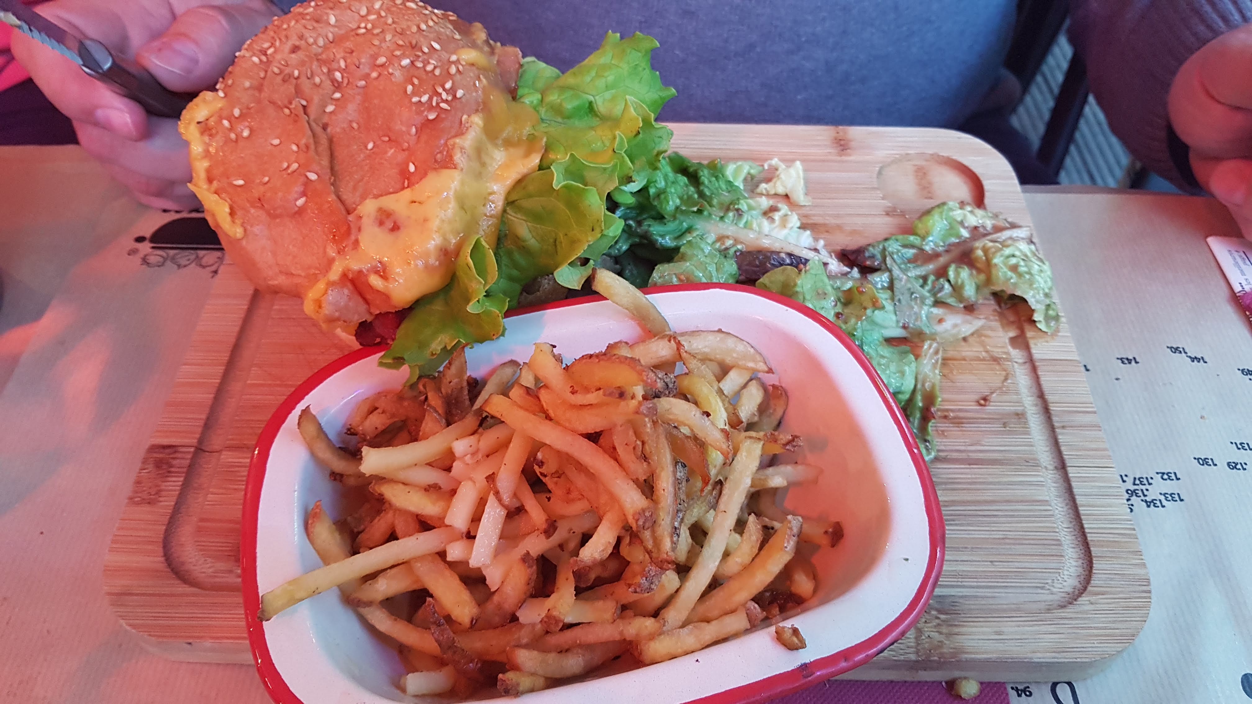 1h pour la commande, 30' après l apéro.. presque 2h et pas encore de plat.. et quand ils t apportent le plat c'est sans frites mais en contre partie full salade avec le burger 🤣 PLUS JAMAIS JAMAIS ! De plus zéro excuse..