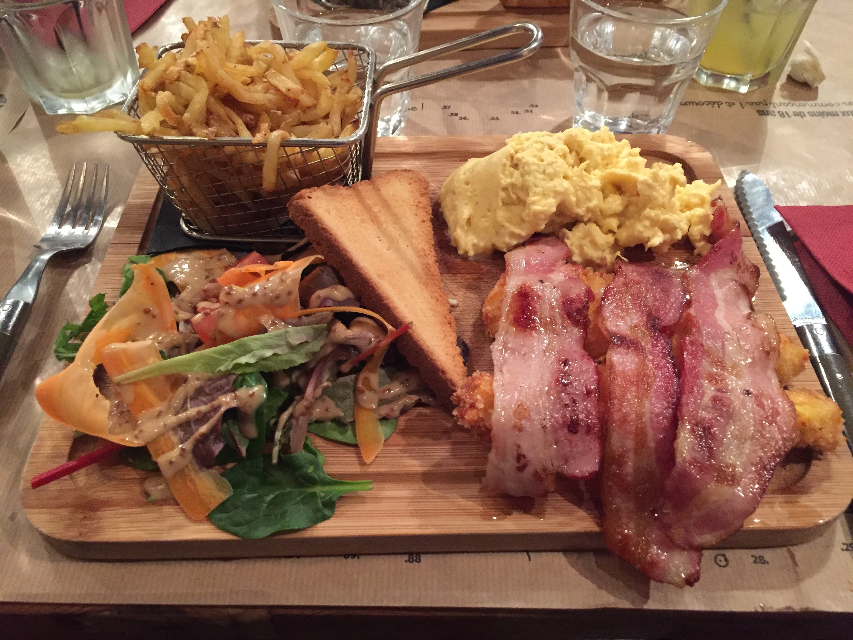Un croque madame avec une tranche de jambon si petite et si fine que j ai eu l impression de ne manger que du pain ,un tiramisu avec des boudoirs sec et une mascarpone très sucrée, voilà pour ma part les autres convives de ma table n étaient pas ravis plus que ça de leurs plats.Des serveurs agréables.