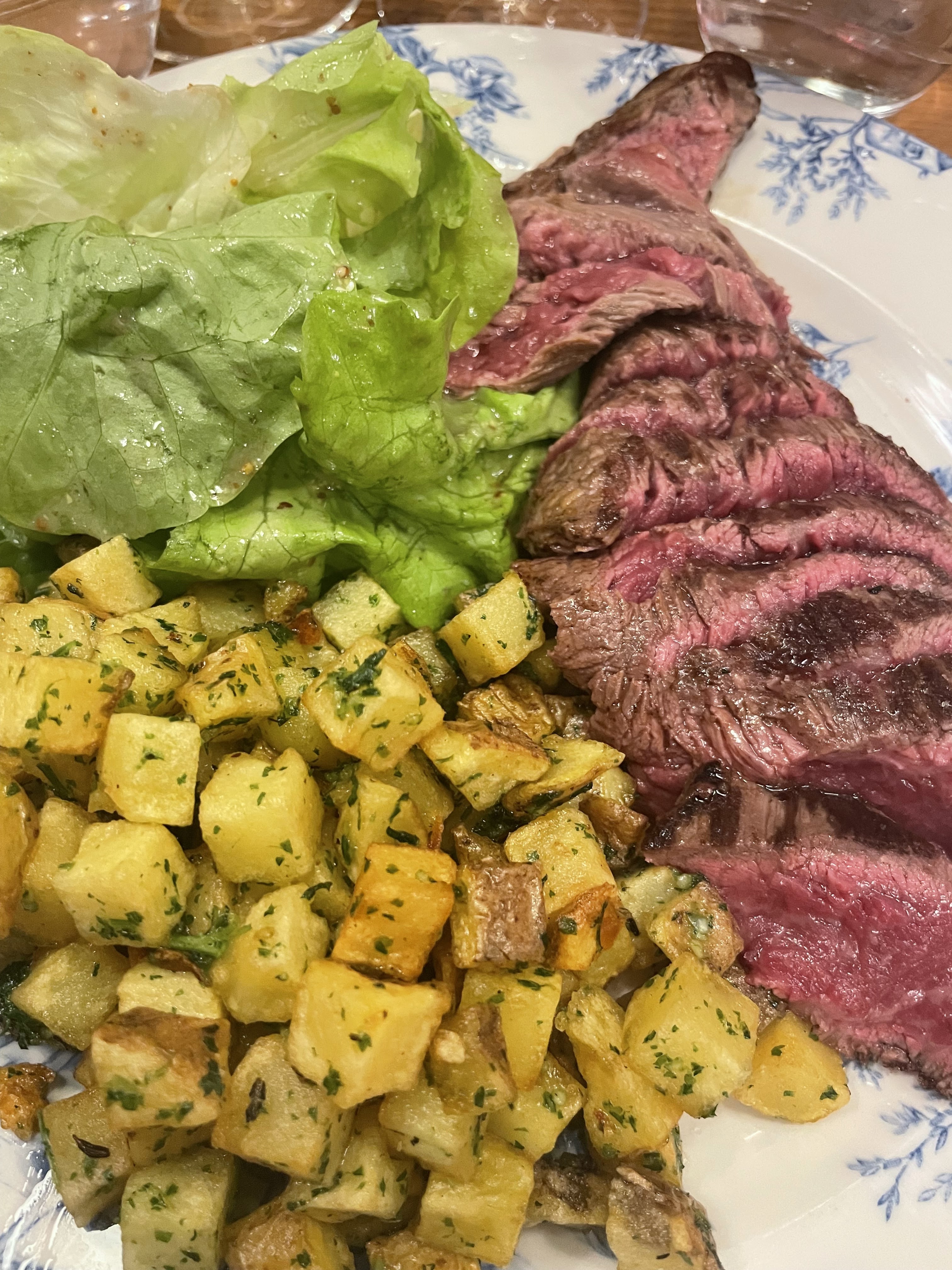 Ambiance chaleureuse et décoration atypique. Service aimable, rapide et efficace. Hampe de bœuf avec frites et salade servis avec une super sauce au poivre. (Petit bémol pour la cuisson du bœuf qui aurait put être plus homogène) Tiramisu au Kinder vraiment fantastique, crème onctueuse et arrière goût du Kinder très agréable. Le tout pour 16€ ! Une perle de Paris ! 🍽