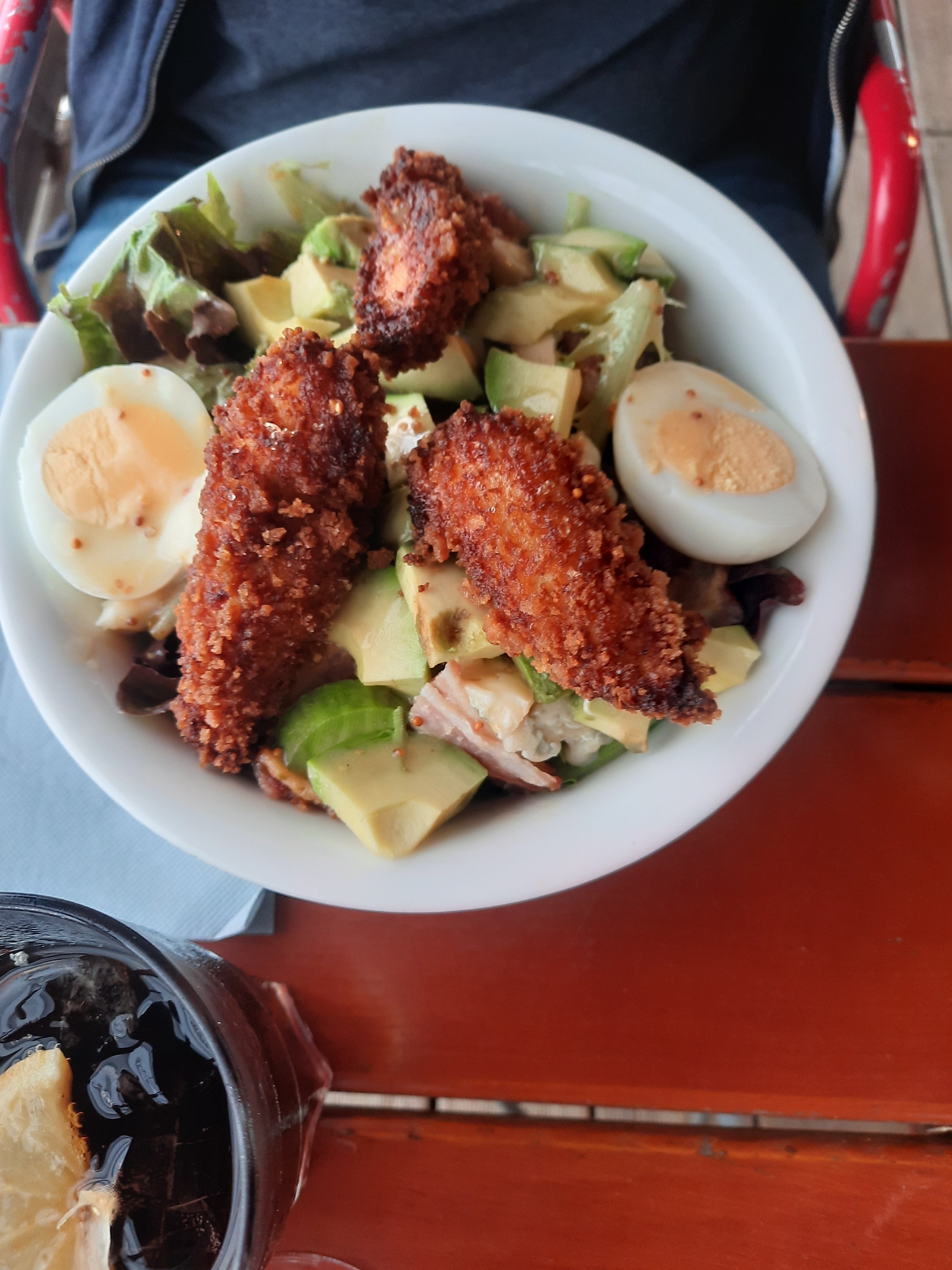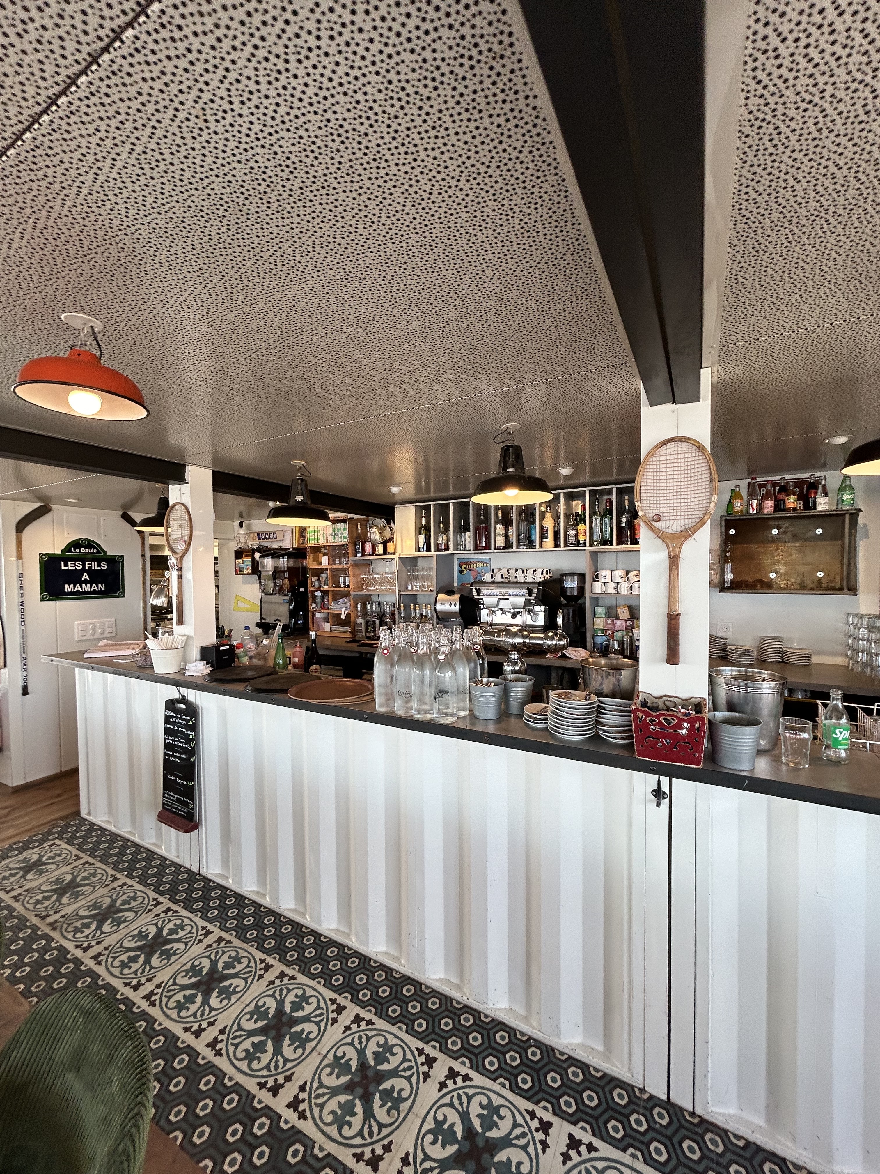 Situé à même la plage, Les fils à maman fait partie d'une chaîne d'établissements qui propose des plats qui a pour objectif de nous ramener à notre enfance. Que ce soit via les plats proposés (coquillettes au jambon, parmentier et autres cordons bleus) via la décoration typique du lieu (typique des années 80), et via même la mise en page de la carte, c'est plutôt réussi 😉. Du coup, le cordon bleu (plus élaboré que dans mes souvenirs) commandé, précédé d'un bon spritz, ont fait le job. Le dernier bon point: être au niveau de la plage offre une superbe vue sur l'Océan.