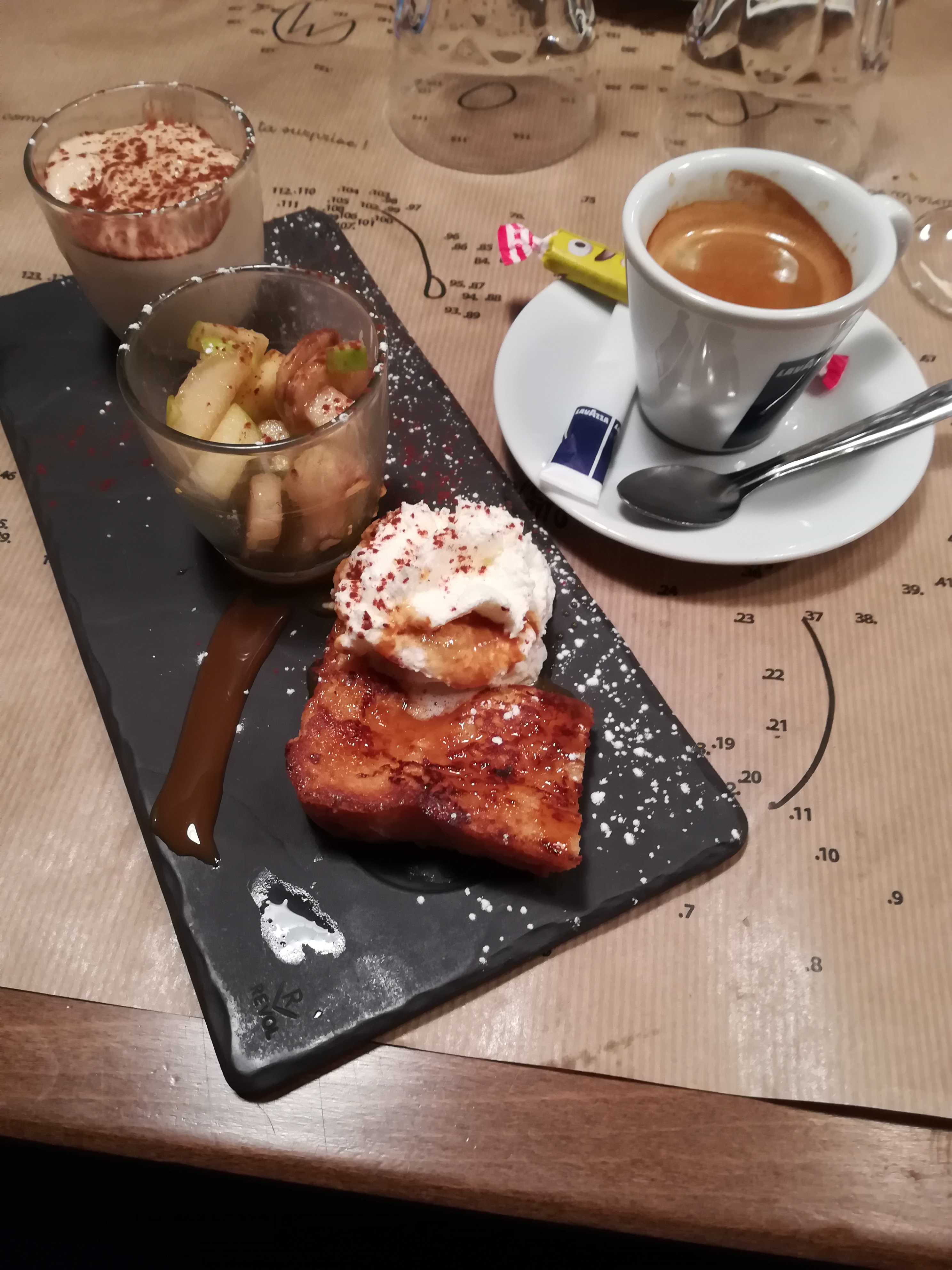 Nous avons été déçus par les portions de dessert au regard des prix pratiques : la tarte chocolat est minuscule et le croissant perdu était très très sec... Très décevant. Et le service entre le plat et le dessert était très long.... Bonne journée
