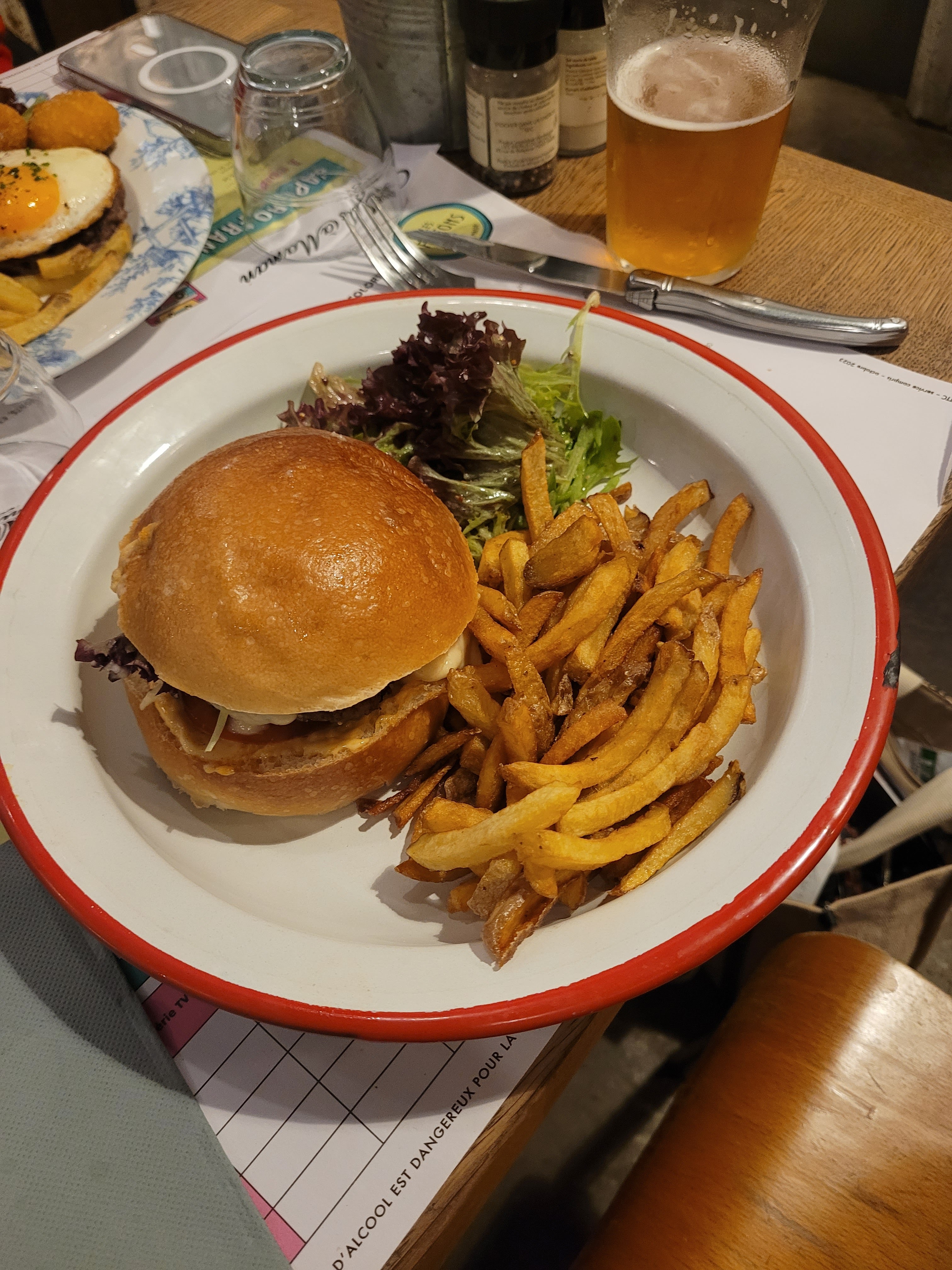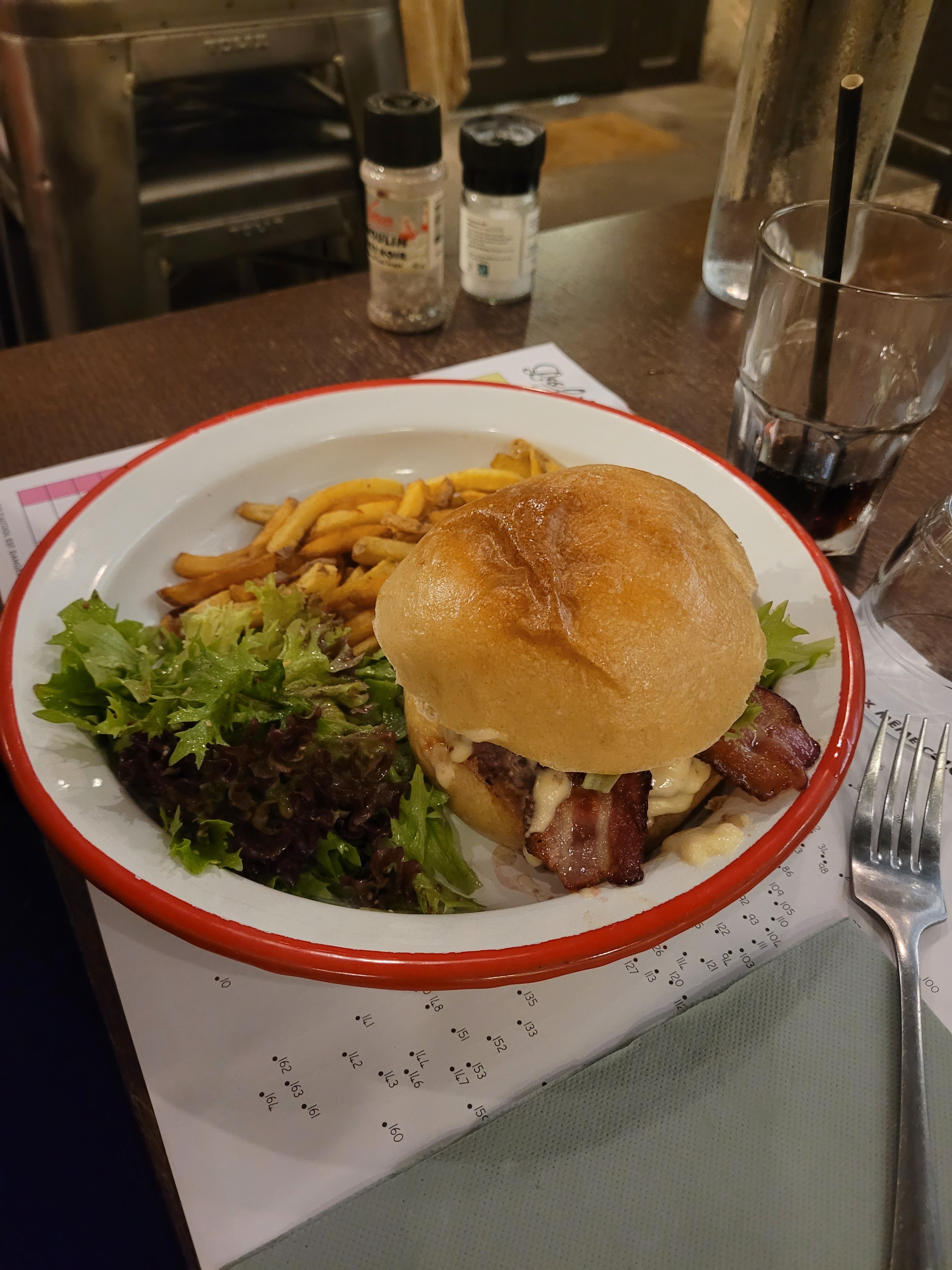 Le thème est top pour les nostalgiques, la déco, jusque dans le menu, je valide à 200% L’accueil est super ! J’ai pris un cordon bleu (même avec l’âge j’adore toujours ce plat) mais je trouve qu’il n’était pas assez garnis de fromage à l’intérieur ce qui rendait la viande un peu sèche par endroit. L’hamburger a été pris par mon compagnon avec supplément bacon, bon mais sans plus.