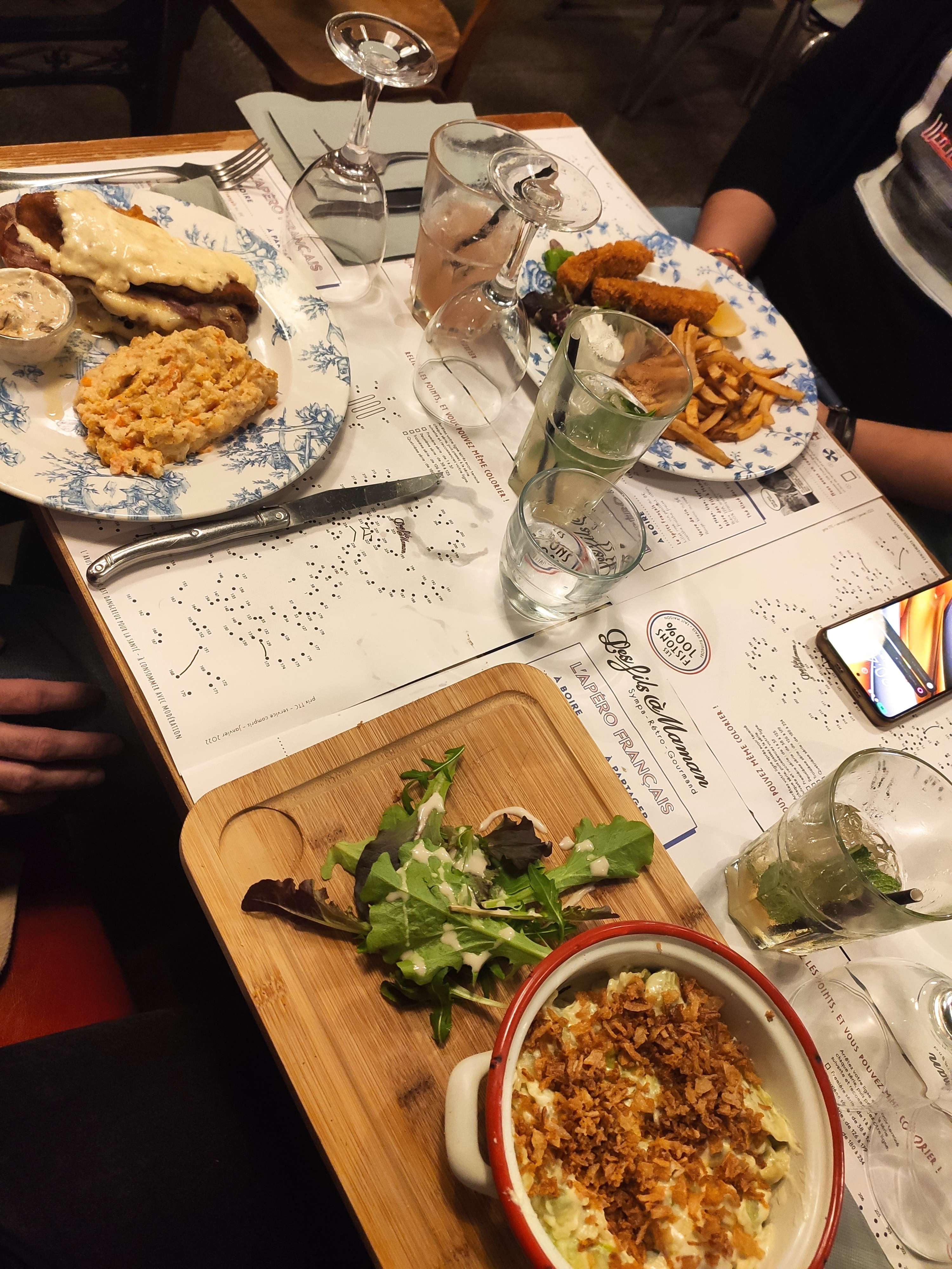J'avais déjà essayé les Fils à Maman dans une autre ville, j'ai trouvé celui de Nantes avec une déco un peu moins fun (il y a des rappels mais c'est plus léger que ce que j'ai vu ailleurs). Les coktails sont peu chargés on sent beaucoup plus l'eau gazeuse et l'accompagnement que l'alcool. Les plats étaient bons mais je les ai aussi trouvés un peu en dessous (désolé j'ai une comparaison donc forcément), c'était bon mais par exemple la parmentier de porc pas du tout grillé, donc moins fun. Les desserts sympas mais pareil je les ai trouvé un peu moins bons. Le service est bien et rapide, mais pas d'échanges c'est mécanique comme service. Donc un peu mitigé par rapport à ce que j'ai connu ailleurs.