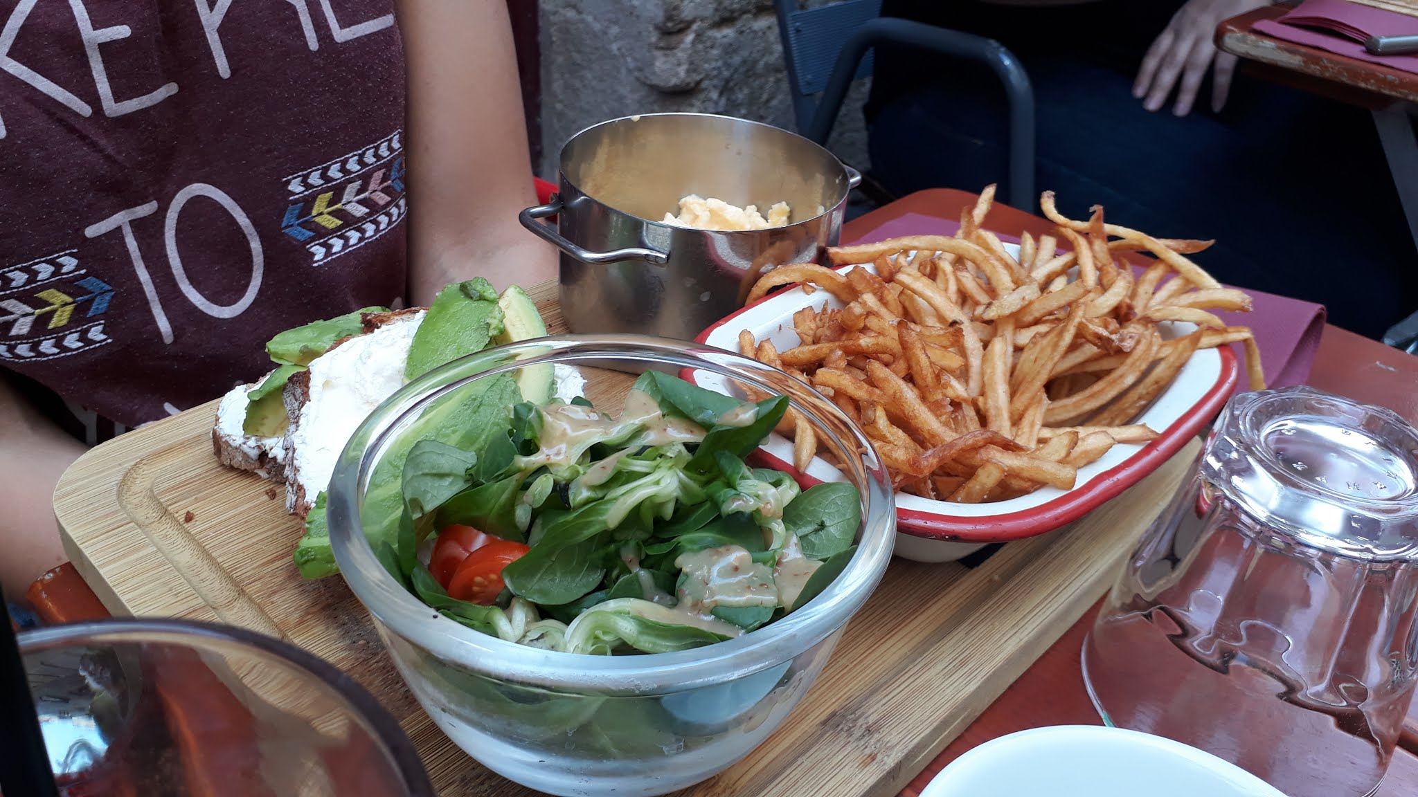 Très sympathique !!! On a pu venir en poussette avec notre bébé. Le serveur était très sympathique (et chantonnait). Le jambon dans notre salade était de très bonne qualité et le plat était délicieux également (top les frittes)