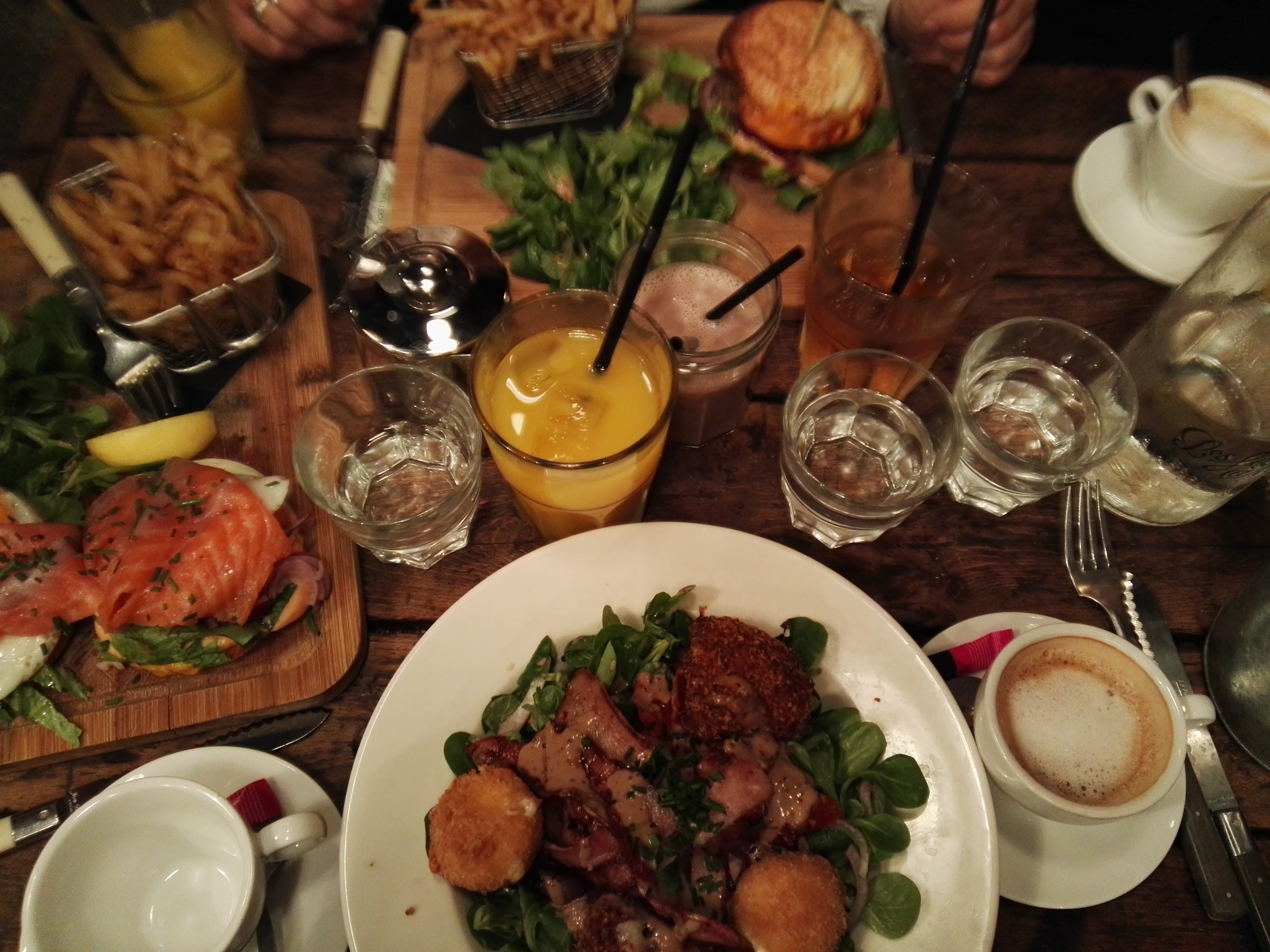 Le fish'n chips de ma fille était correct. Pour ma part j'ai choisi les tartines au saumon fumé, dont la photo était très appétissante sur la carte. Cruelle déception : les tartines étaient toutes petites, les tagliatelles de courgette qui ondulaient en longs rubans sur la photo se résumaient à 2 mini-bouts de courgettes, et seulement 3 petites pommes de terre coupées en deux... j'ai trouvé que 18€, c'était bien cher payé. Je l'ai fait remarquer au serveur, qui n'a pas eu l'air d'apprécier... nous avions une table à l'extérieur, et tant mieux car à l'intérieur, tables très serrées et beaucoup de bruit.