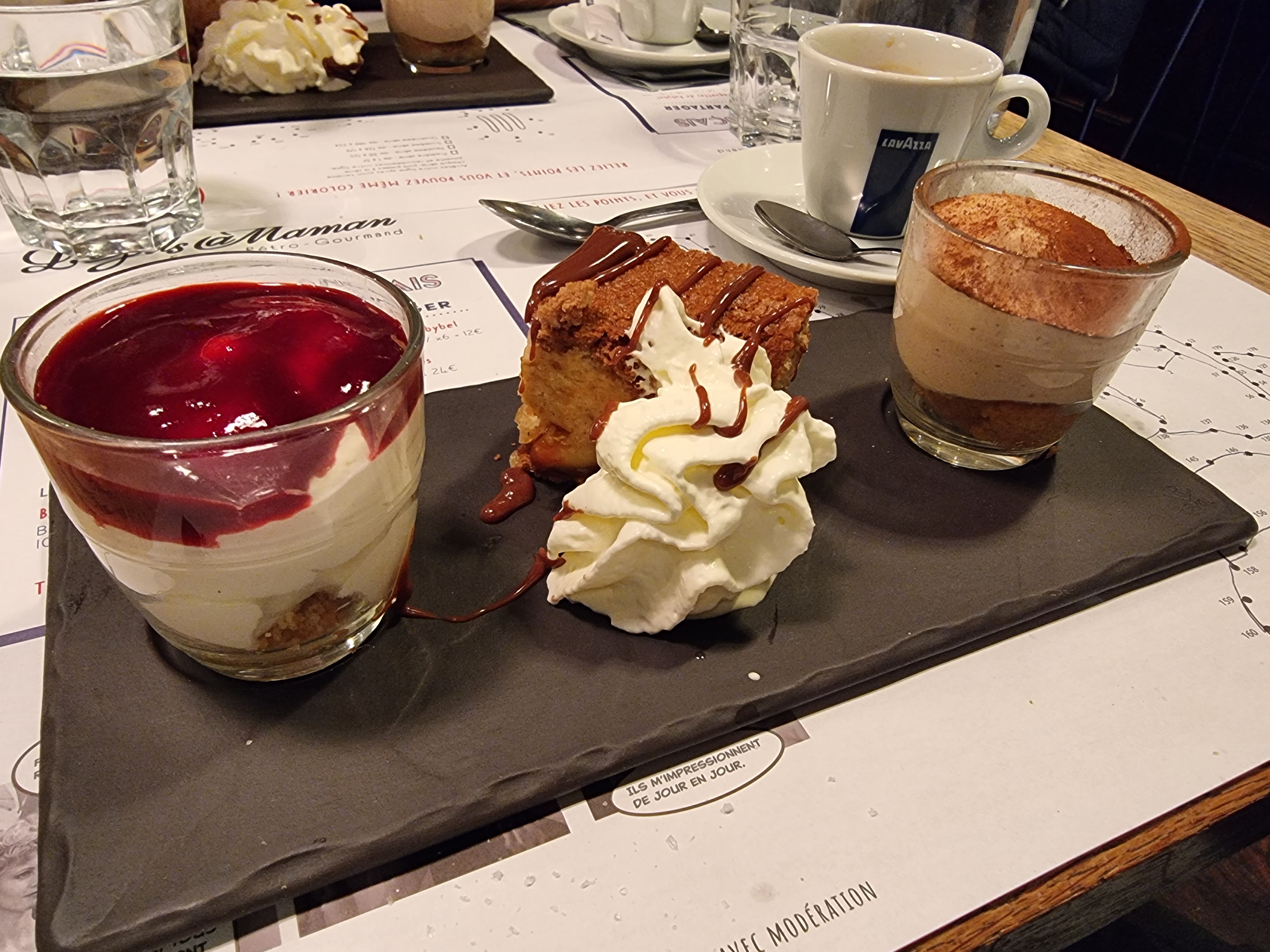 Un peu cher + de 30€ pour apéro, plat, dessert Le hamburger était très bon. Mont blanc avec trop peu de crème de marron Croissant au four (pris par ma voisine), ne ressemble pas à un croissant, pas appétissant et avec manque de caramel. Desserts dans l'ensemble pas top mis à part le café gourmand