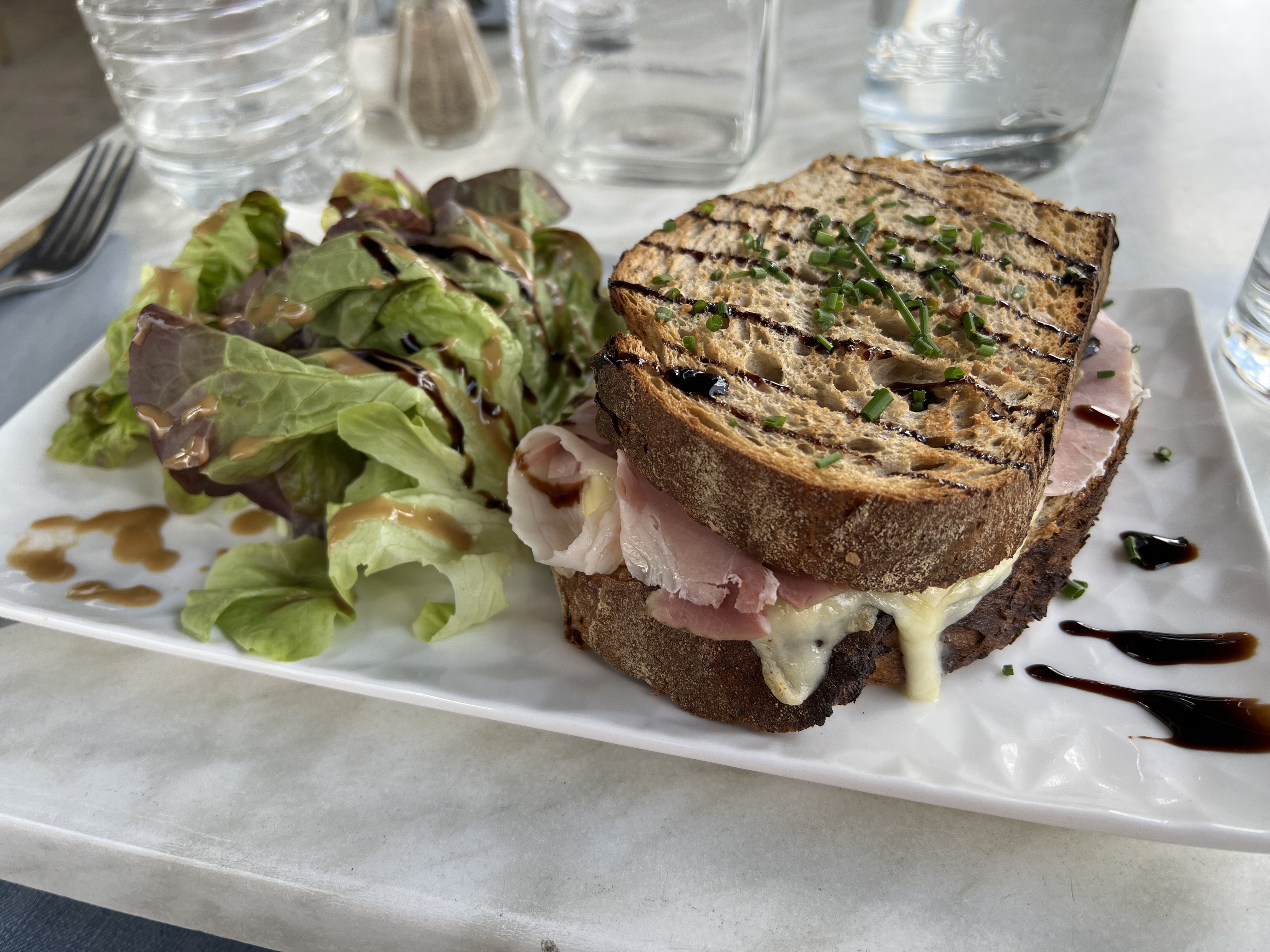 Après avoir lu de très bons commentaires nous sommes déçus de notre repas. Nous avions commandé des côtelettes de brebis qui au goût sont bonnes, mais très très ferme. J'ai voulu mettre de la sauce en accompagnement de mes frites, un tiers du pot des sauces individuelles poser sur la table était périmé de février à juin 2022. Nous l'avons signalé, on nous a répondu: On le sait mais elles sont encore consommables. Je suis très surprise de sa réponse, il me semble que les dates ne servent pas à rien sur les aliments. En dessert nous avons pris une brioche perdue au cognac caramel beurre salé. La consistance de la brioche fait penser plus à un flan qui est très bourratif servi avec une glace café. Et pour couronner le tout mon dessert a été servi avec deux cuillères collé l'une sur l'autre que j'ai remarqué juste après ma première bouchée. Et quand je les ai décollé je me suis rendu compte qu'elles étaient sales de chocolat. Le patron qui discutait avec nous au même moment à remarqué également il ne sais même pas excusé. J'ai dû lui demander une cuillère propre. Contenu du prix on s'attendait quand même à mieux. 22 euros le plat 11 euros le dessert Le point positif de ce repas c'est que les frites sont excellentes.