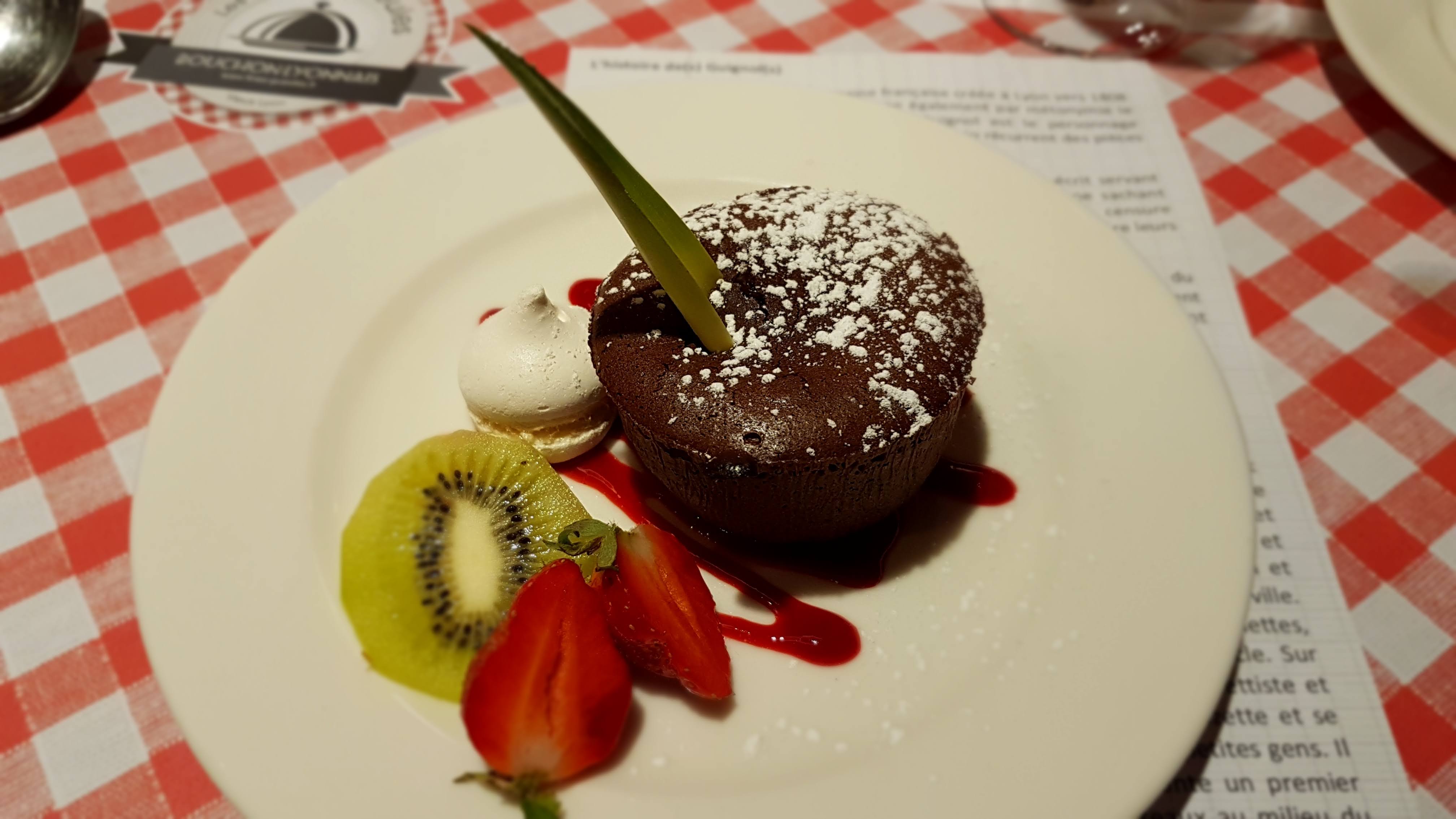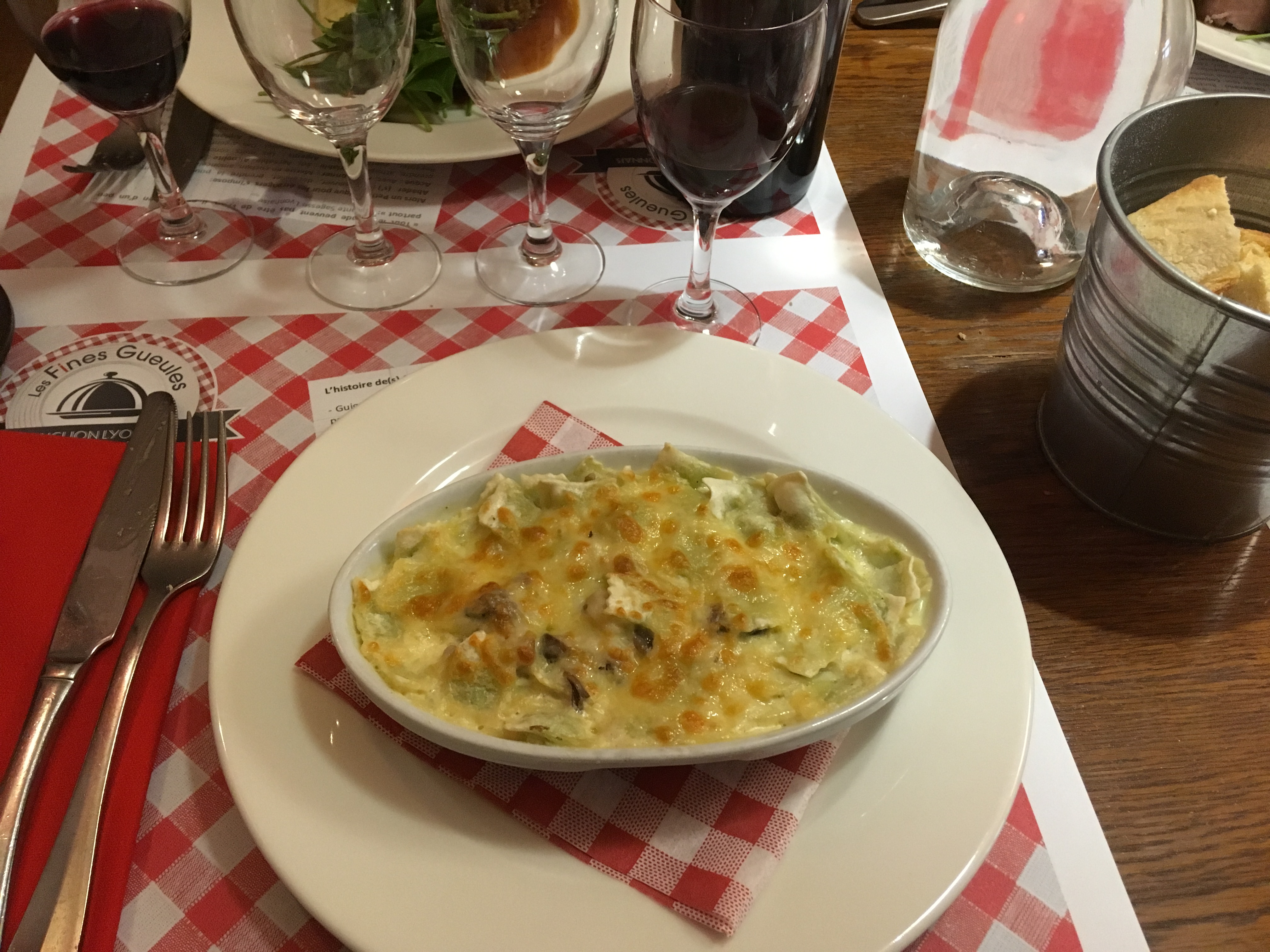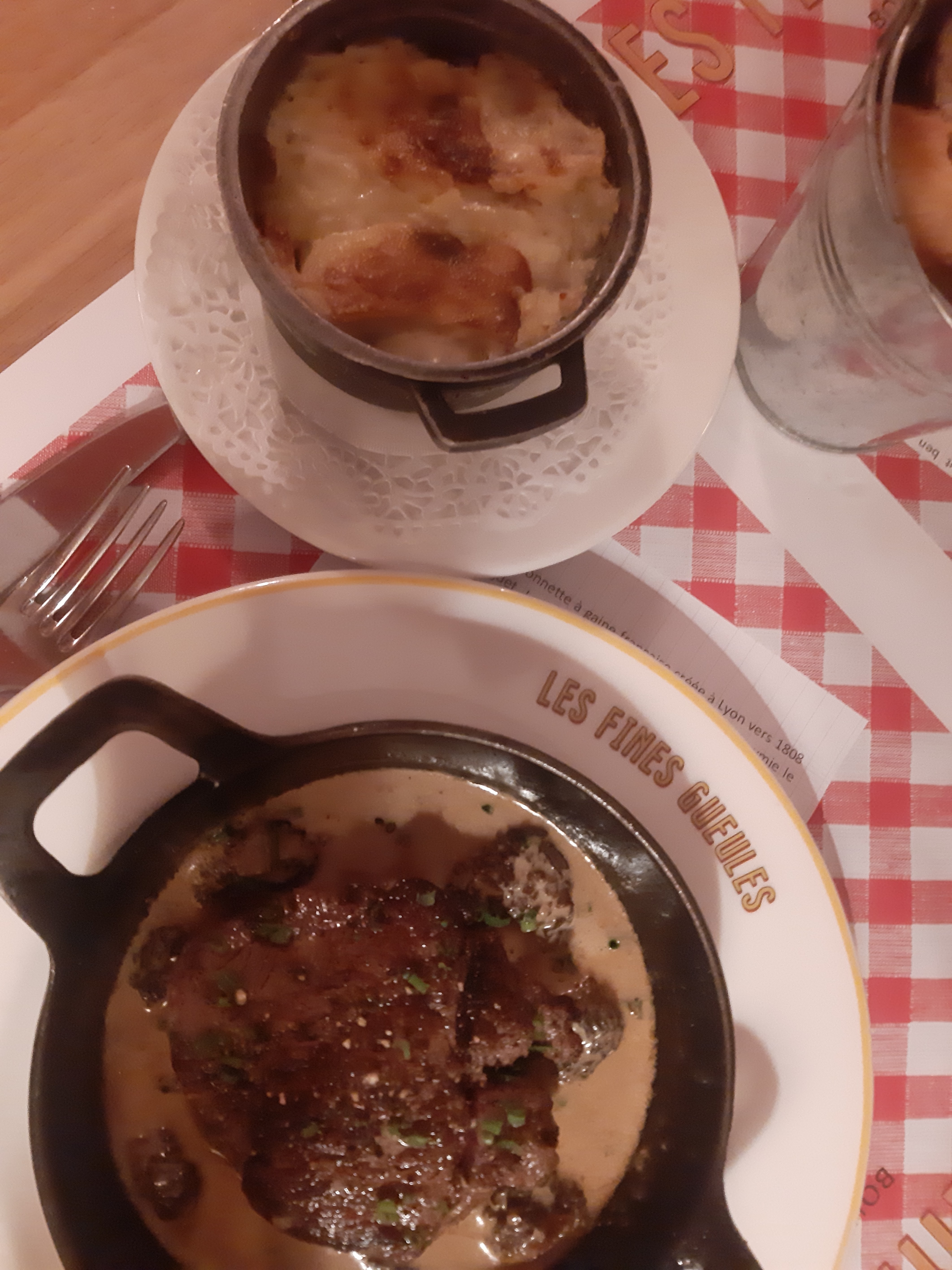 Très bon Bouchon lyonnais ! Belle découverte. Au menu escargot, paté de queue de boeuf, quenelle, ravioles de roman gratiné, andouillette, salade de fruits, fondant au chocolat, tartelette aux pralines.