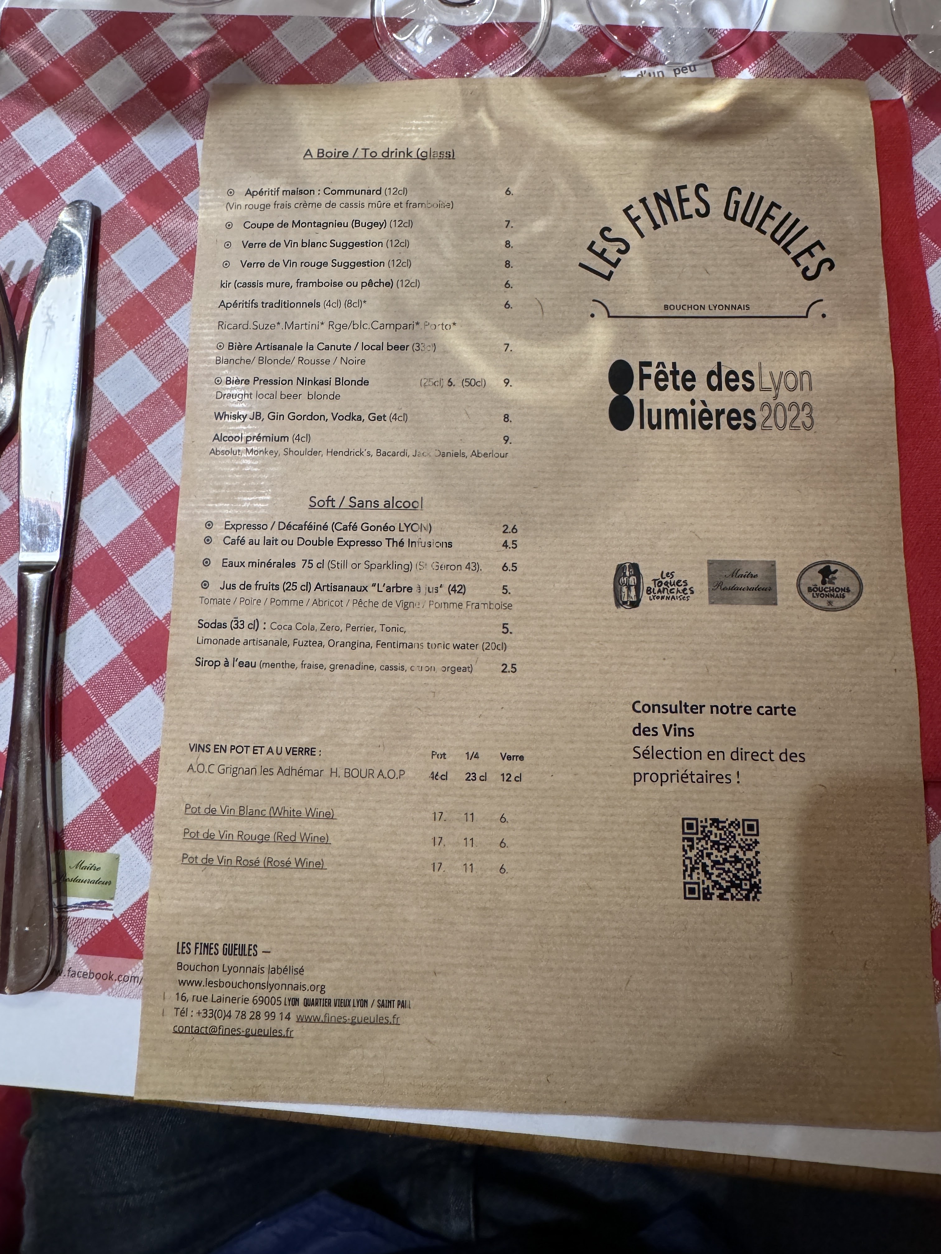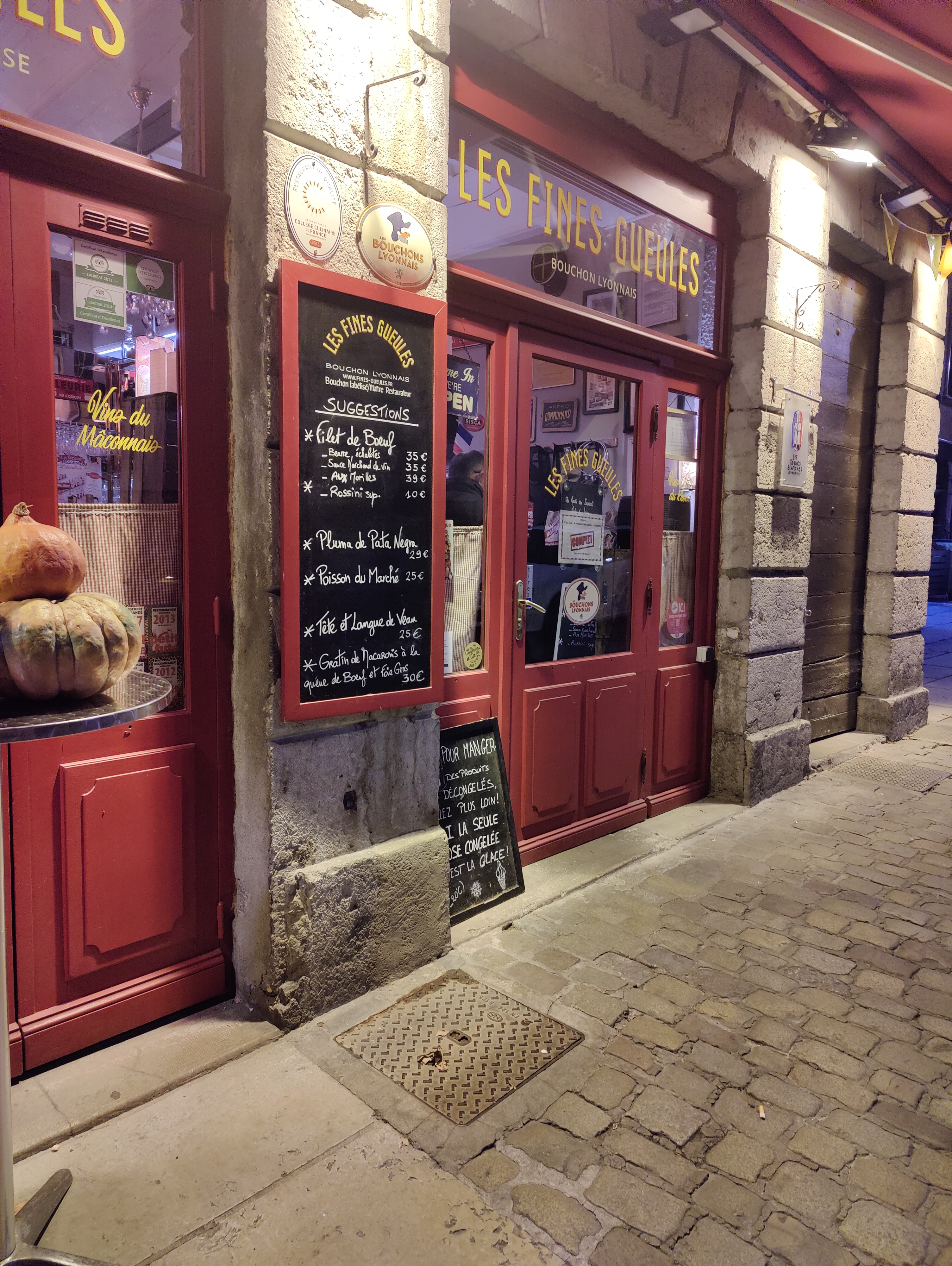 Épicurien, j’ai eu 2 expériences culinaires inoubliables dans ma vie. Un dîner chez George Blanc et ma récente visite aux Fines Gueules. De passage à Lyon , je voulais absolument vivre l’expérience du bouchon Lyonnais. Je n’ai pas été déçu, décor, accueil, ambiance, tout y es. Le menu est très complet et la qualité des ingrédients est juste, le prix du menu abordable. Cuisiné avec précision , j’ai choisi la terrine de queue de bœuf et l’andouillette . Je vous invite à ne pas hésiter à venir passer un moment gastronomique aux fines gueules.