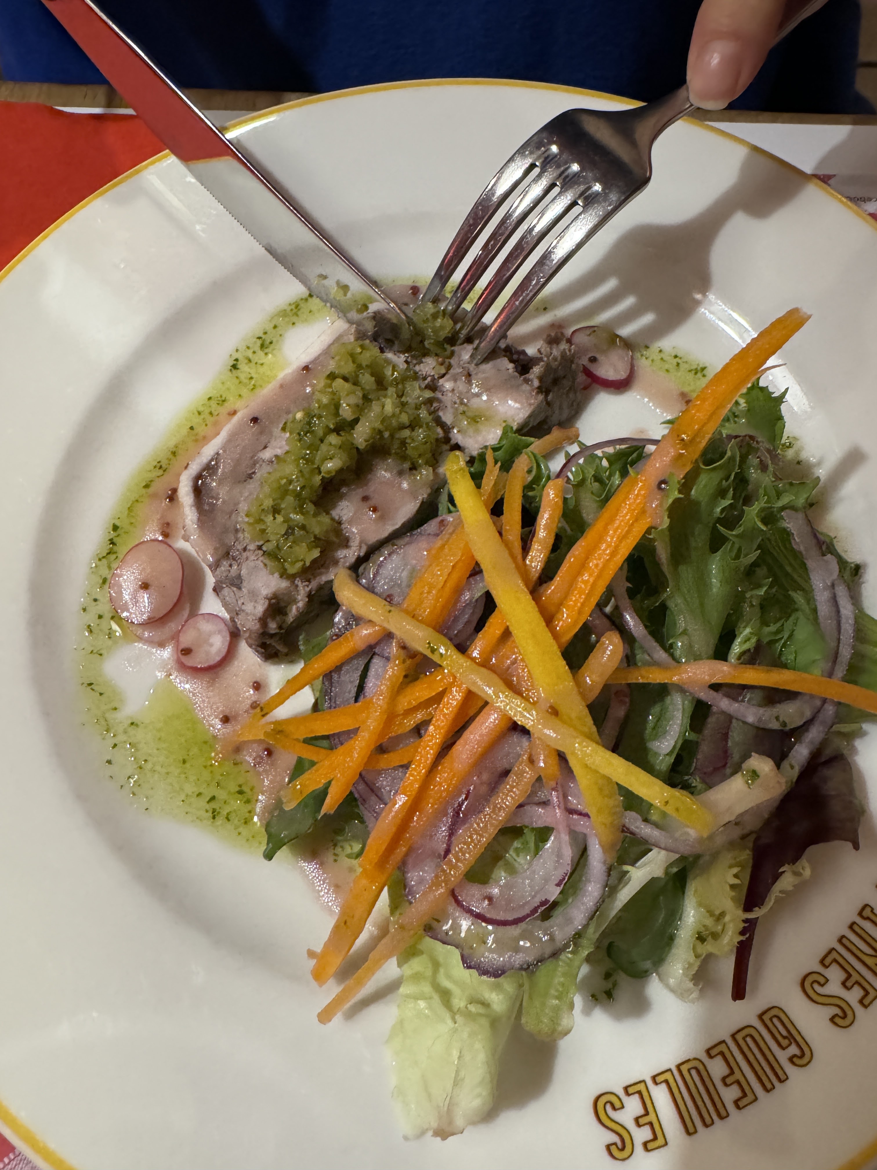 Nous avons découvert Les Fines Gueules le weekend de l'Ascension comme Lyon d'ailleurs. Enchantés par le cadre, l'accueil et les plats !! Pour nous salade lyonnaise, oeufs meurette (un délice) puis pied de cochon pané et quenelle de brochet, sans parler de mon baba au rhum. Un régal du début à la fin !!