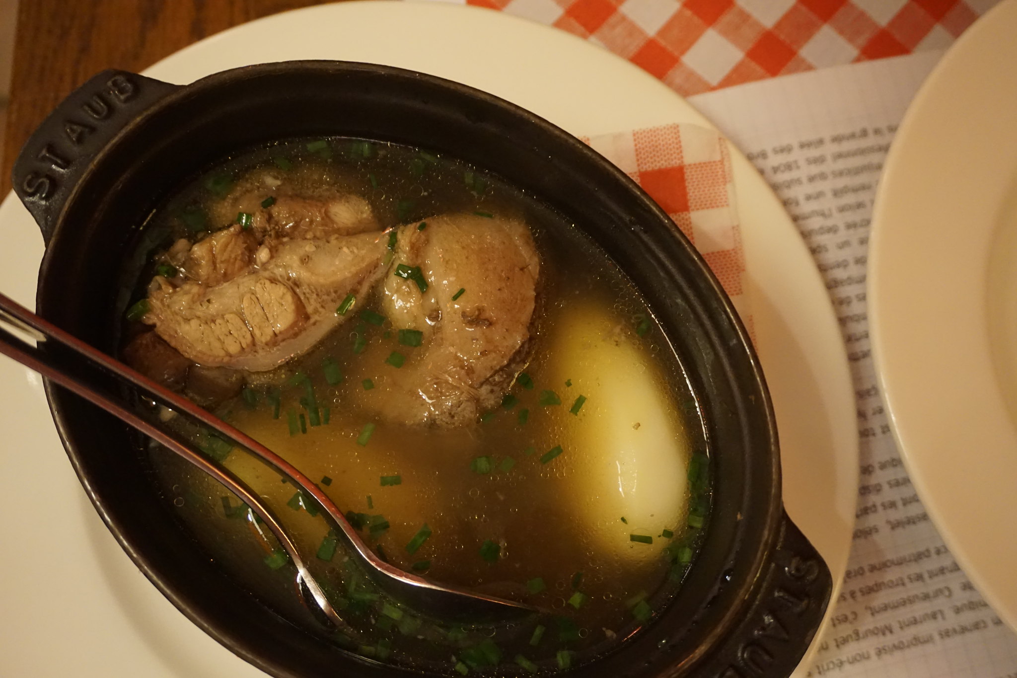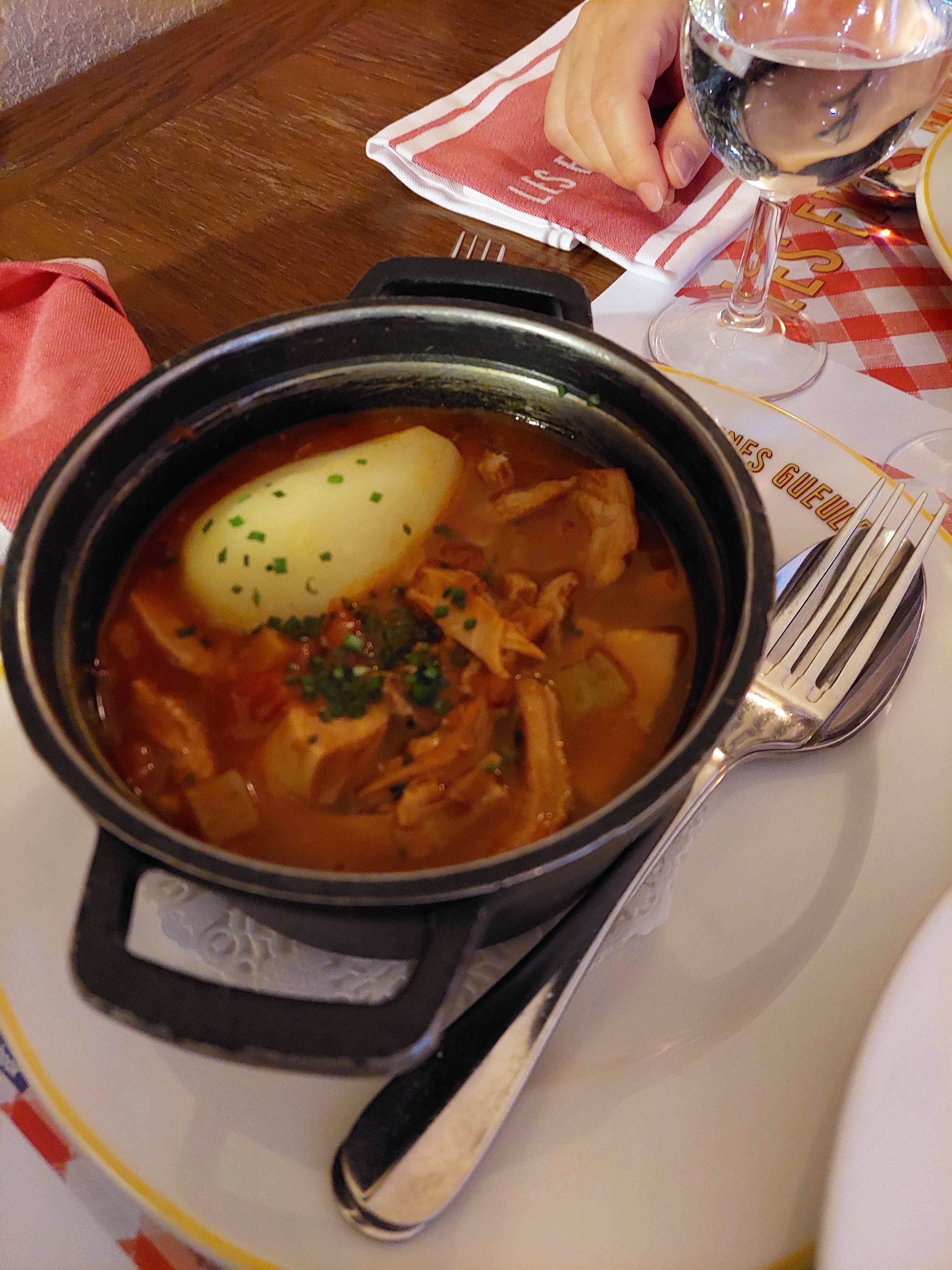 L'accueil très sympathique, le cadre typique d'un bouchon lyonnais. La terrine de queue de boeuf en entrée est délicieuse, les pieds de porc très bien préparés mais l'accompagnement (purée de patate douce) peu en accord. Personnellement, j'aurais préféré un gratin dauphinois ou des haricots verts certes plus classiques mais plus raccord avec l'esprit du plat. La tarte au praline conclut le menu en douceur. Typique et bien réalisé.