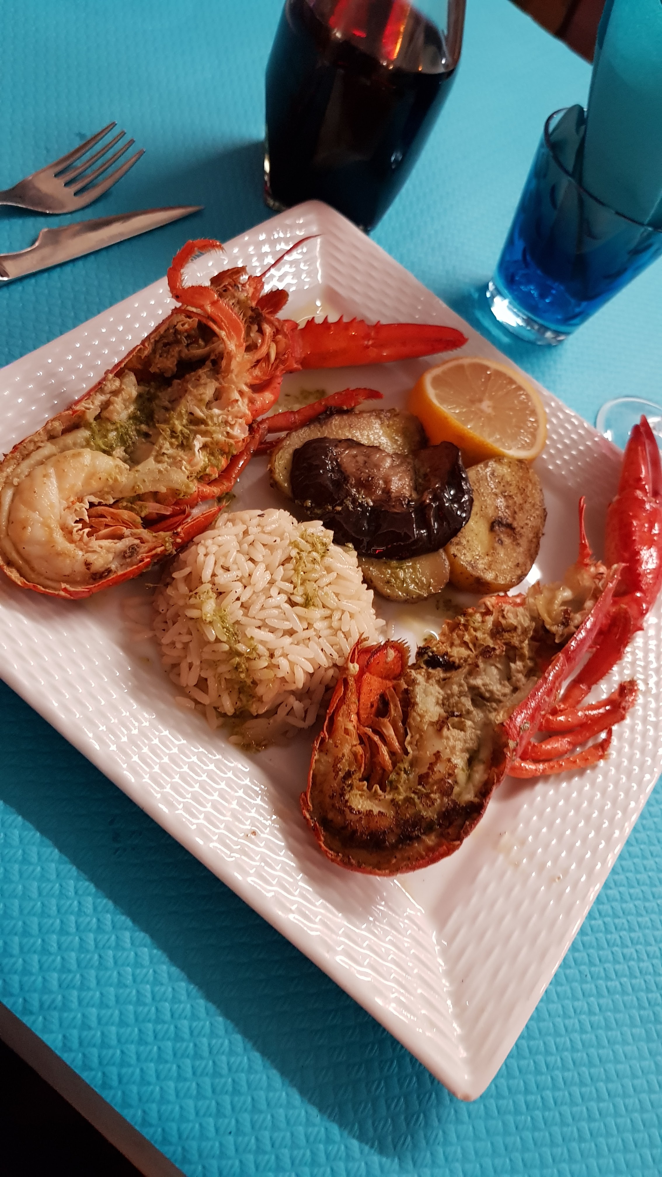 Hommard Entier. Bon mais pas tres gros, servis avec deux feculents et une petite rondelle d'aubergine. Je reste sur ma faim...