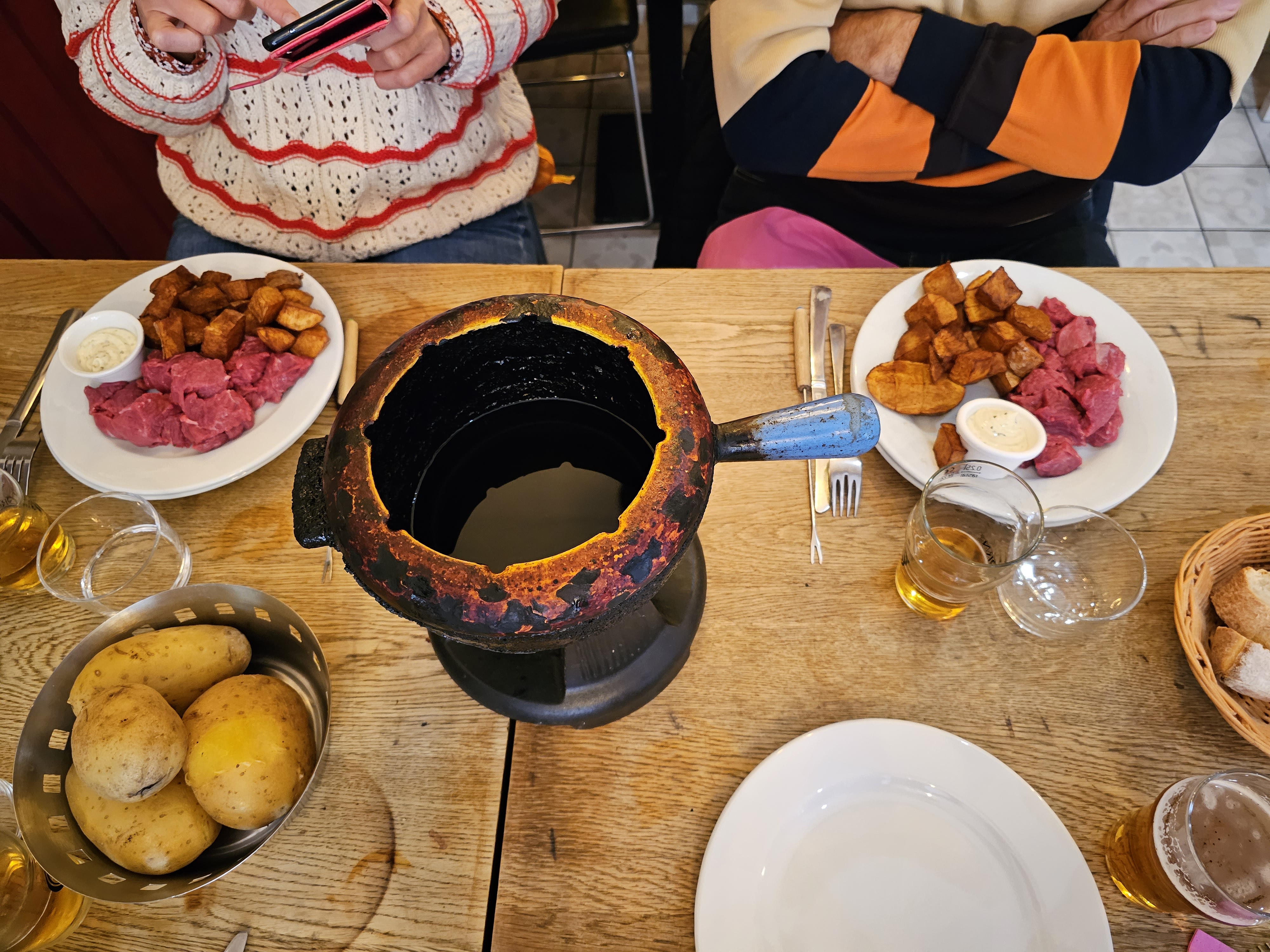 La fondue n'était pas... fondue. Grumeleuse. Elle ne filait pas. Aligot n'était pas maison de toute évidence mais la saucisse correcte et pas trop salée