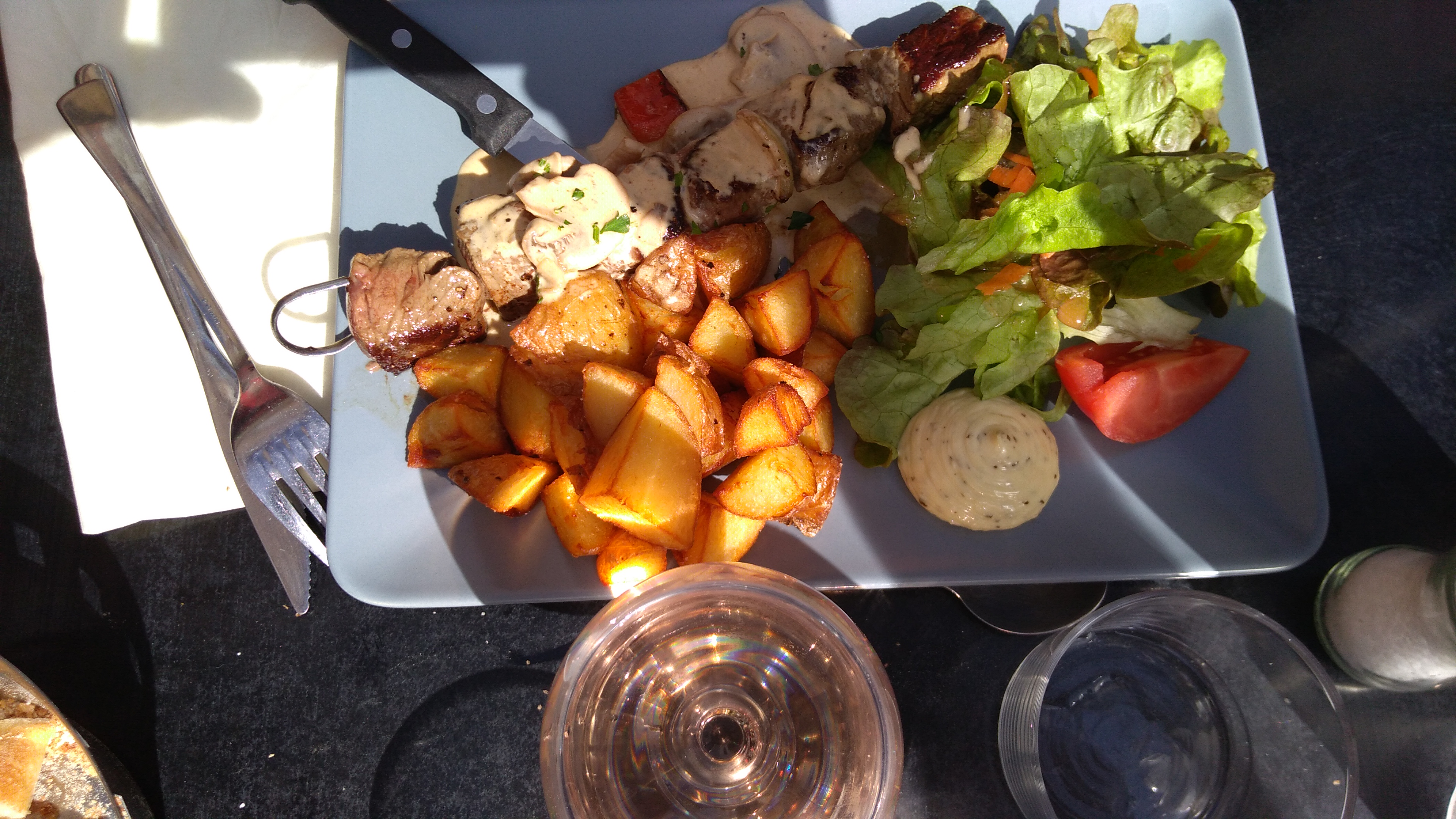 Nous avons été pris en charge très vite en terrasse, mon ami demande une fondue mais ils ne les font pas en terrasse. Soit, il commande autre chose, mais ça non plus ça n’y est pas ce soir là. Dommage, il se replie sur un plat basique. Néanmoins les plats étaient plutôt bons si l’on veut manger simplement.
