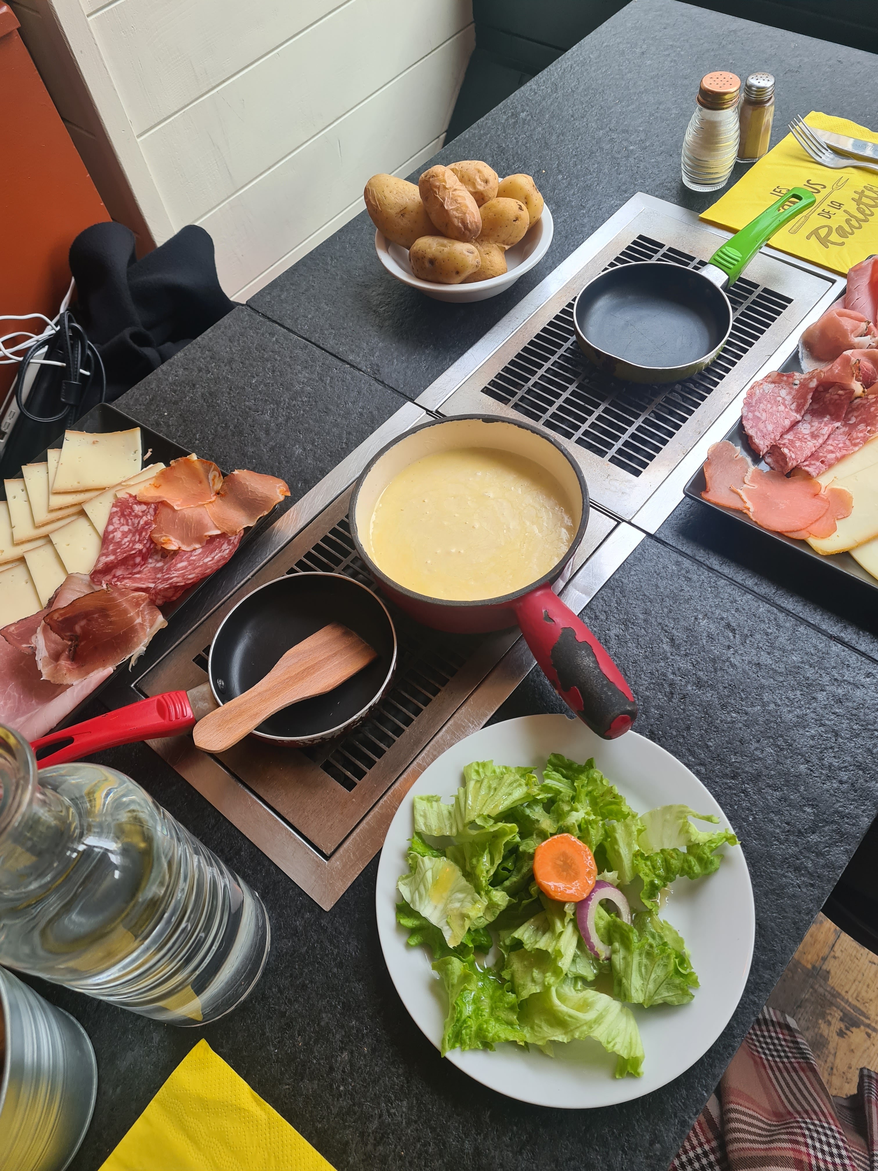 Nous avons pris une raclette à volonté, maigre en charcuterie. Le service laissait à désirer, c’est dommage vu le prix. Le service est très rapide, à peine 3 minutes assis et nous sommes déjà servis. Cela peut être positif dans certains cas, mais dans celui ci, cela est un peu trop et fait ressentir aux personnes l’envie d’aller trop vite alors que le but est de passer un bon moment sans stresser par rapport au temps. La personne au bar et qui accueille est bien.