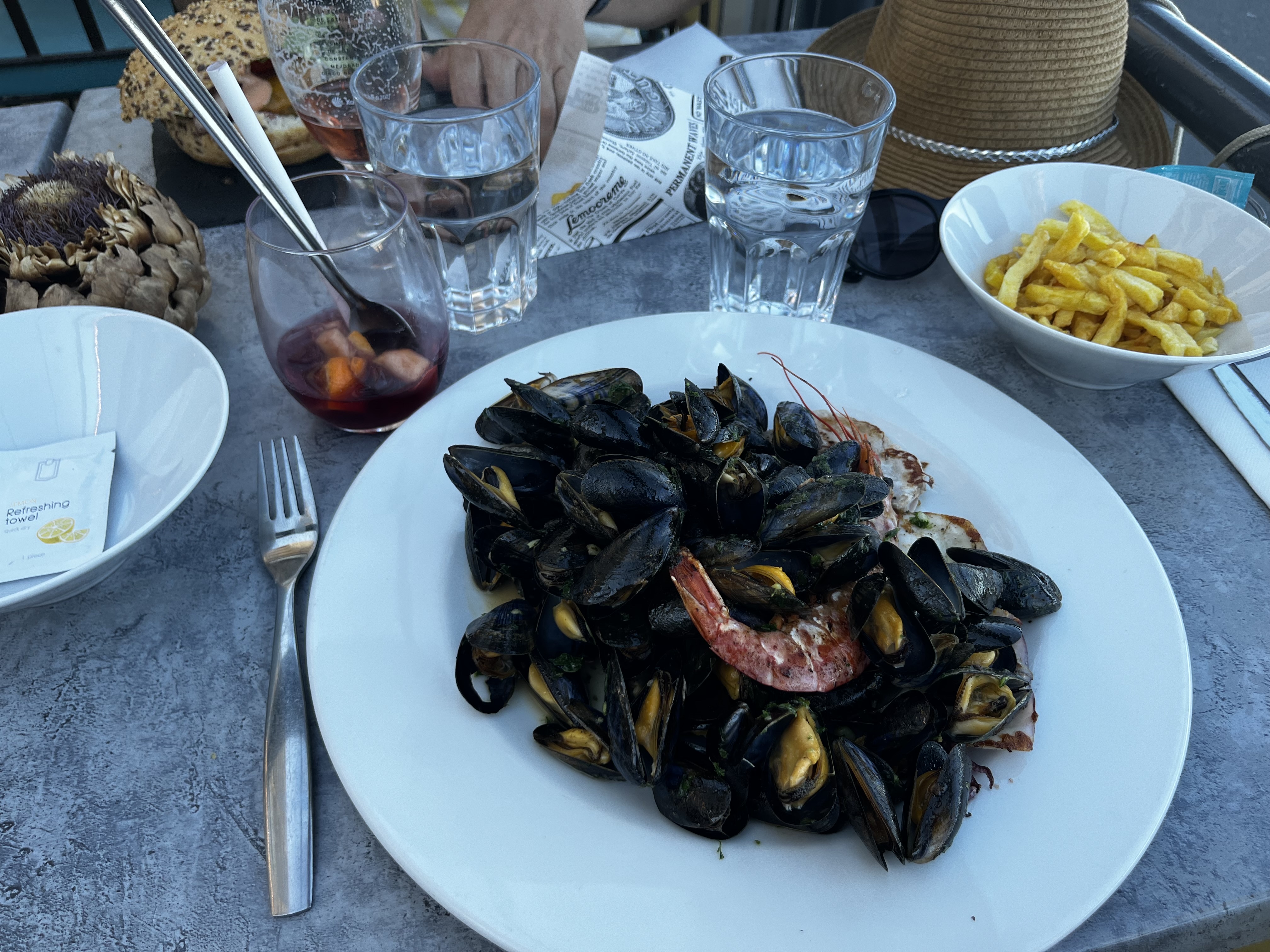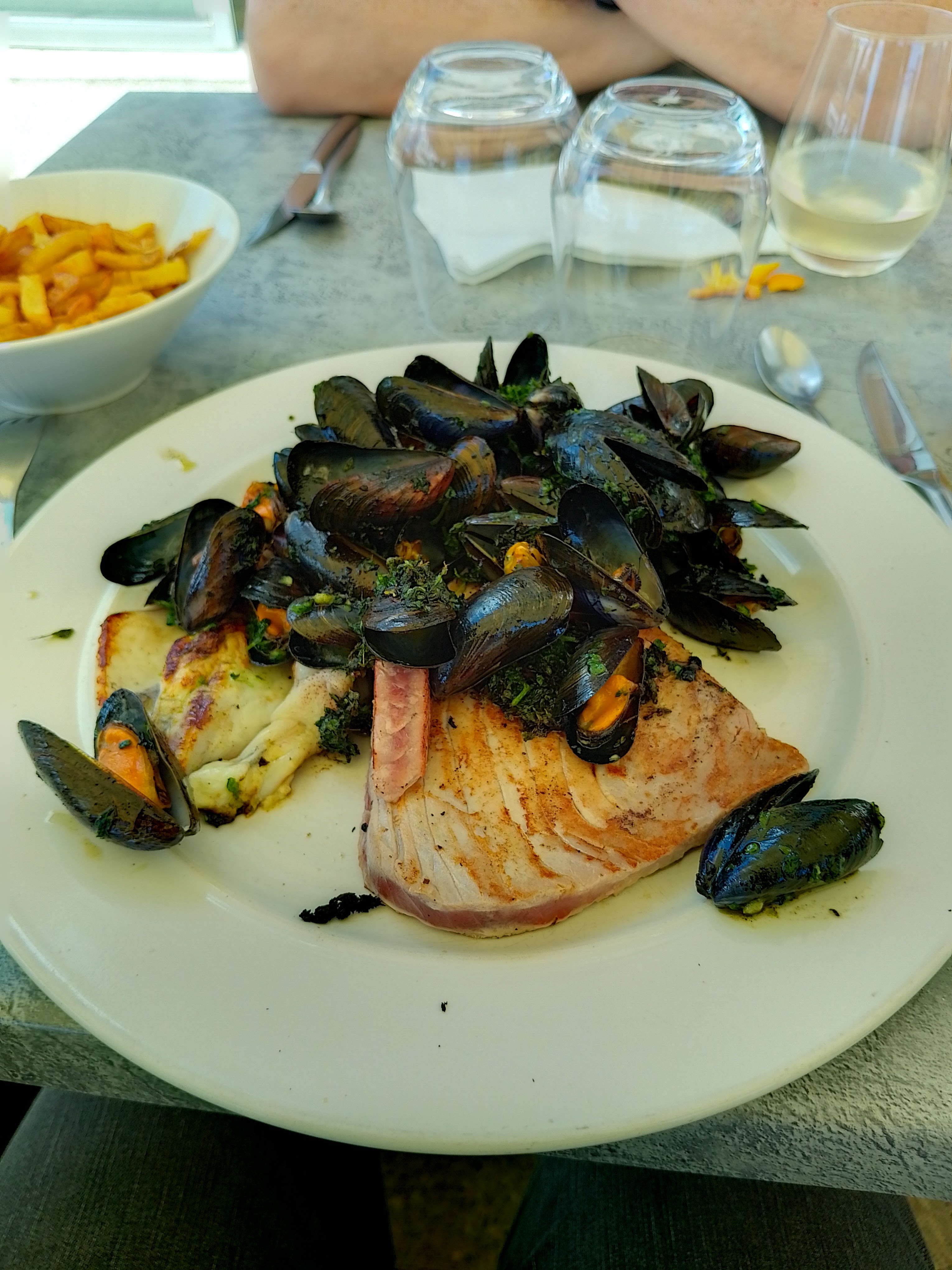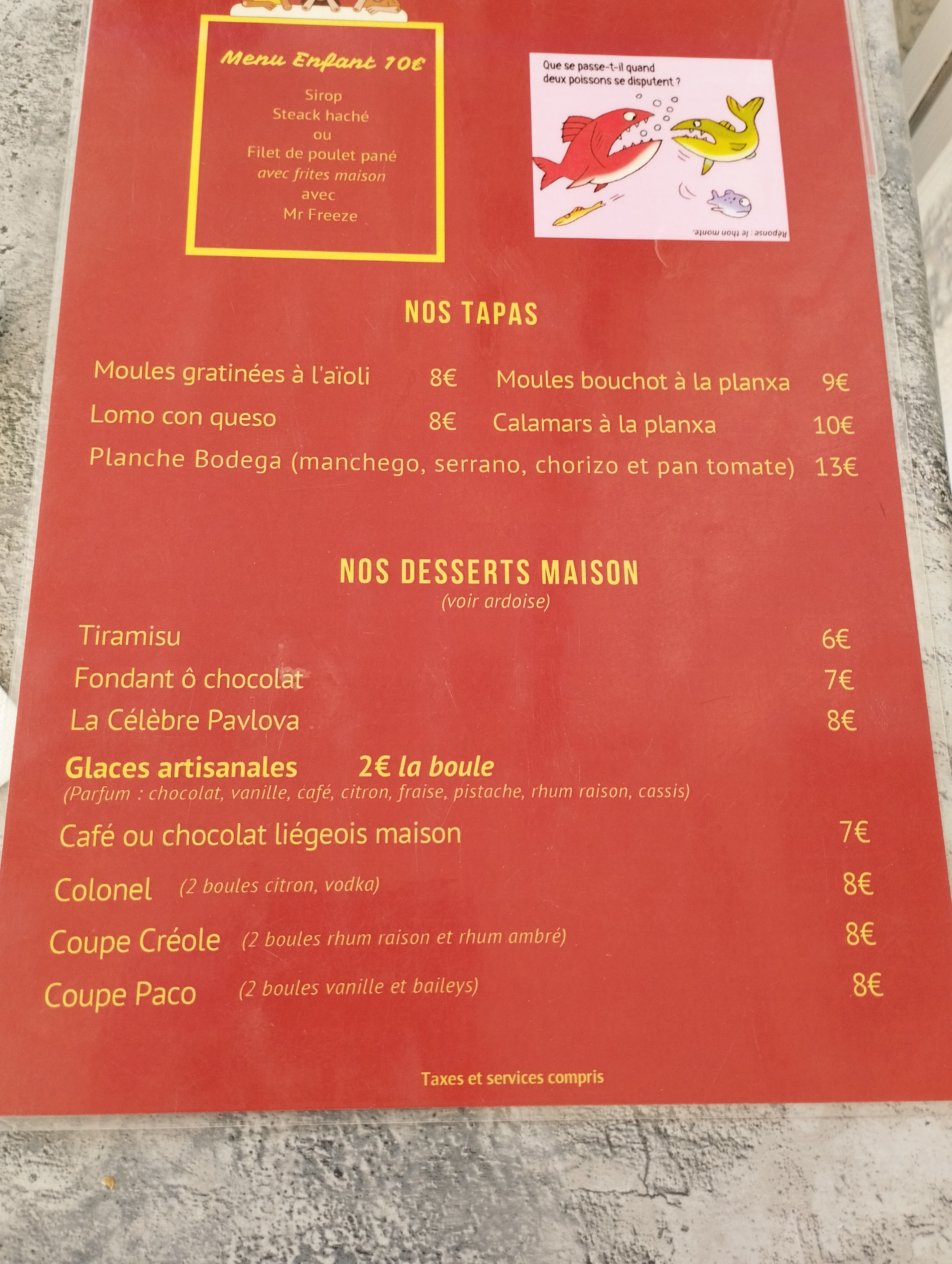 J’ai pris une assiette de la mer le prix est un peu élevé (21€) mais les moules étaient vraiment super bonnes, fondantes comme du beurre. Gambas très bonne aussi. Le calamar un peu sableux et le poisson était moins à mon goût. Accueil très chaleureux.