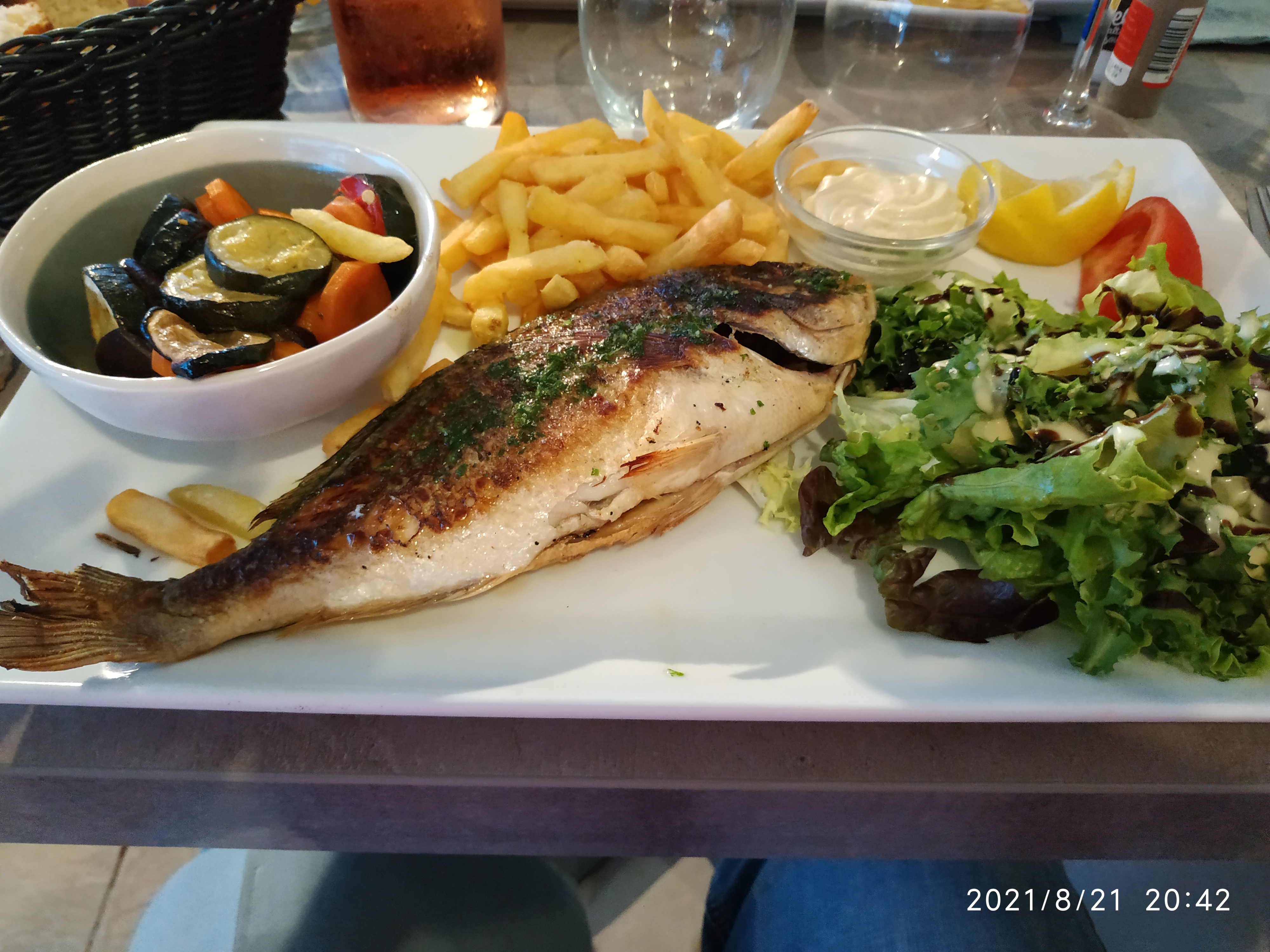 Pas mal, mais c'est une brasserie pas un restaurant. On a tous pris du poisson du jour, certains de la dorade d'autres du loup. Servi avec des frites. Menu enfant steak haché frites. En dessert glace. Il a gentiment accepté de remplacer par une pompote notre fils n'aimant pas le glace.