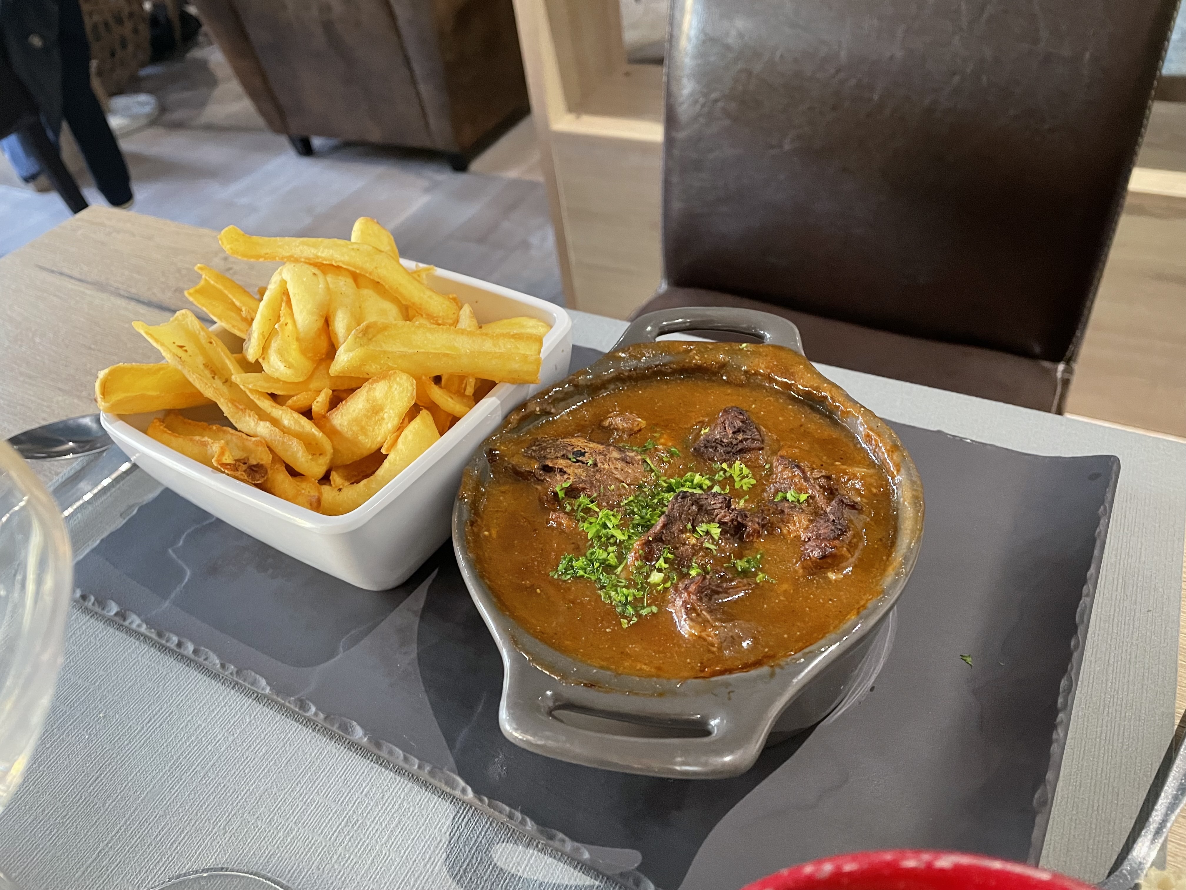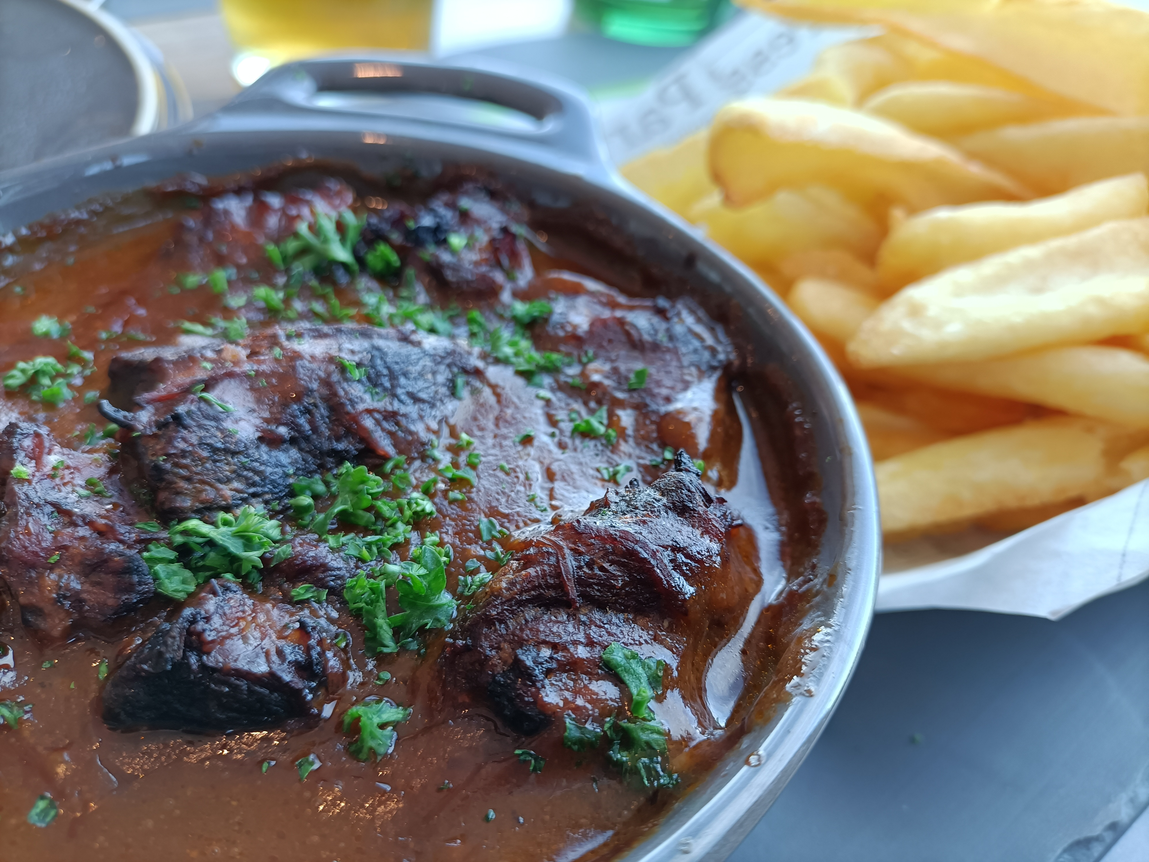 Sur 4 personnes, je suis la seule à ne pas avoir apprécié mon repas. Les menus à 26 euros étaient apparemment très bon mais moi j’ai pris à la carte: assiette bulots crevettes, bulots très petit, poivrés et durs. Moules frites insipides , moules peu goûteuses et frites trop grosses donc peu goûteuses. Café gourmand ? Une glace avec des raisins, une crème à la pistache et un petit morceau de cake à la banane