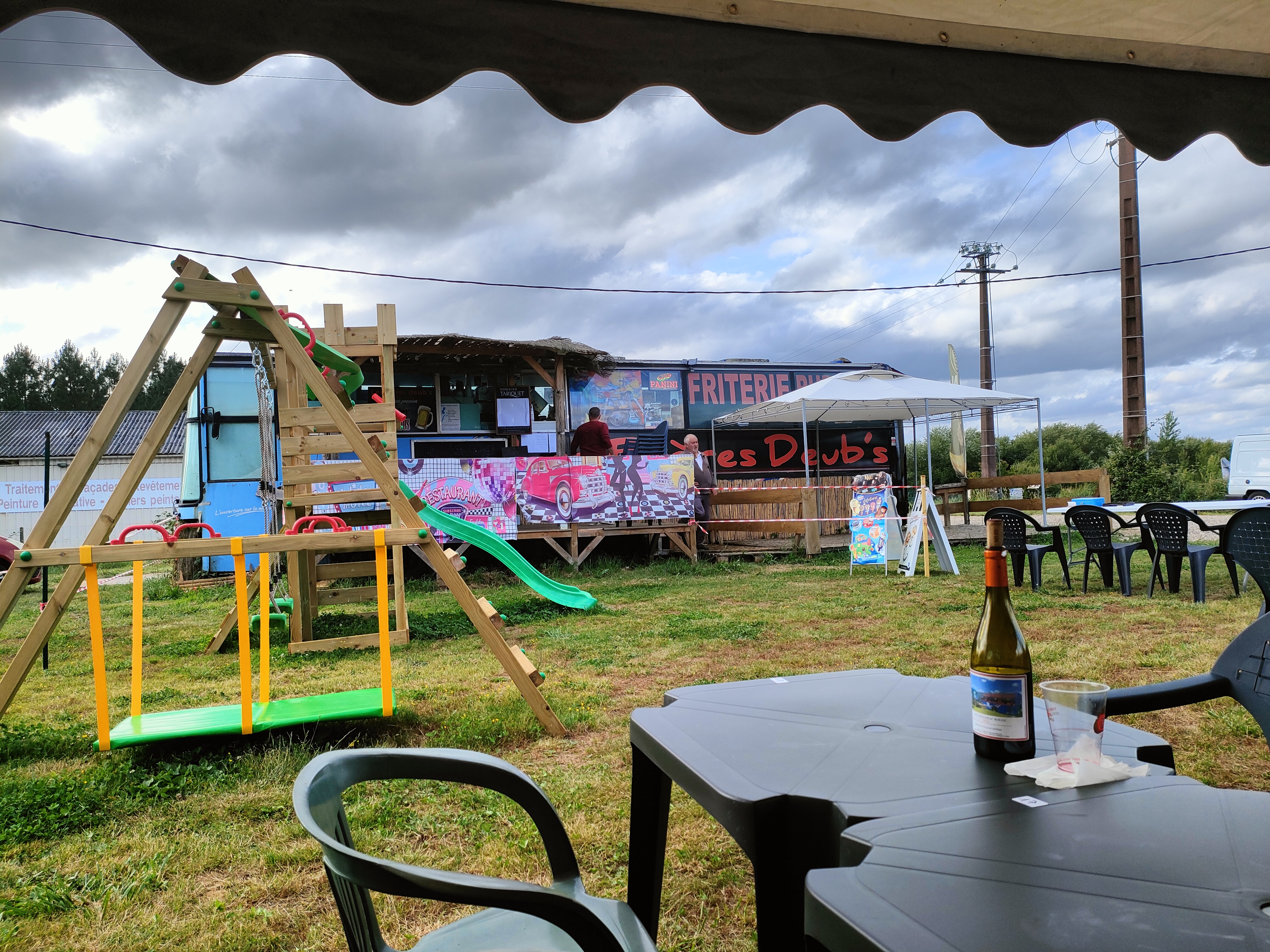 Bus friterie, hamburger, grillade, bière pression, boissons fraîches... Le tout fait maison avec des produits frais. Steaks du coin, nuggets maisons, légumes maraîcher local ( frites maison cuiteS dans la graisse de canard). Table appoint pour manger au soleil. Parfait.