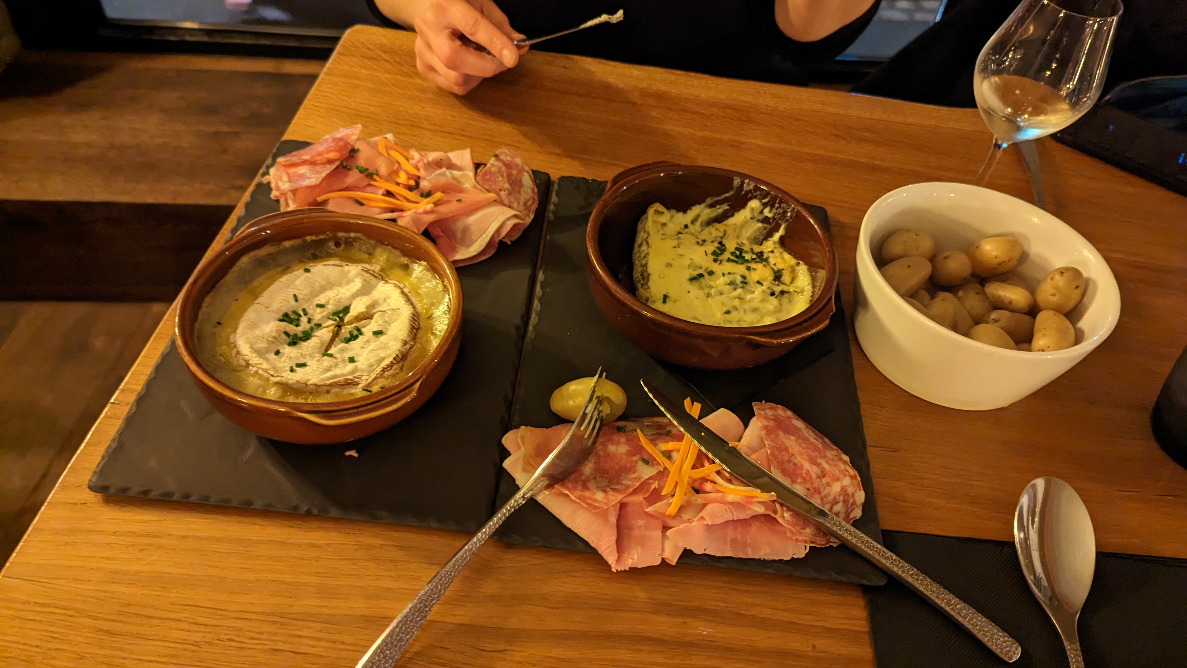 Nous sommes venus pour manger une raclette… Le seul point positif concerne le service, c’est tout. Pour le reste très déçu par la qualité et la quantité ! Si seulement la qualité était au rendez vous, on aurait peut-être moins été exigeant sur la quantité. Clairement niveau fromage très peu de goût. Notamment pour le morbier, qui était fade. C’est rare de manger un morbier sans goût… j’ai un doute sur la provenance du fromage (je pense de la grande distribution). nous sommes repartis le ventre vide. Les pommes de terres étaient tellement petite, c’était des grenailles (cf photo). Les assiettes minuscules puis appareil à raclette de premier prix qui a servi à d’autres personnes avant vous sans être nettoyé un minimum. Le vin cher pour ce que c’est. Franchement si vous avez un appareil à raclette, restez chez vous. Allez voir votre fromager et un caviste, ne venez pas dépenser votre argent ici pour manger une raclette.